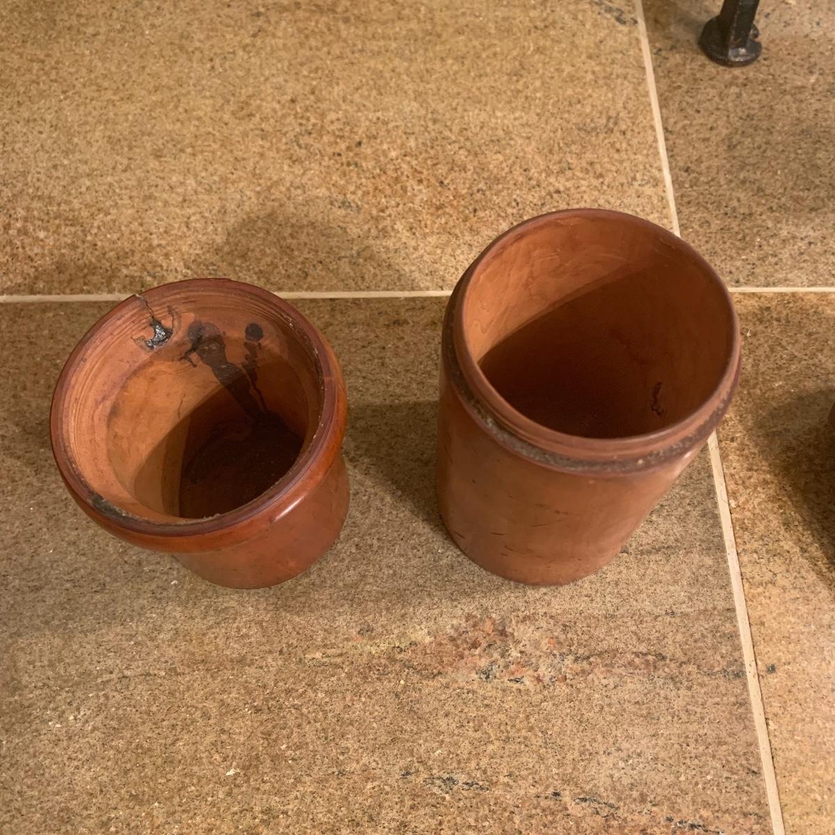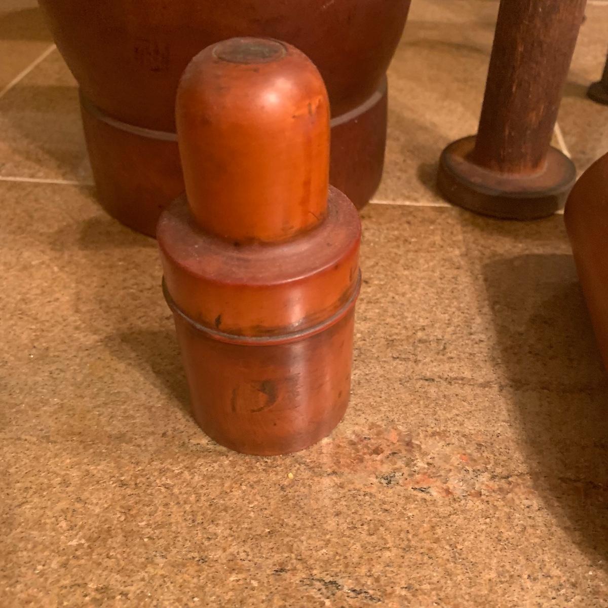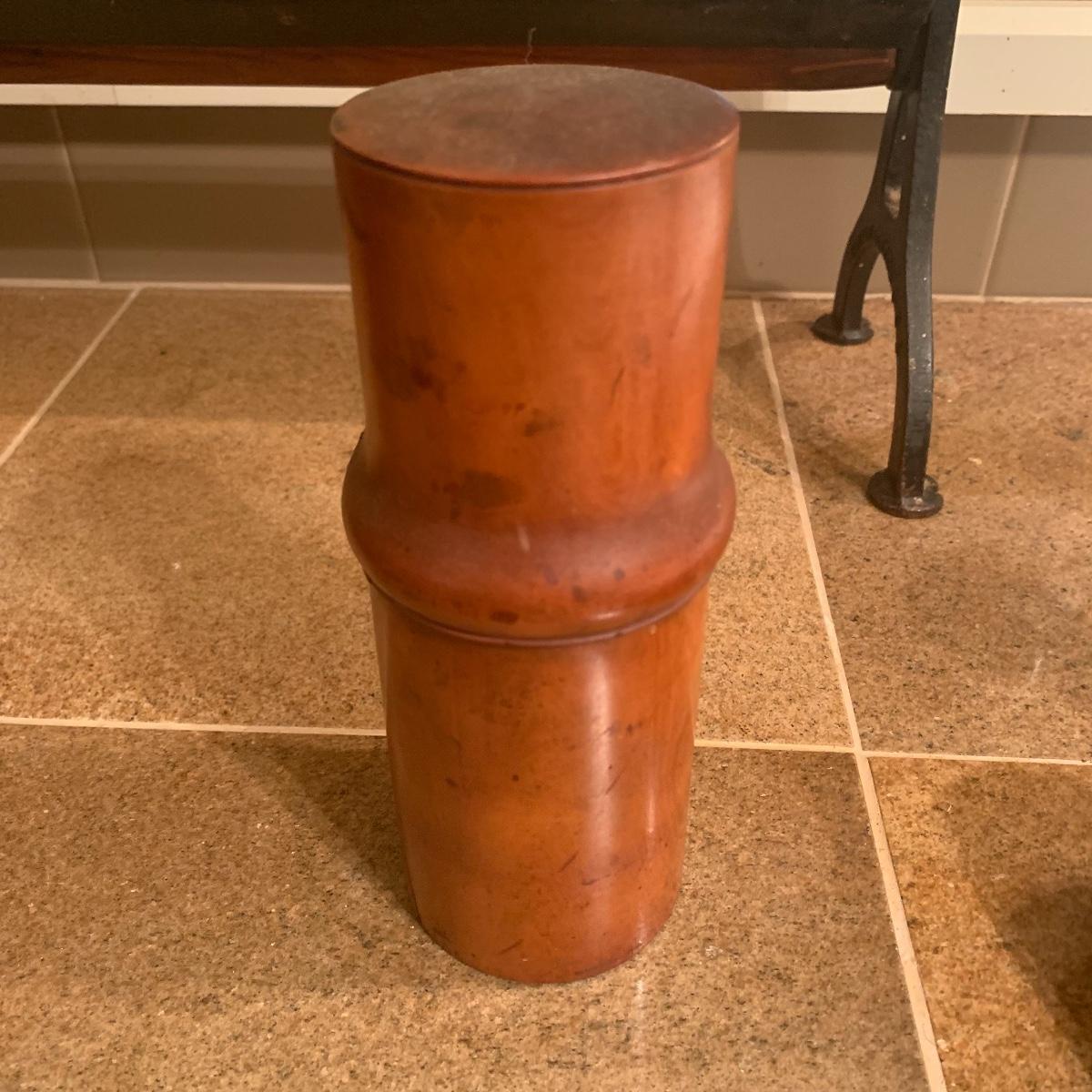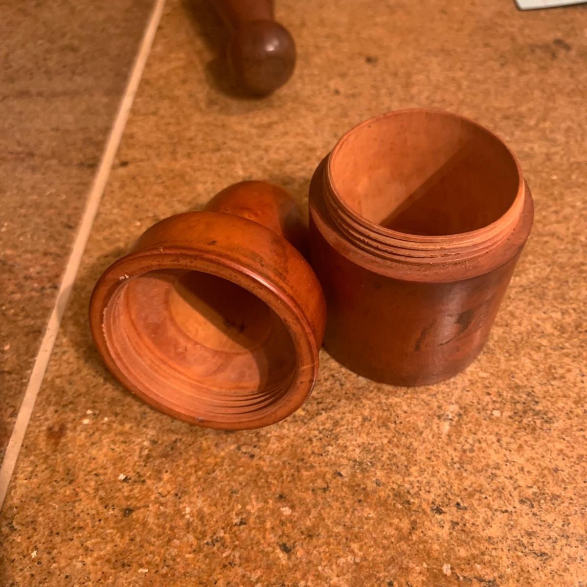 This pair of wooden screw top containers are in good condition. One measures 8” tall, and the other measures 4” tall.