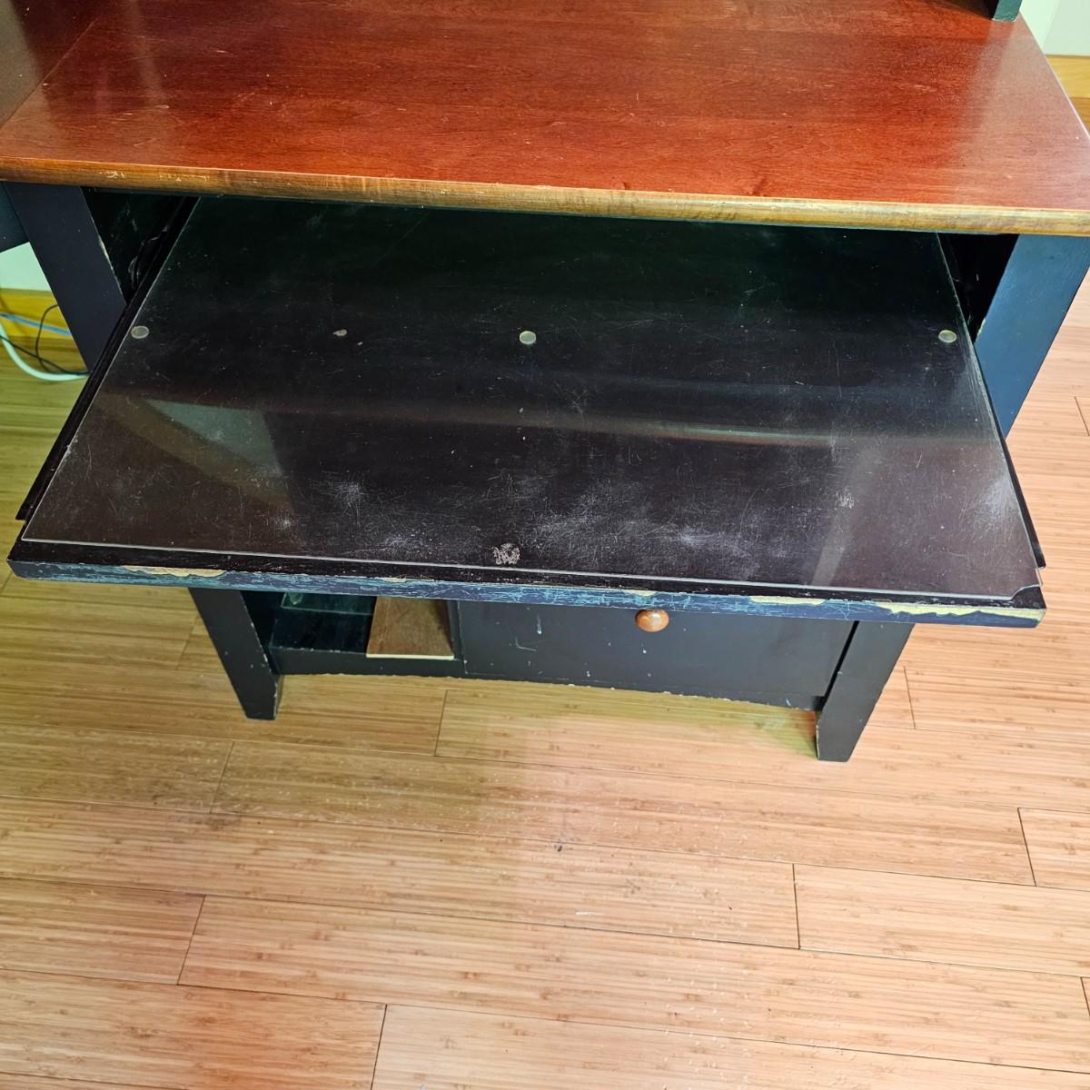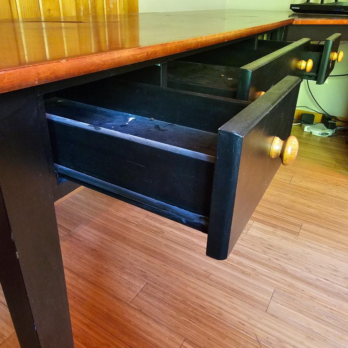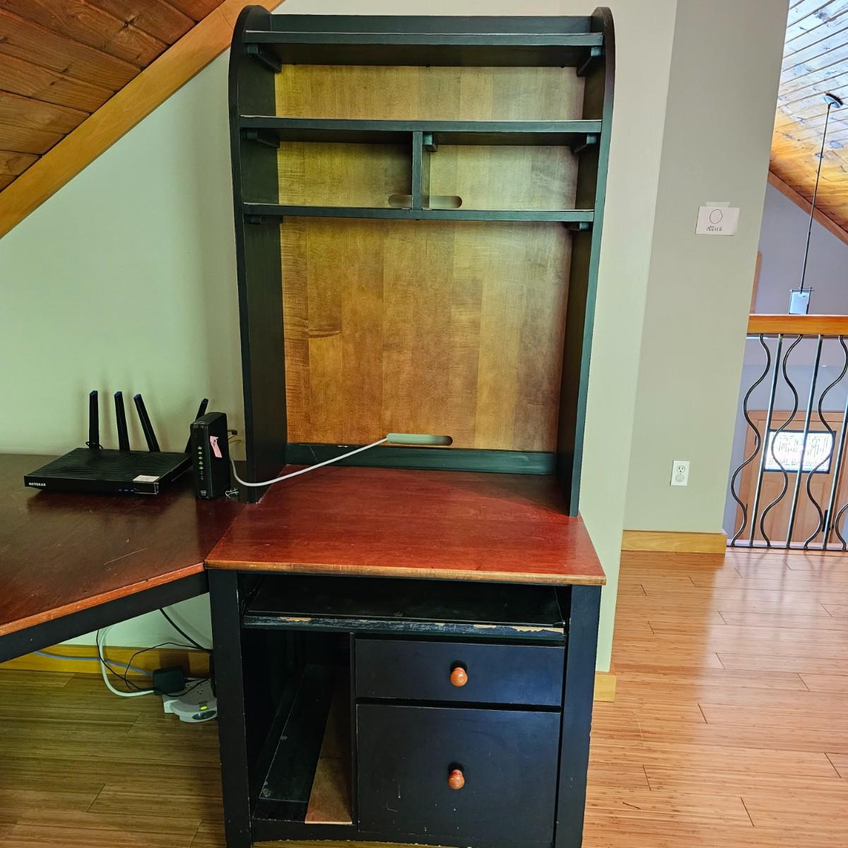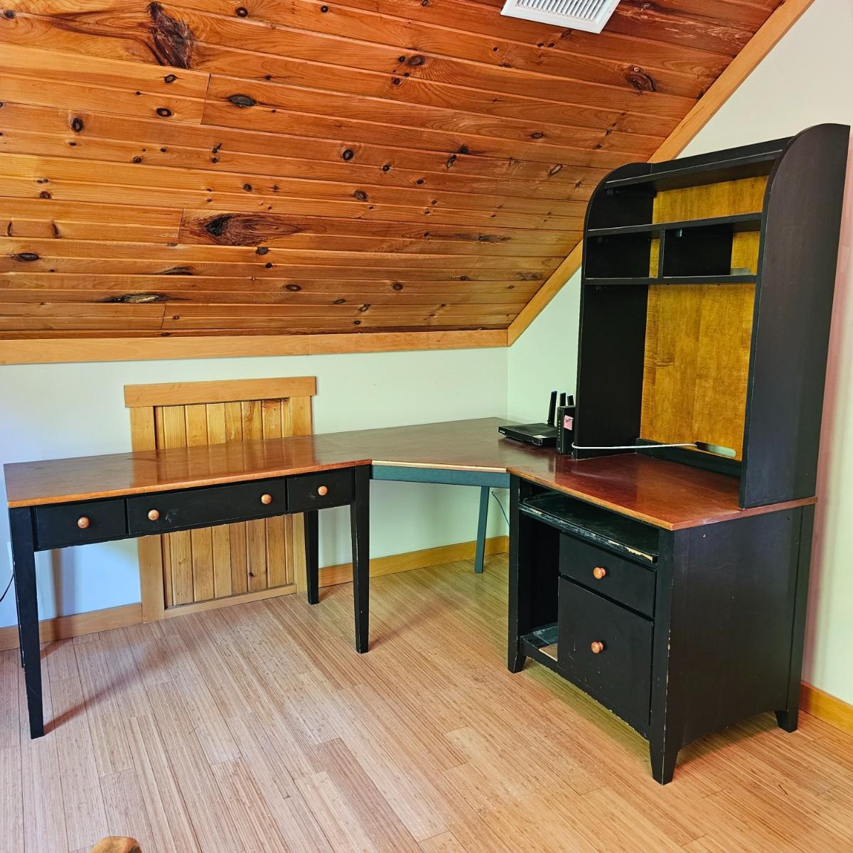 Black/tan wood desk set. Four pieces total. One long desk piece with three drawers, 46" x 24" x 30"H. One corner piece, 38" sq x 30" H. Hutch is two pieces, base is 30" x 24" x 30"H, has two drawers, a pullout keyboard drawer and a spot for a computer tower. Top of hutch is 29.5" x 12" x 42" H. All pieces are fastened together, will need to bring tools to disassemble. Screwdrivers, sockets and/or crescent wrench. See photos for details. Several scuffs and scratches on legs and surfaces. Local pickup only. Winning bidder must bring assistance to help move and load this item due to its weight and/or size. Items are located in upstairs room