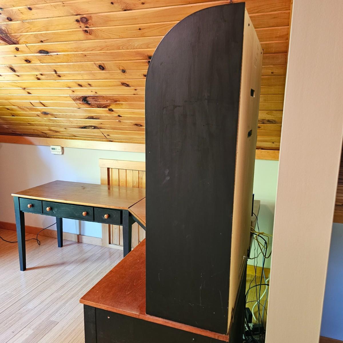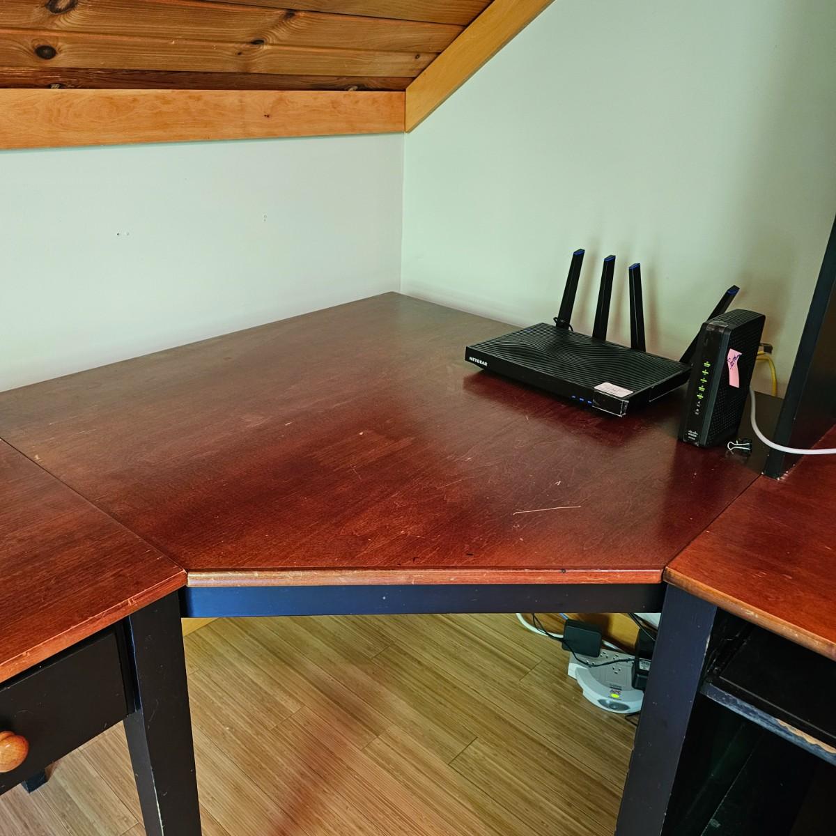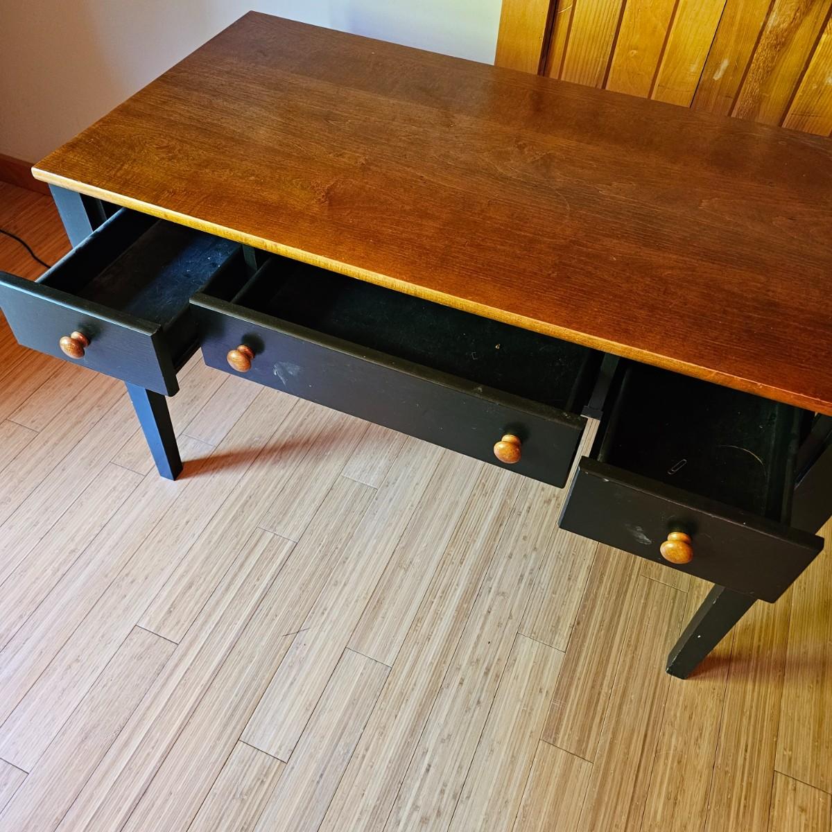 Black/tan wood desk set. Four pieces total. One long desk piece with three drawers, 46" x 24" x 30"H. One corner piece, 38" sq x 30" H. Hutch is two pieces, base is 30" x 24" x 30"H, has two drawers, a pullout keyboard drawer and a spot for a computer tower. Top of hutch is 29.5" x 12" x 42" H. All pieces are fastened together, will need to bring tools to disassemble. Screwdrivers, sockets and/or crescent wrench. See photos for details. Several scuffs and scratches on legs and surfaces. Local pickup only. Winning bidder must bring assistance to help move and load this item due to its weight and/or size. Items are located in upstairs room