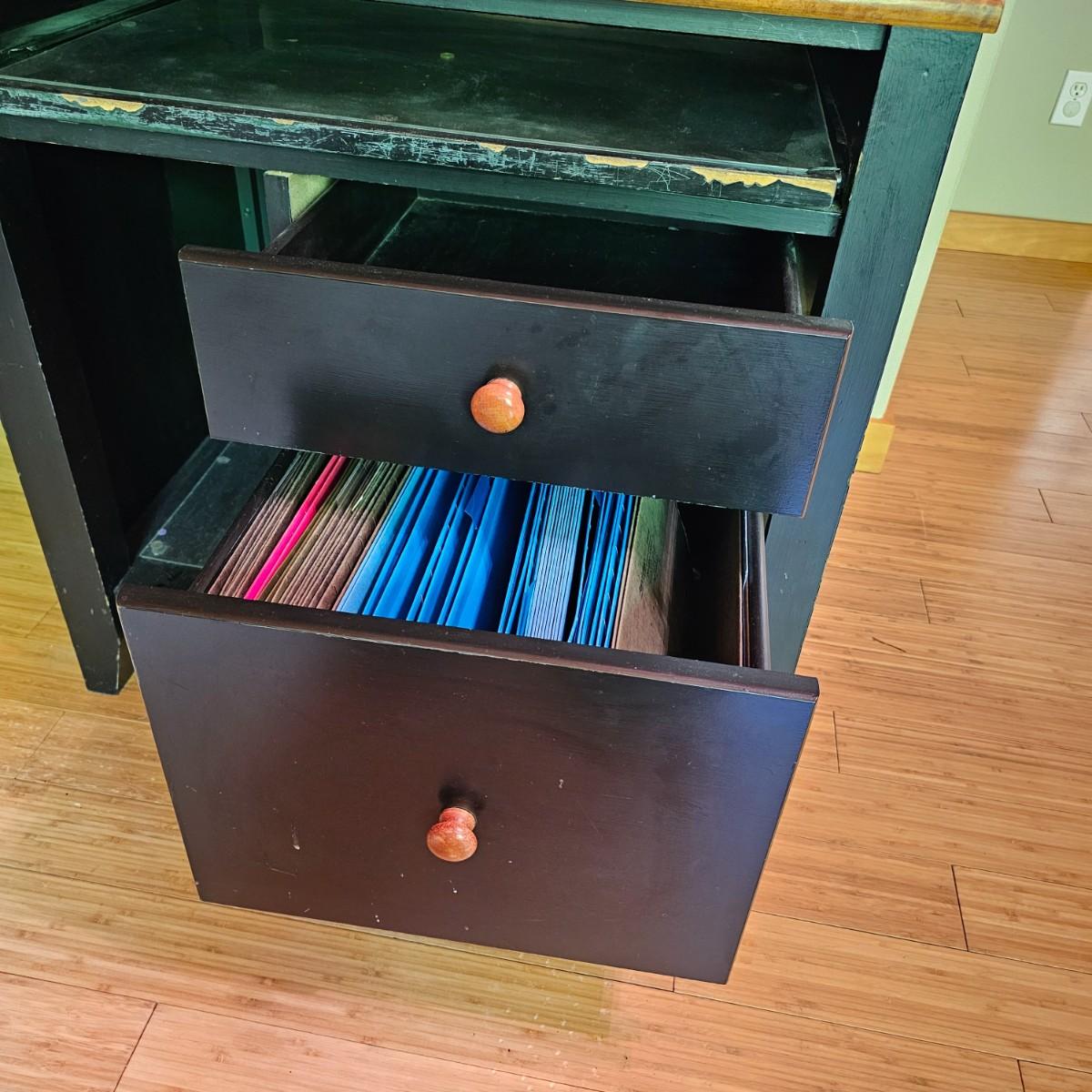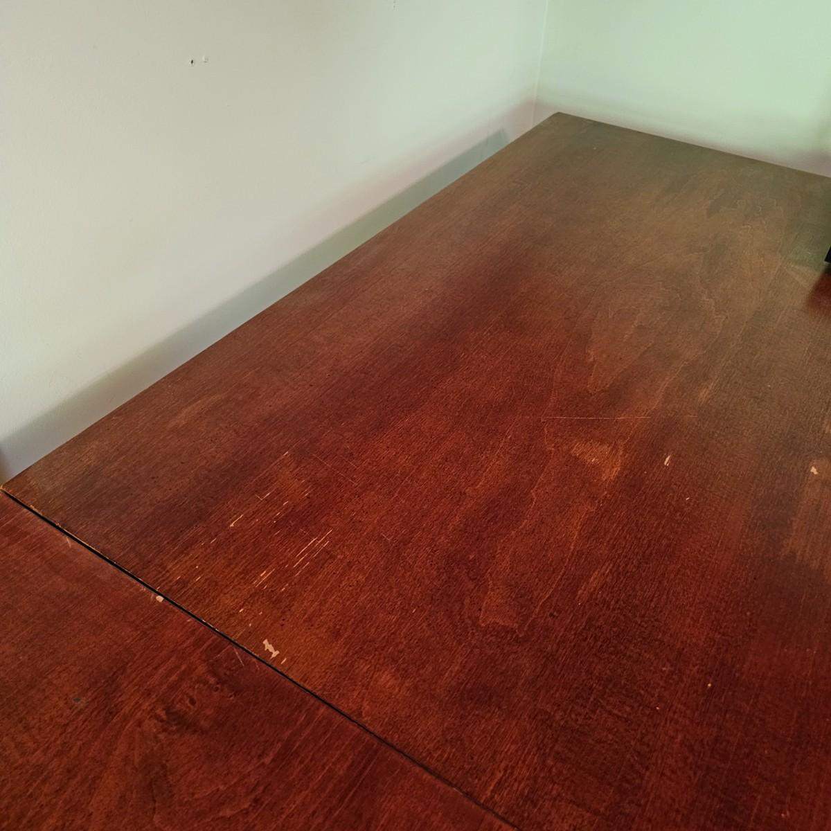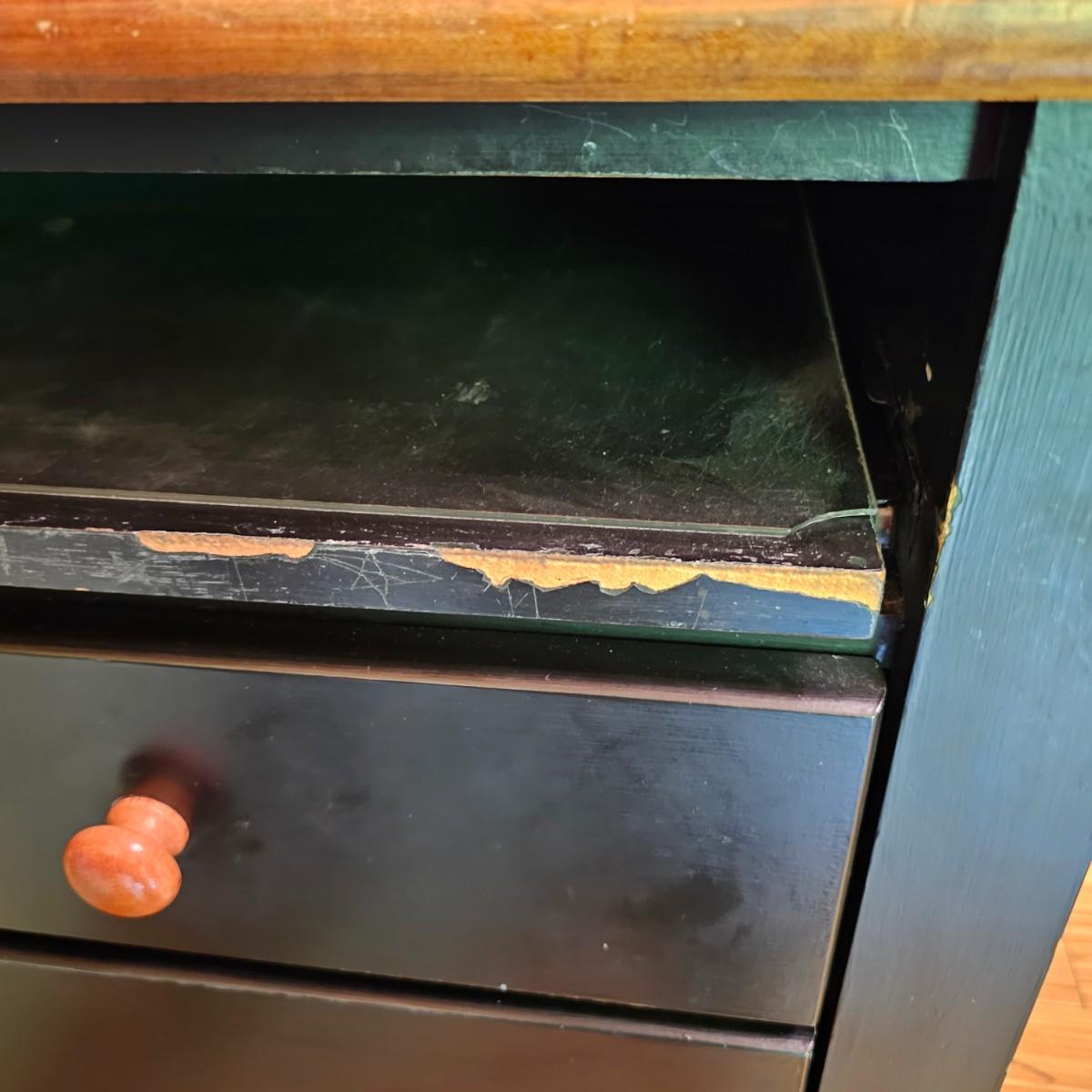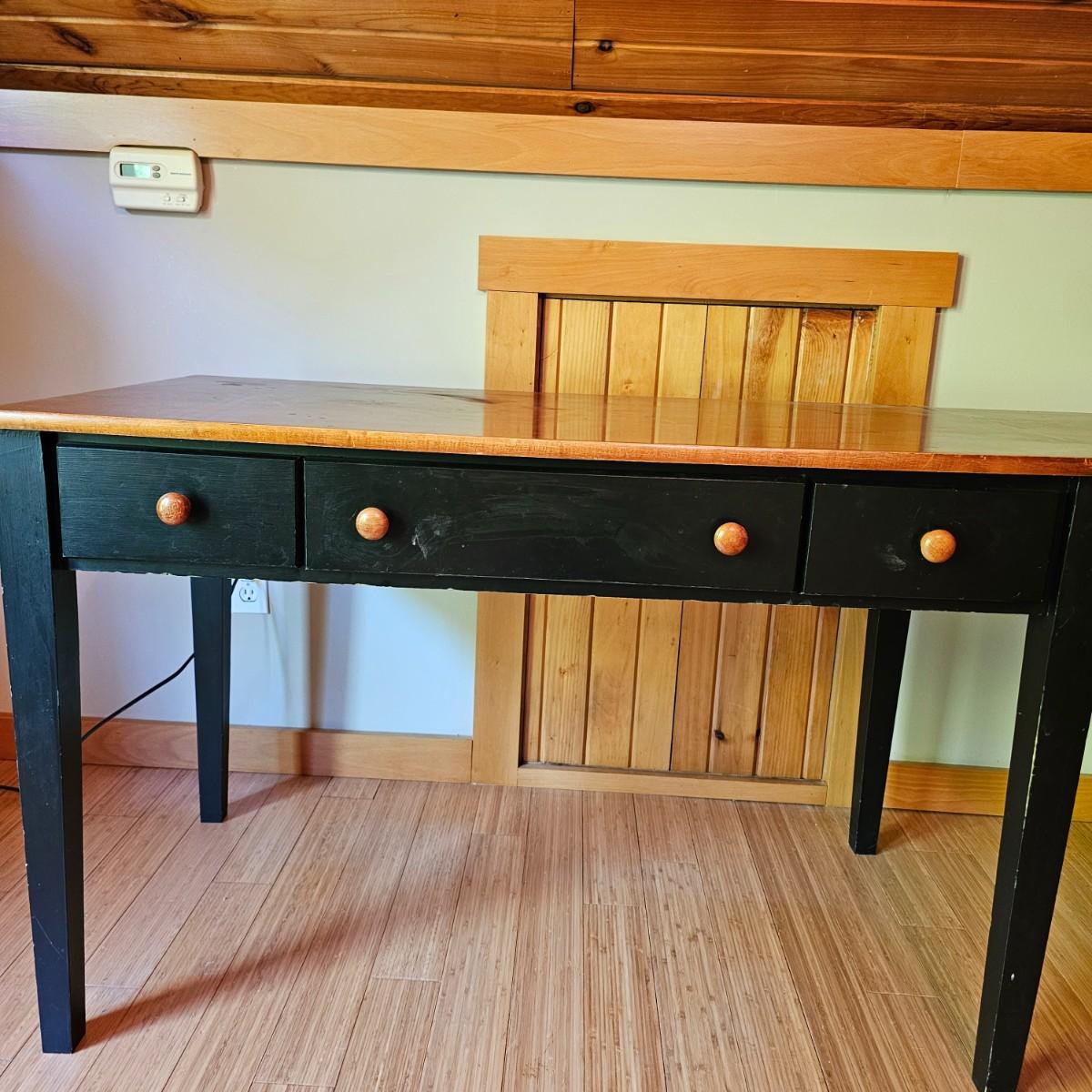 Black/tan wood desk set. Four pieces total. One long desk piece with three drawers, 46" x 24" x 30"H. One corner piece, 38" sq x 30" H. Hutch is two pieces, base is 30" x 24" x 30"H, has two drawers, a pullout keyboard drawer and a spot for a computer tower. Top of hutch is 29.5" x 12" x 42" H. All pieces are fastened together, will need to bring tools to disassemble. Screwdrivers, sockets and/or crescent wrench. See photos for details. Several scuffs and scratches on legs and surfaces. Local pickup only. Winning bidder must bring assistance to help move and load this item due to its weight and/or size. Items are located in upstairs room