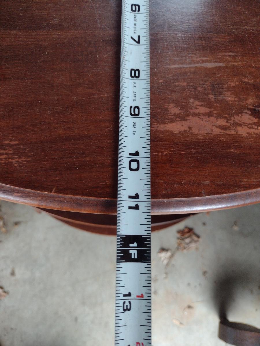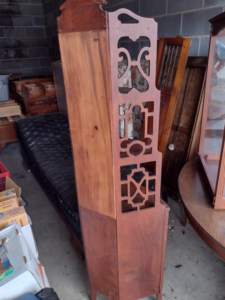Wooden Corner Shelf- Approx 20 3/4" Wide, 11" Deep, 59" Tall. Item has mirrored center.