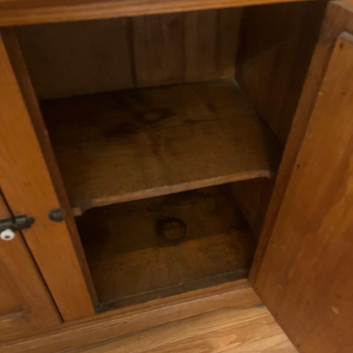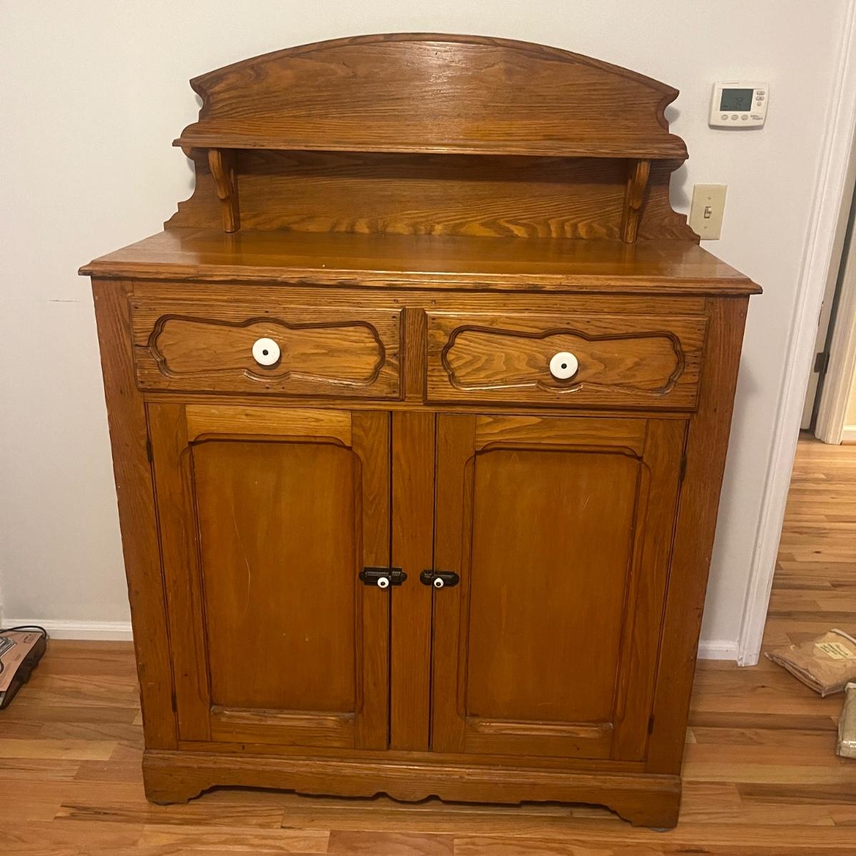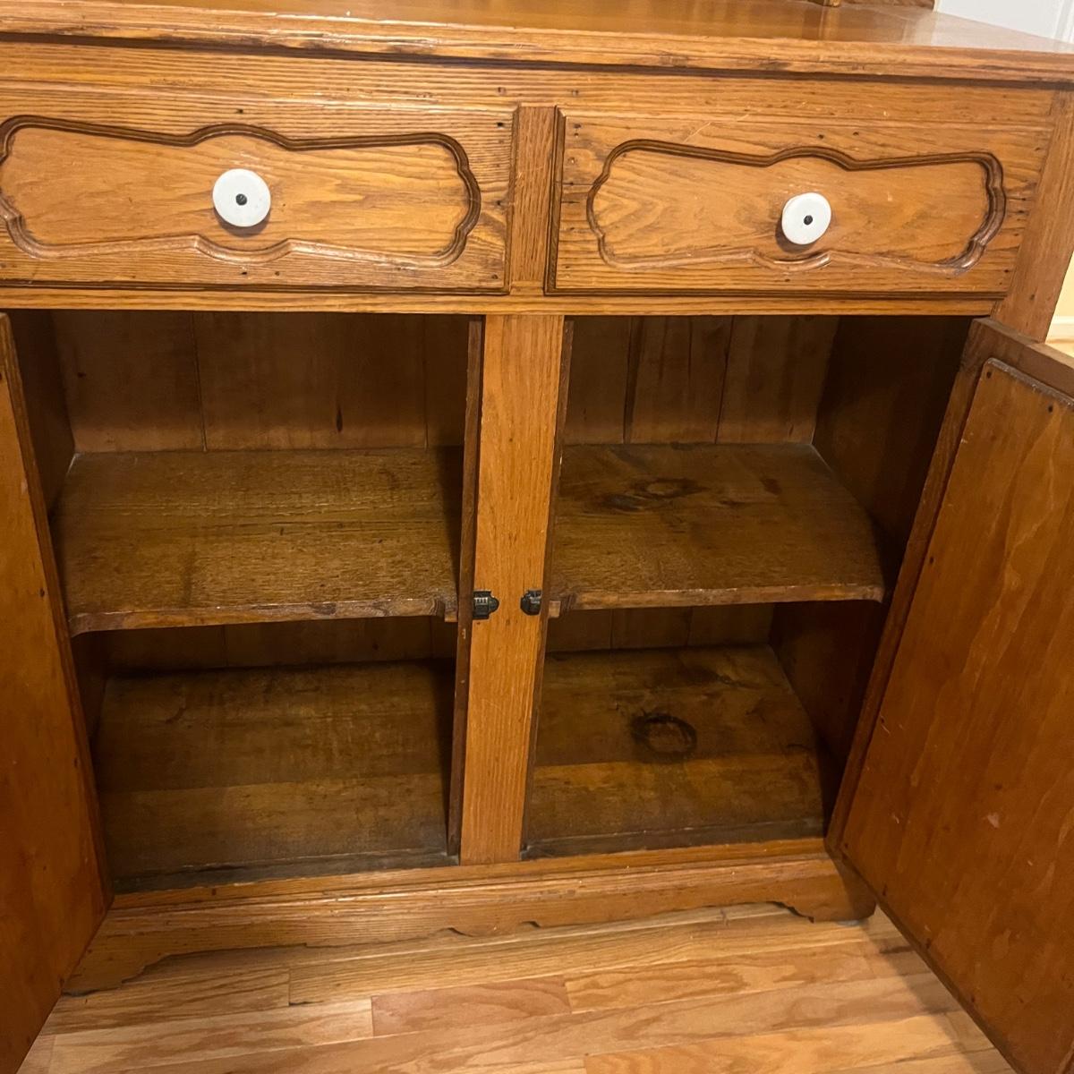 Lot includes a wooden cupboard with two dovetailed drawers with two cabinet doors underneath and a shelf on the top of cupboard. Cupboard measures 43” x 18” x 58”H.