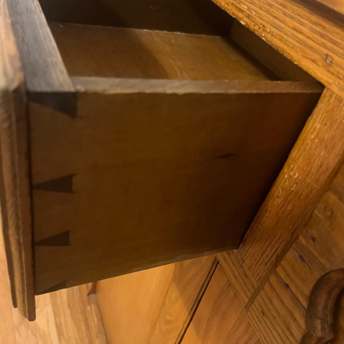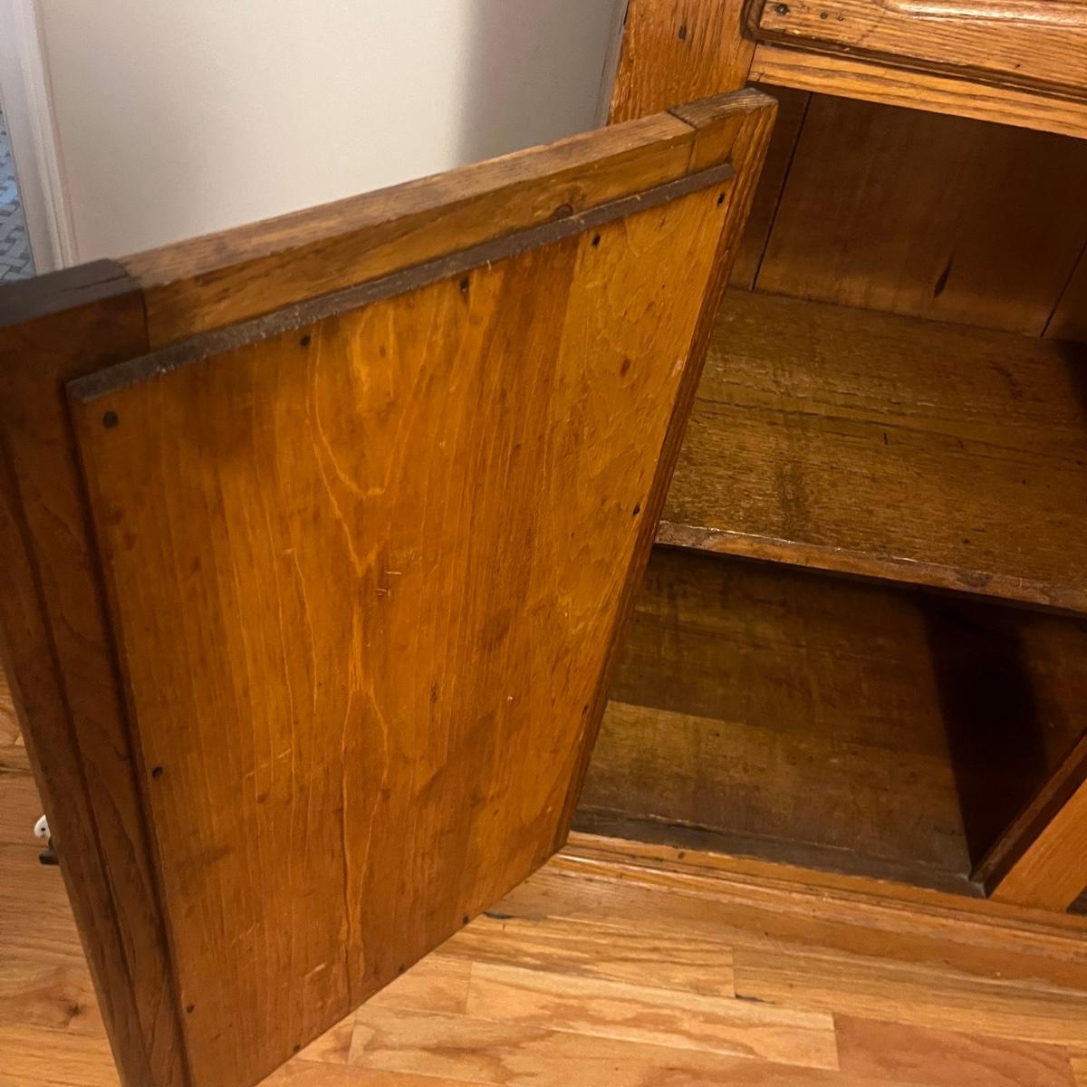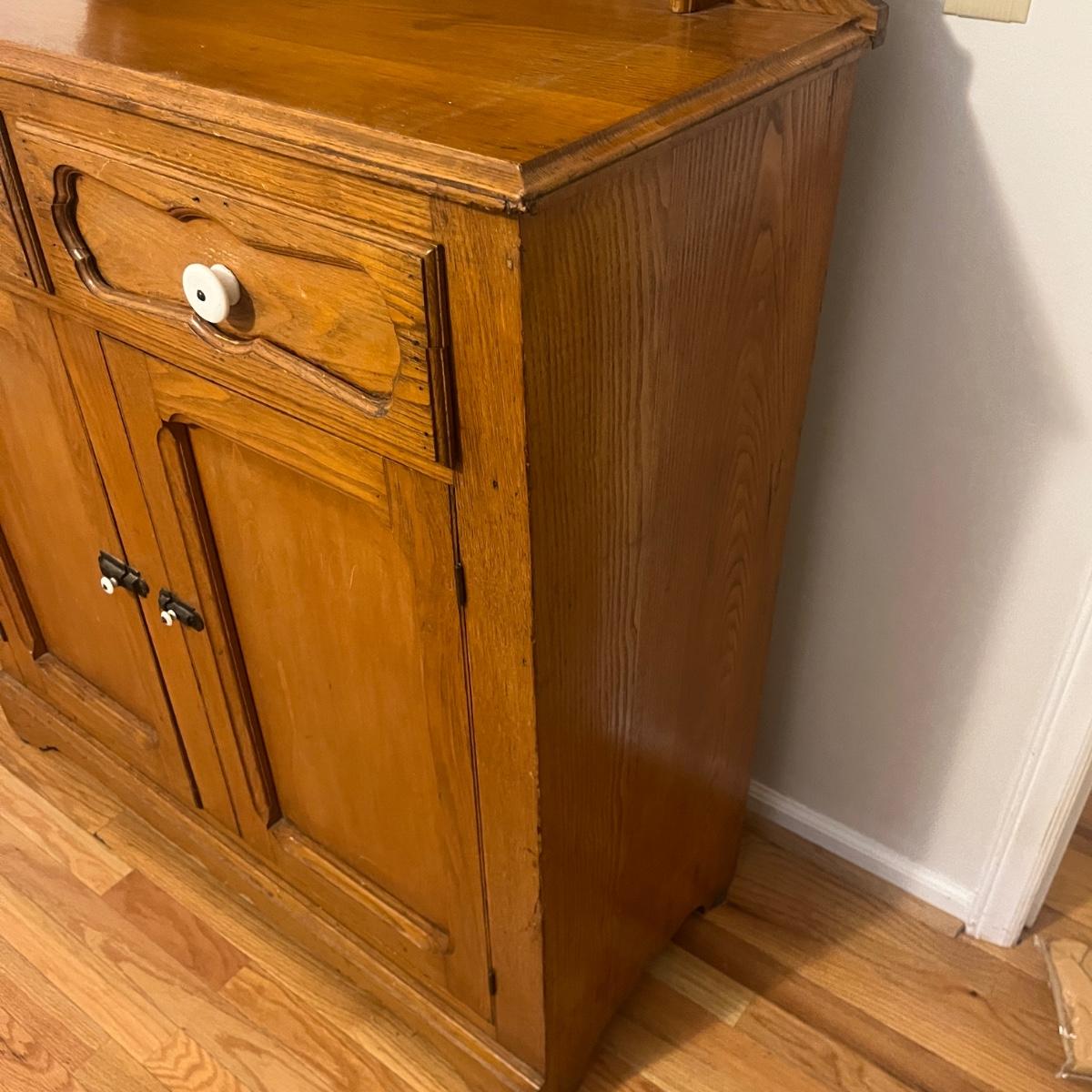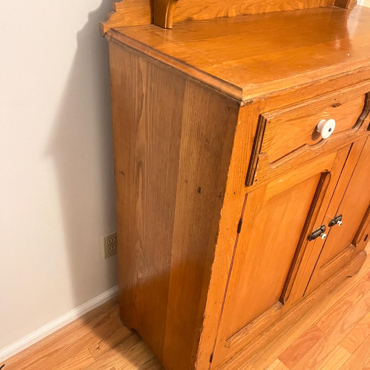 Lot includes a wooden cupboard with two dovetailed drawers with two cabinet doors underneath and a shelf on the top of cupboard. Cupboard measures 43” x 18” x 58”H.