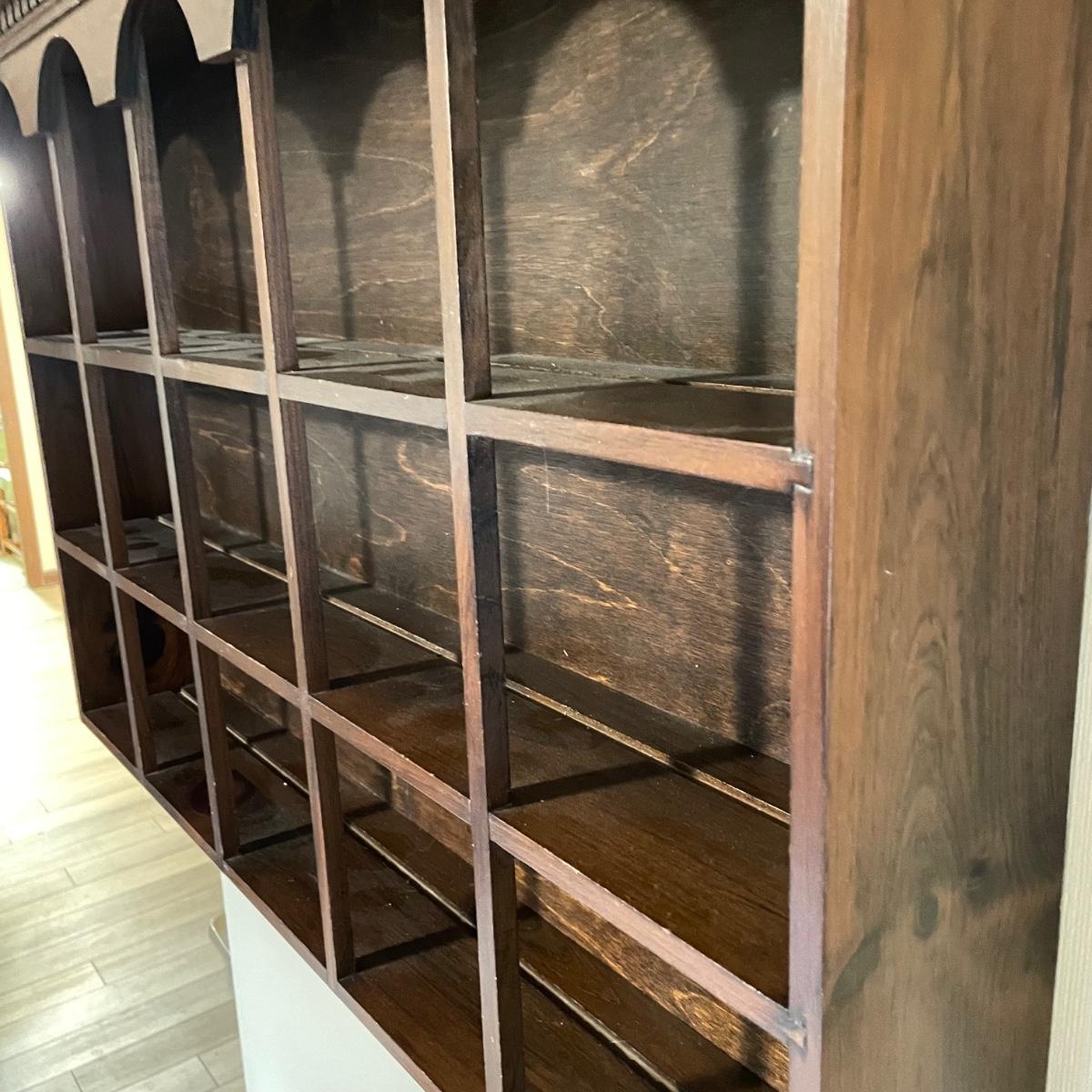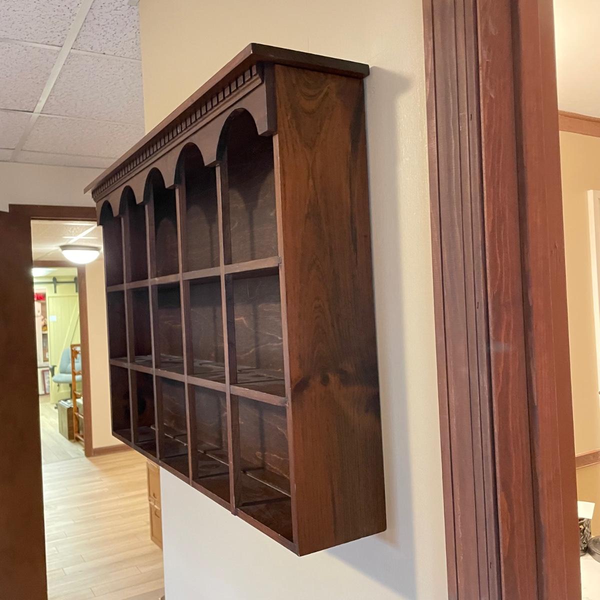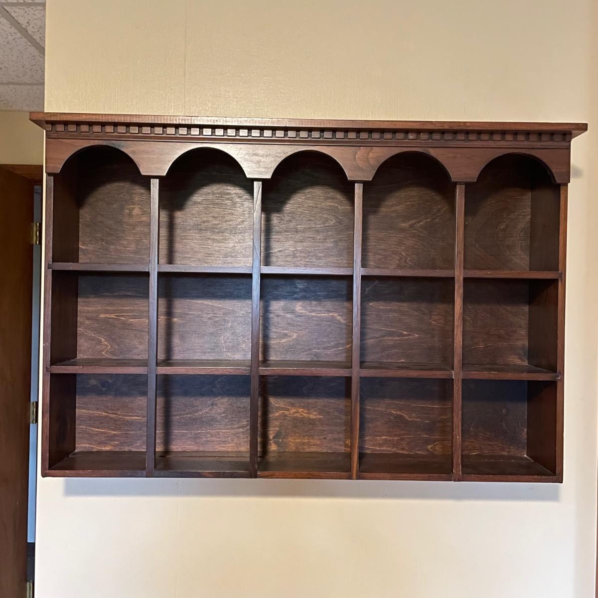Lovely large wooden curio shelf measures 34” x 6.5” x 22”H. Shelves have plate grooves, piece appears to be solid wood and has very little wear. See images. Local pick up only.