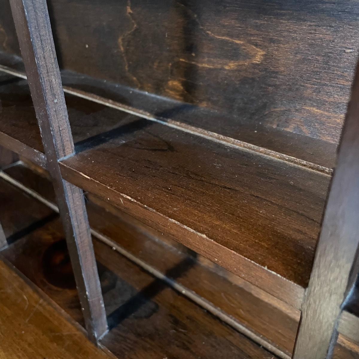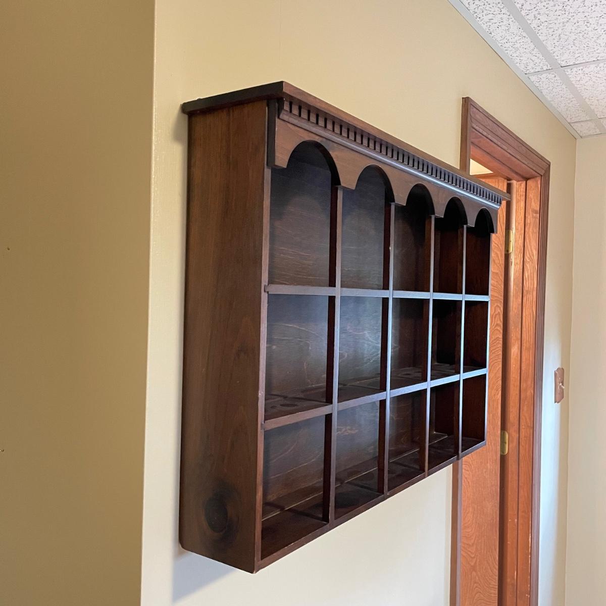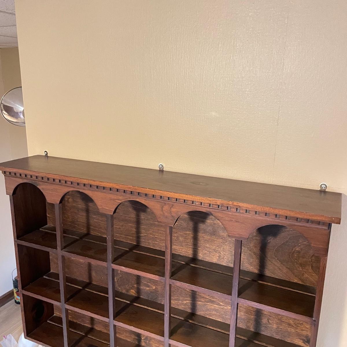 Lovely large wooden curio shelf measures 34” x 6.5” x 22”H. Shelves have plate grooves, piece appears to be solid wood and has very little wear. See images. Local pick up only.