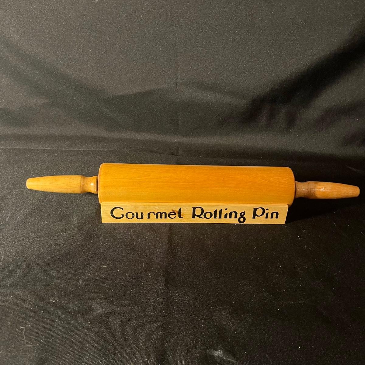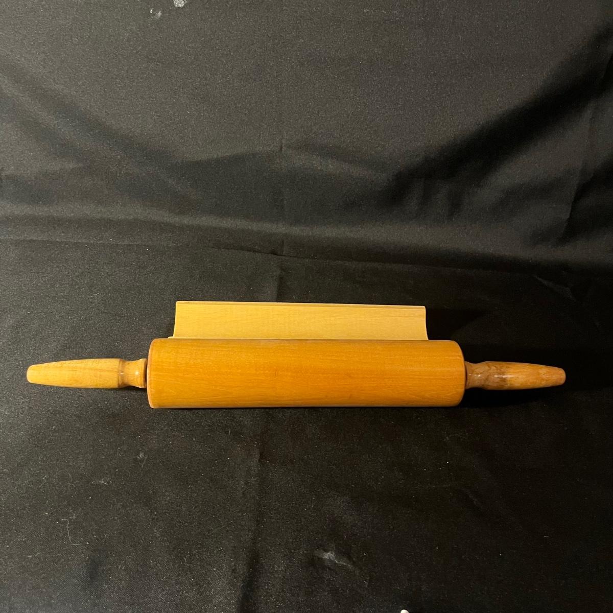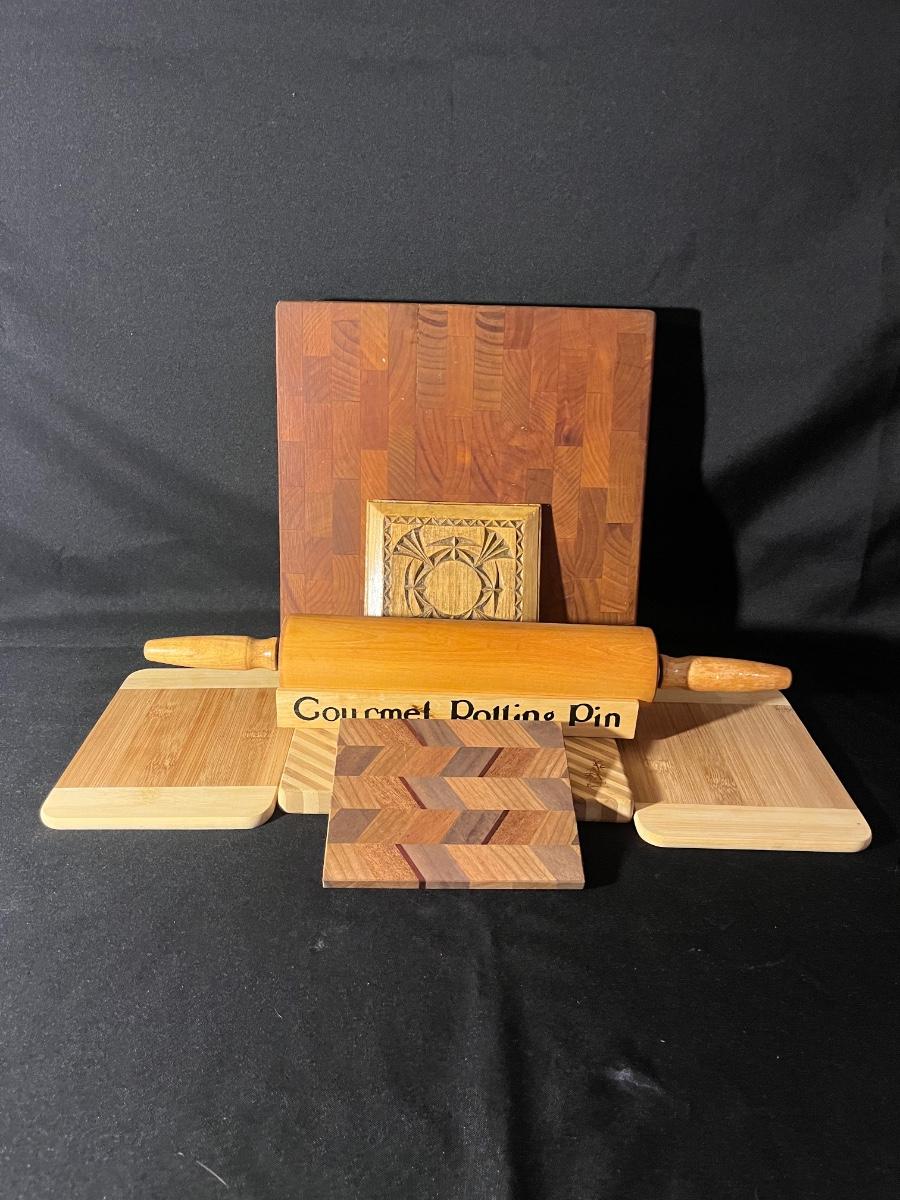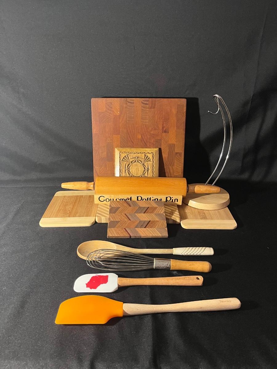 Lot includes five Wooden cutting boards, a wooden trivet, a rolling pin with stand, four utensils with wooden handles and a banana hanger with wood base. Largest cutting board measures 11.5” x 11.5” x 1.5”H.