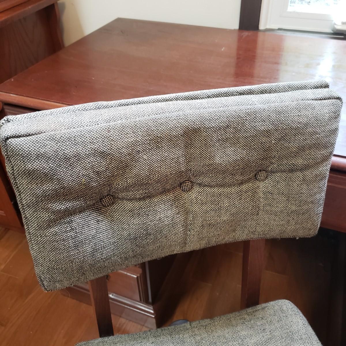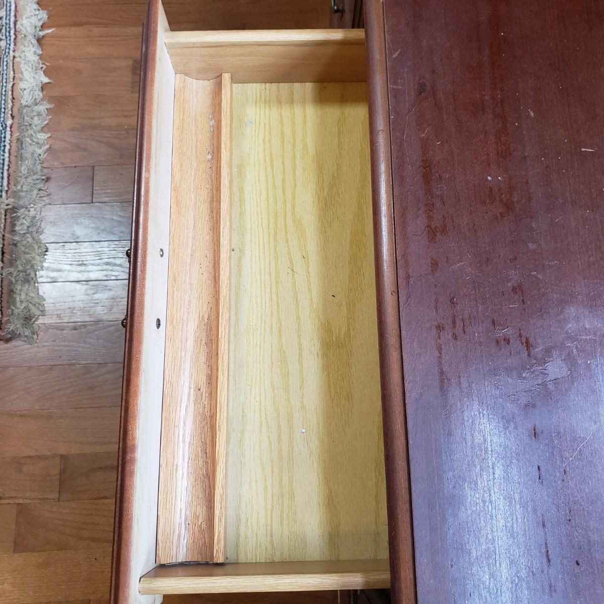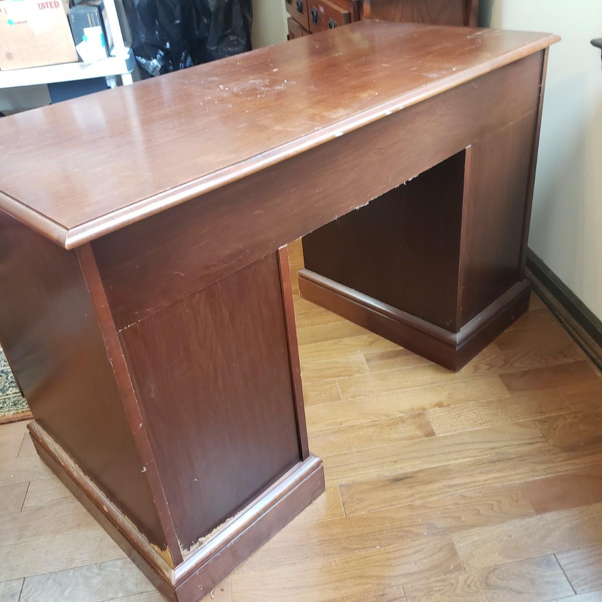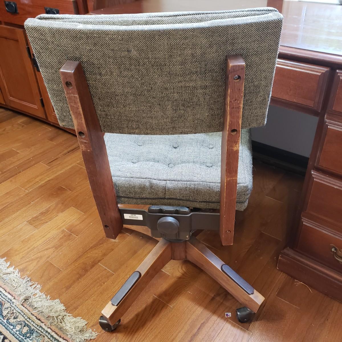 This lot is a wooden desk and vintage rolling desk chair. The chair measures 18" x 17" x 36"H, with a seat height of 21". The chair is covered in a tweed material with tan and black pattern. There are a couple of bolts missing on the back support piece, but could be an easy fix. The desk measures 48" x 23" x 30"H. The top and the drawers are made of solid wood, while the side boards appear to be a composite board, see pictures. The finish has come off the bottom, near the trim, see pictures. The desk feels solid.