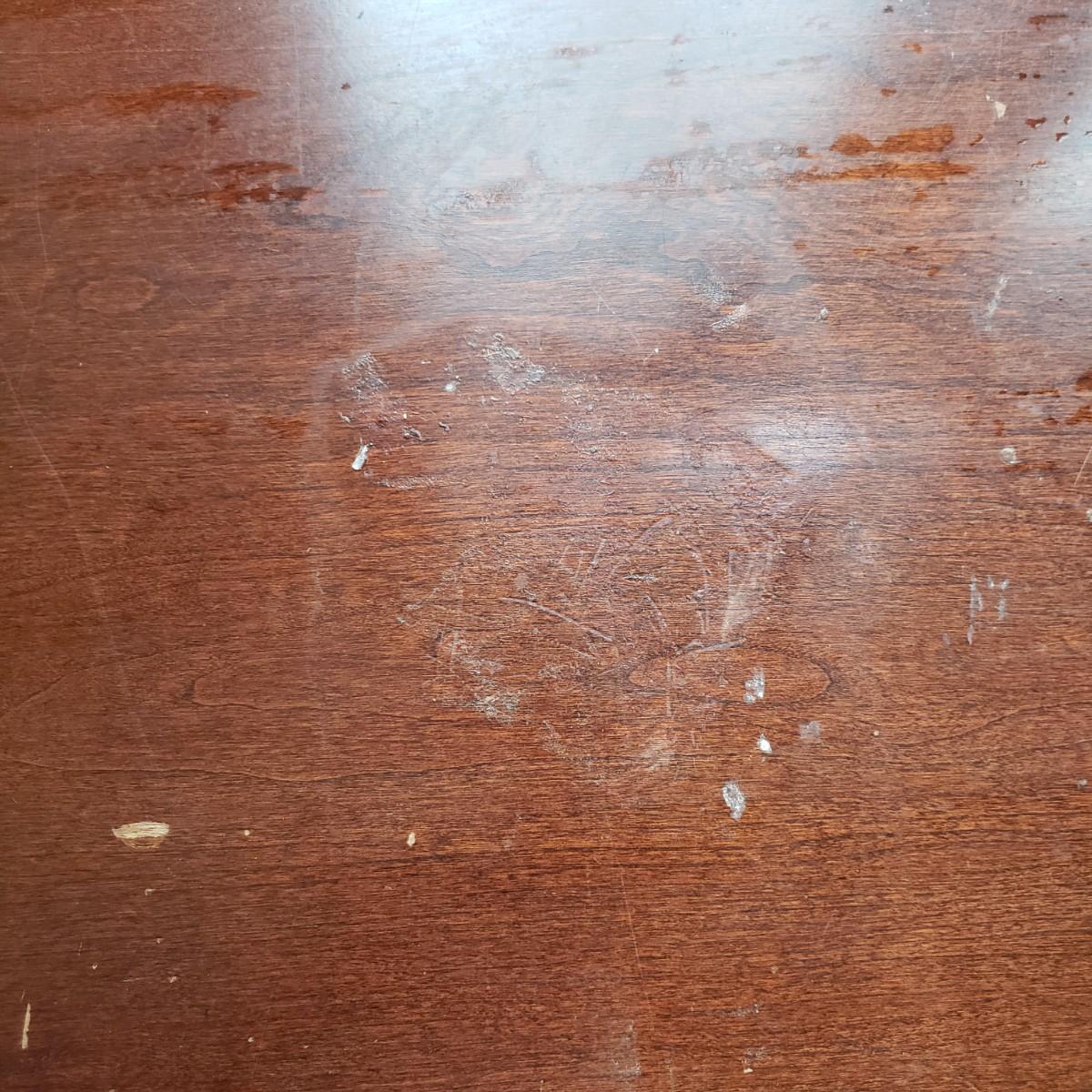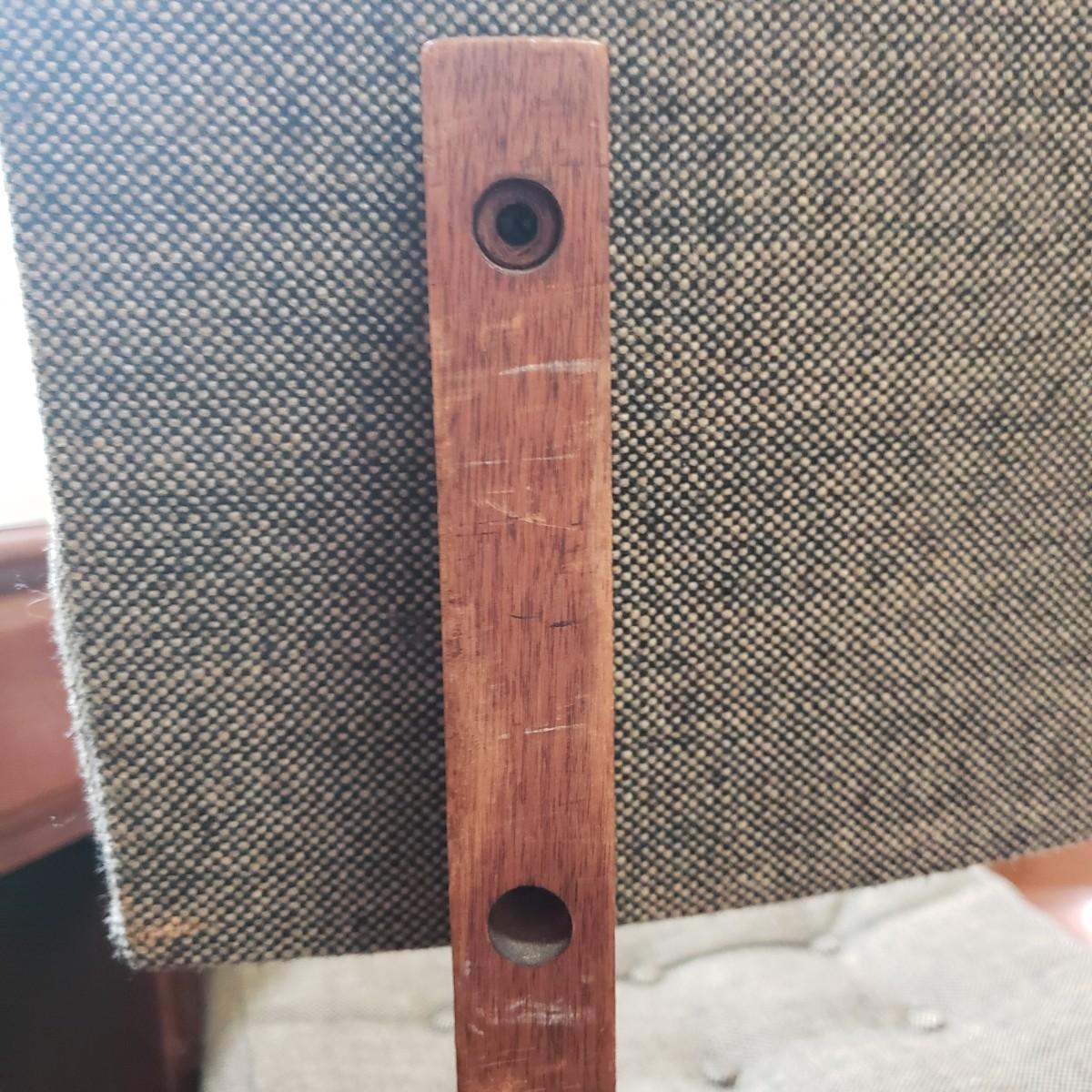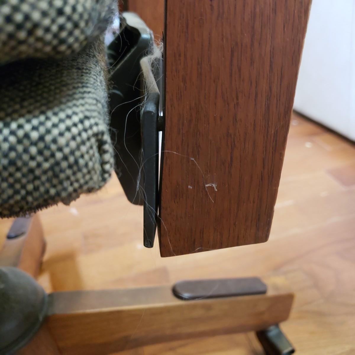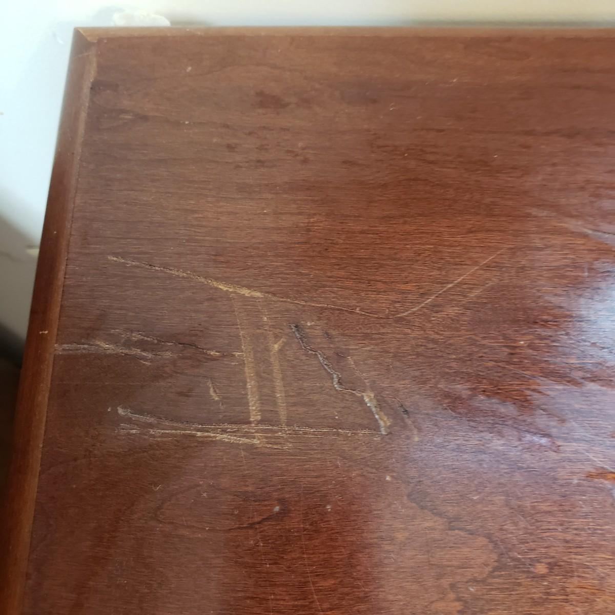 This lot is a wooden desk and vintage rolling desk chair. The chair measures 18" x 17" x 36"H, with a seat height of 21". The chair is covered in a tweed material with tan and black pattern. There are a couple of bolts missing on the back support piece, but could be an easy fix. The desk measures 48" x 23" x 30"H. The top and the drawers are made of solid wood, while the side boards appear to be a composite board, see pictures. The finish has come off the bottom, near the trim, see pictures. The desk feels solid.