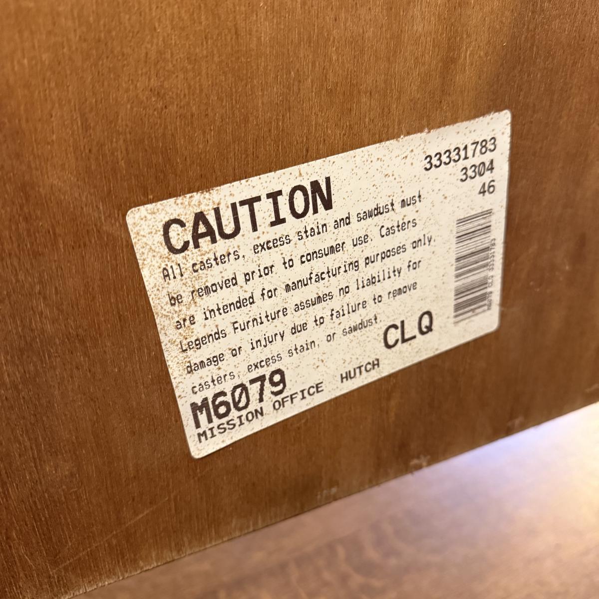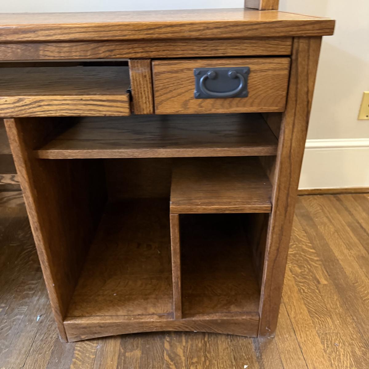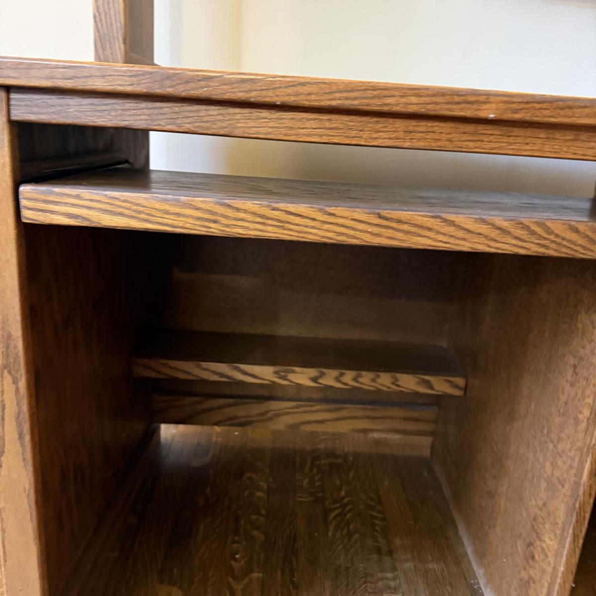 This lot contains a wooden computer desk with a hutch. The hutch detaches from the desk with a Philips head screwdriver. This item measures 49.5” x 24.75” x 64”H. The desk features a roll out keyboard shelf and a small drawer with a few shelves for your desktop. The hutch features three shelves. Local pick up only. Winning bidder must bring assistance to help move and load this item due to its weight and/or size. This item is located on the second level of the house, and you will need to travel down one set of stairs and up a second set outside to the parking area.