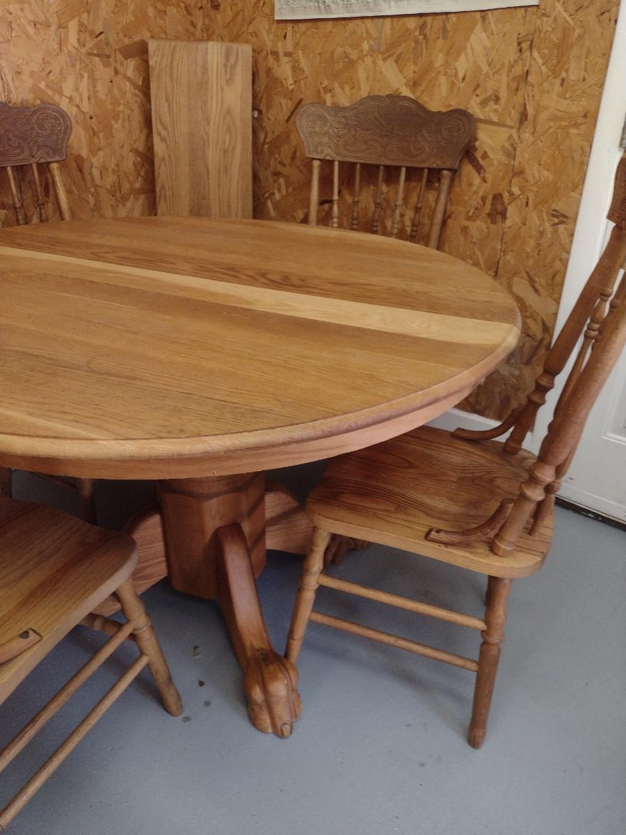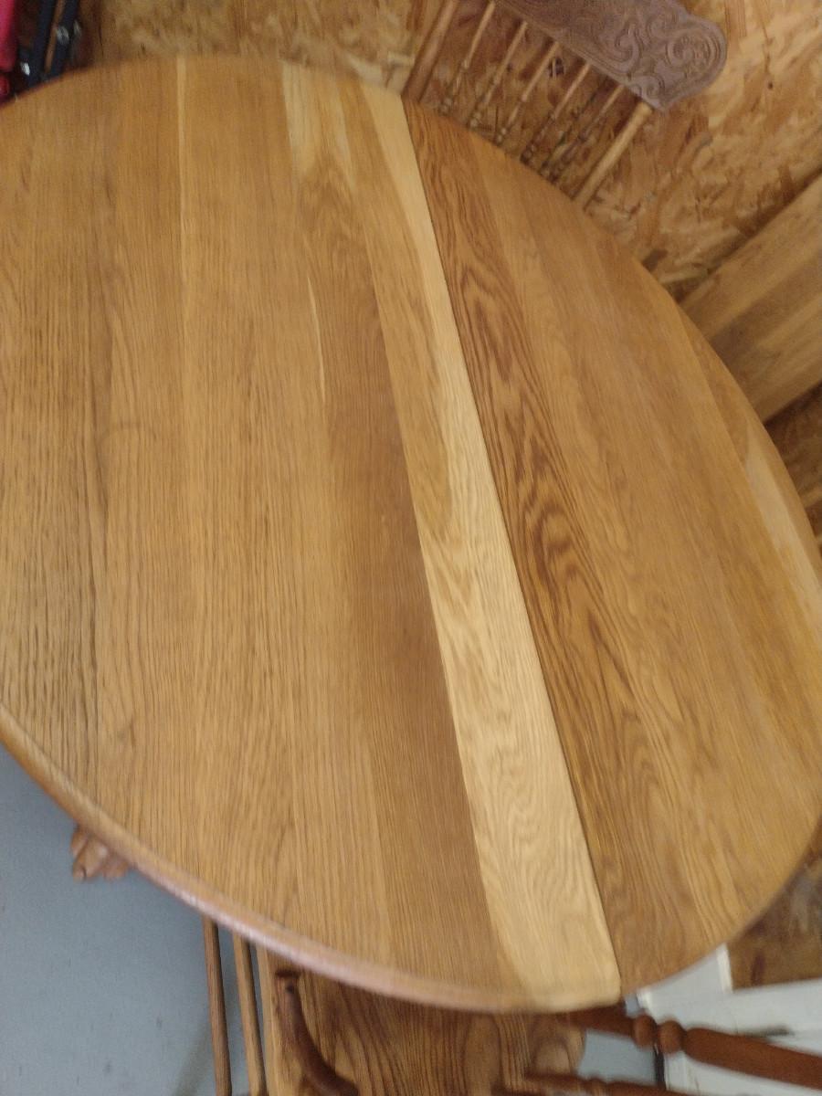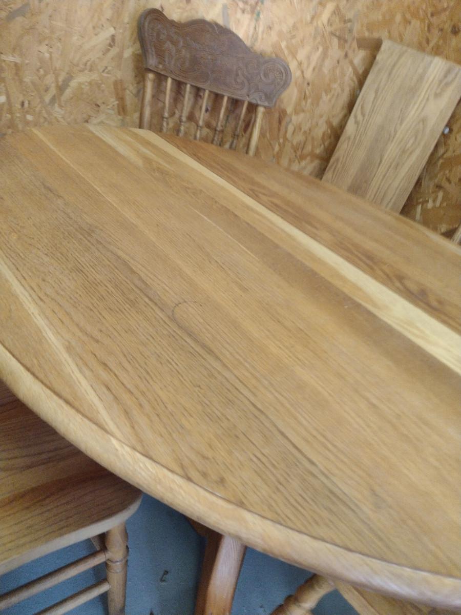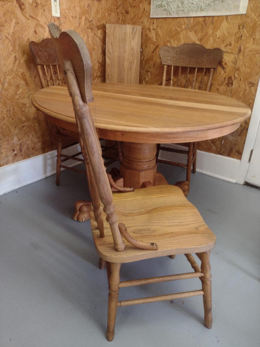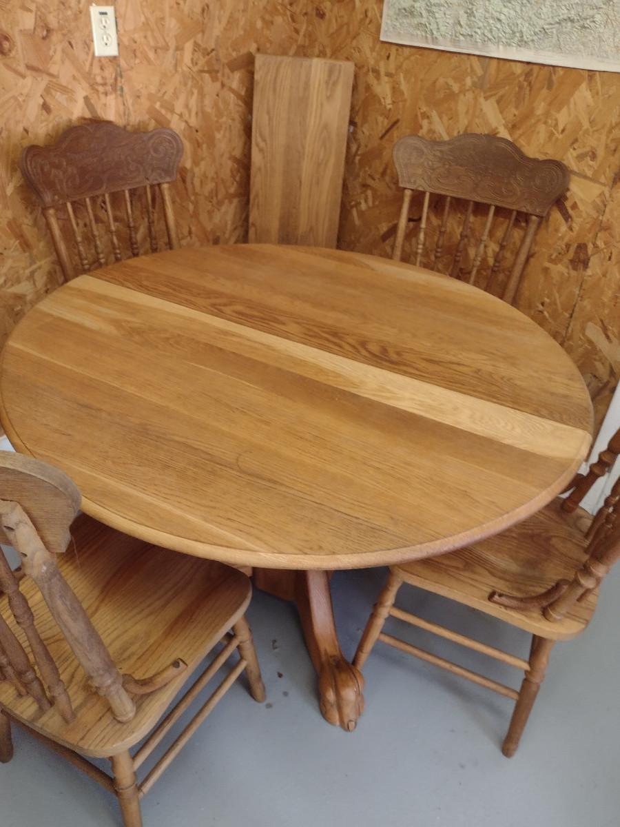 Wooden Dining Table and Four Chairs. Item includes additional 12" leaf. Please see all pictures- chairs have areas of de-lamination.