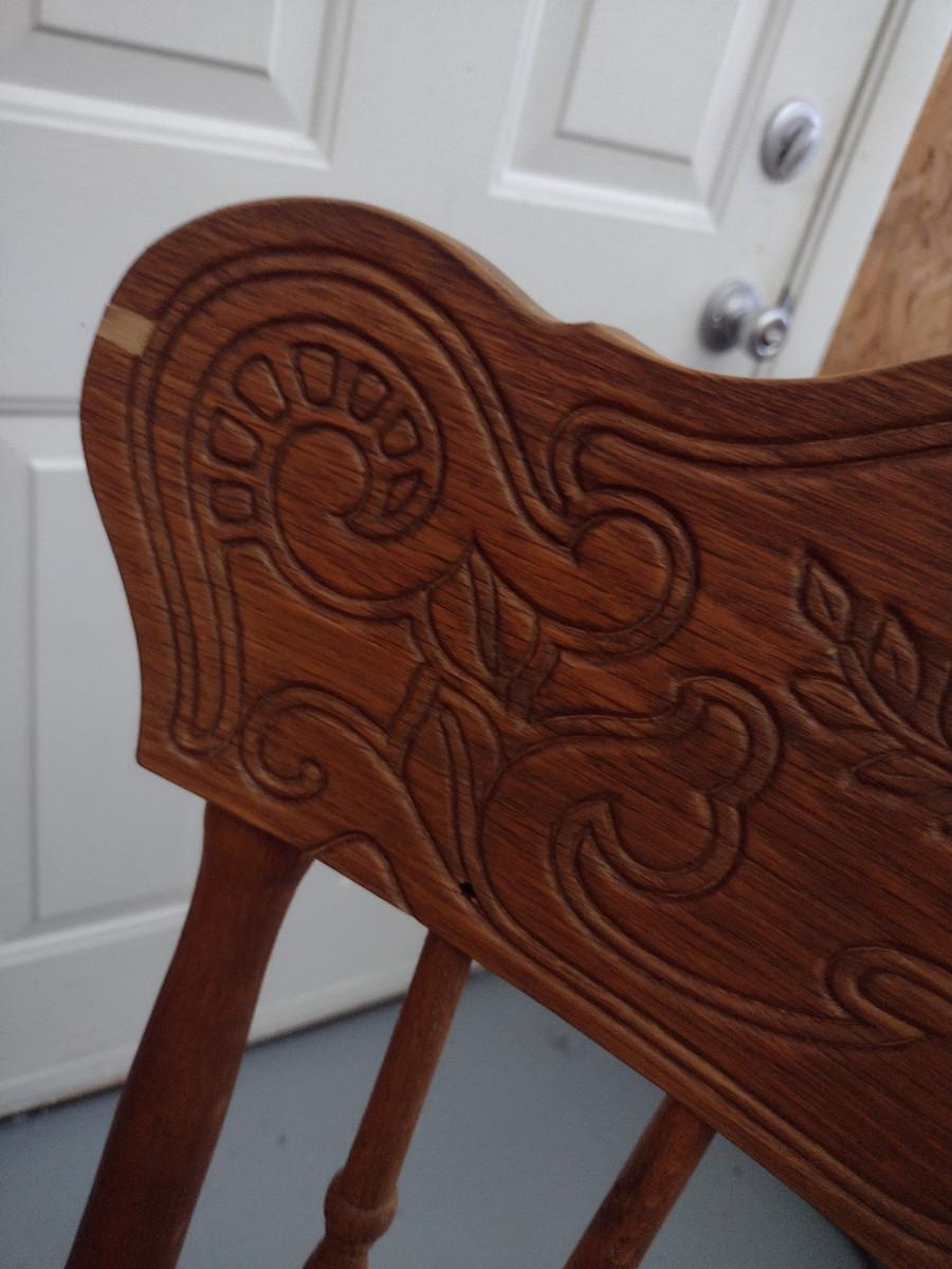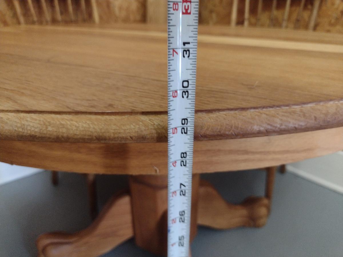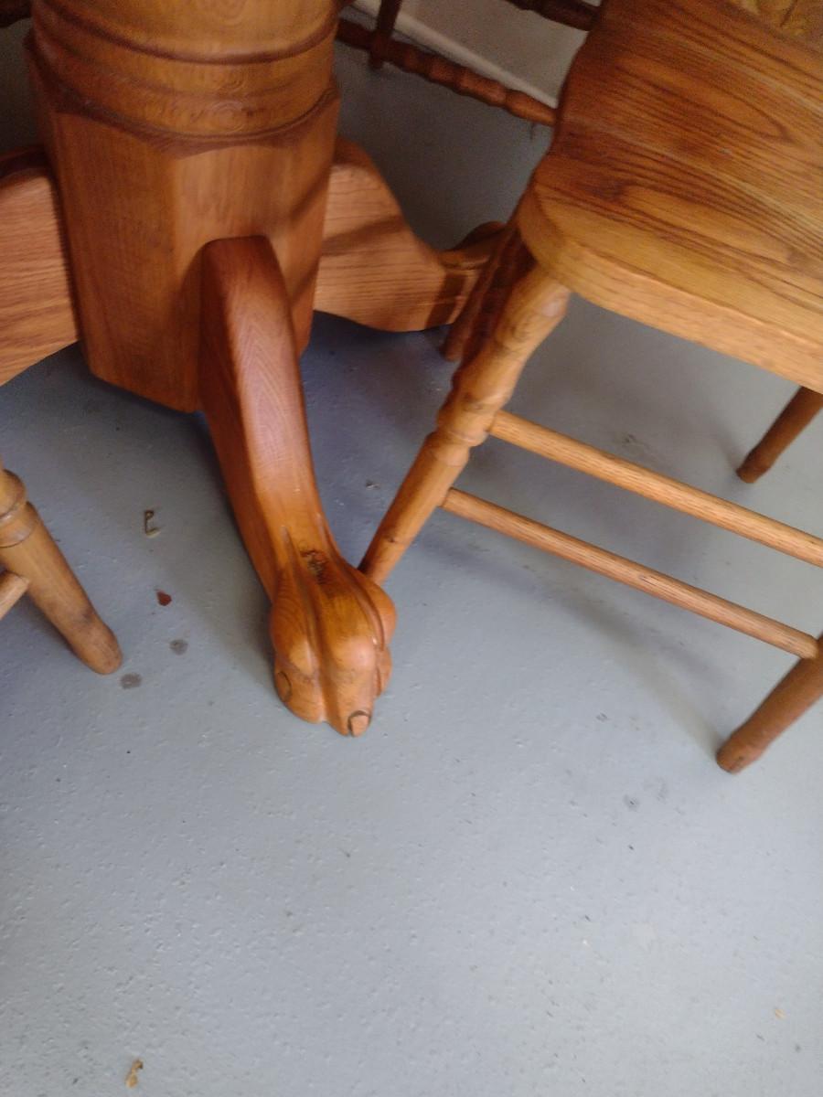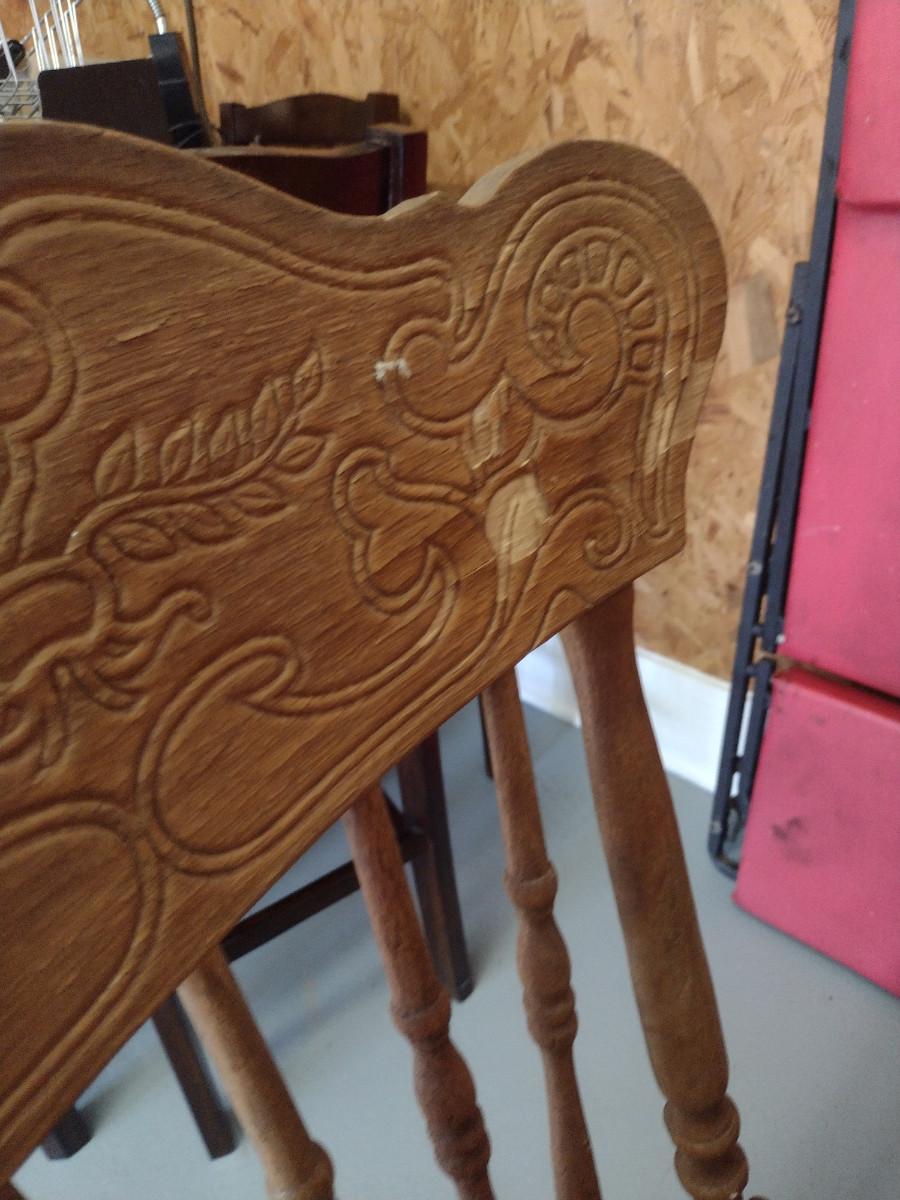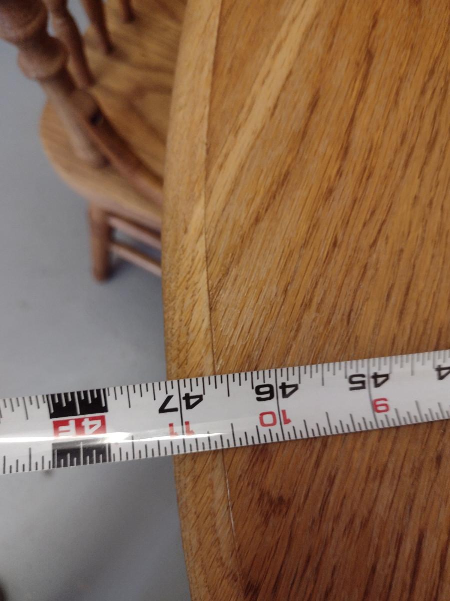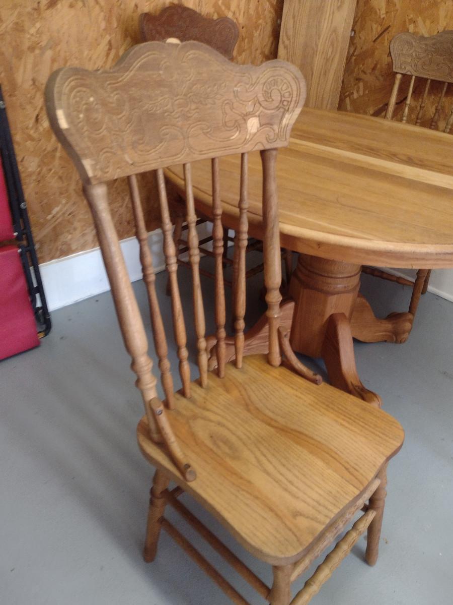 Wooden Dining Table and Four Chairs. Item includes additional 12" leaf. Please see all pictures- chairs have areas of de-lamination.