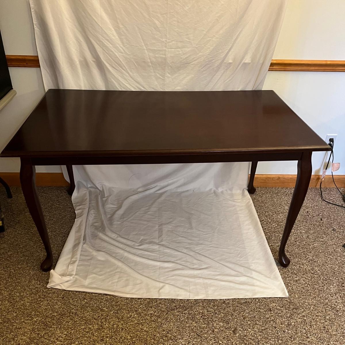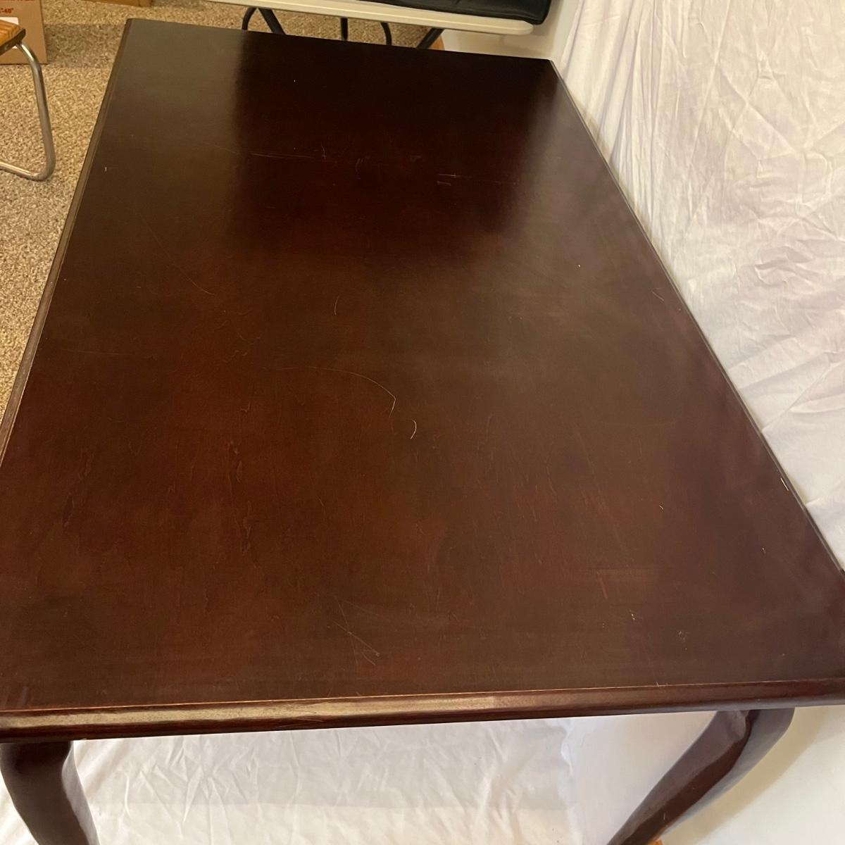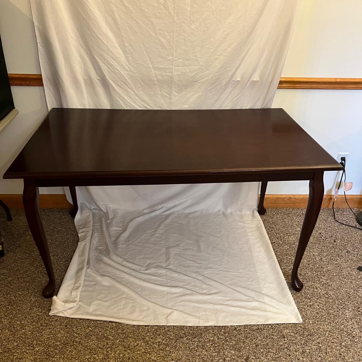 Lot includes a wooden dining table with a dark colored cherry finish. Table has some scratches on top, see pictures. Table measures 33” x 54” x 29”.