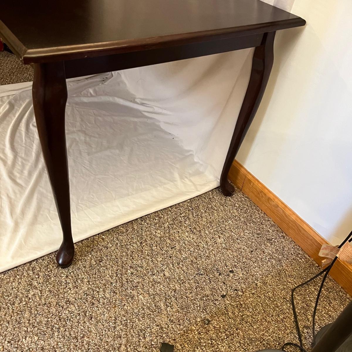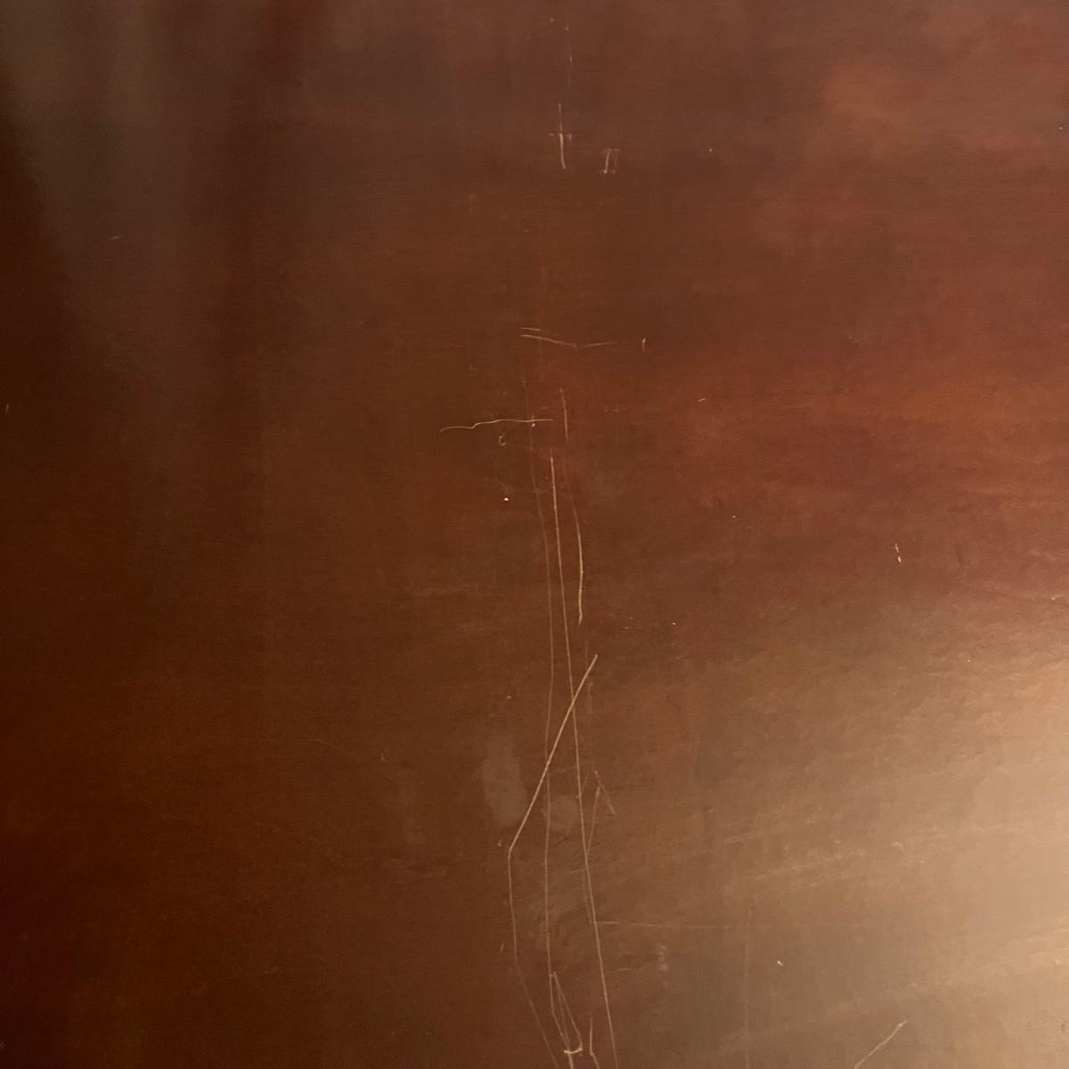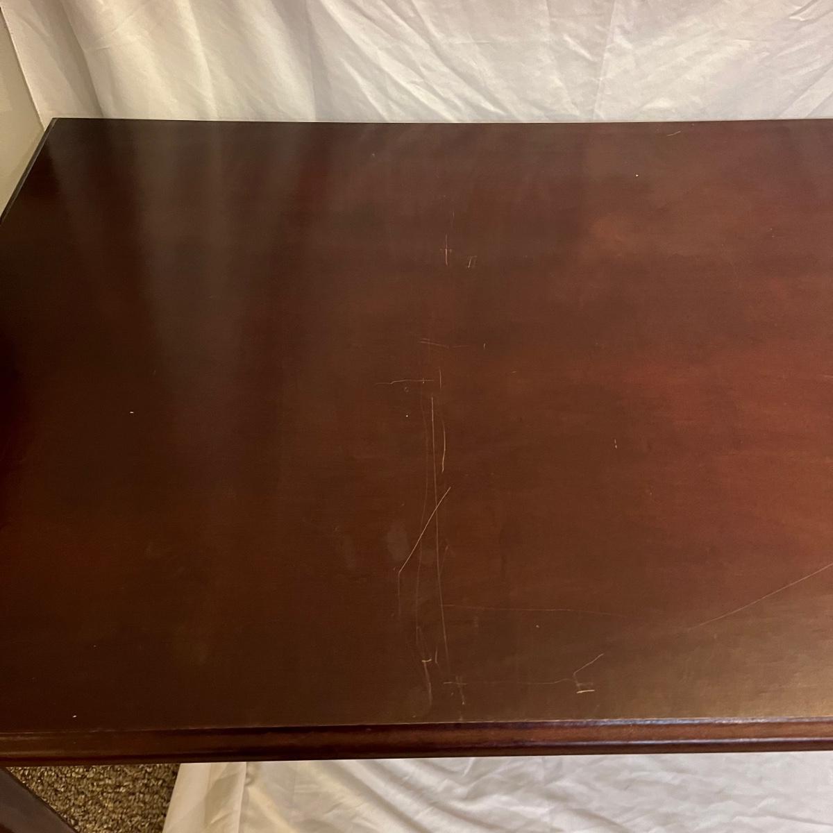 Lot includes a wooden dining table with a dark colored cherry finish. Table has some scratches on top, see pictures. Table measures 33” x 54” x 29”.