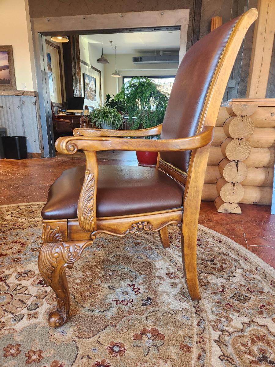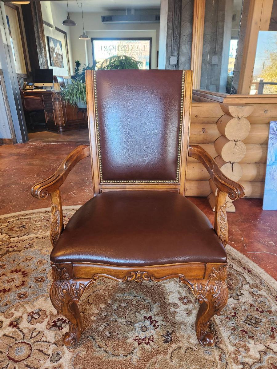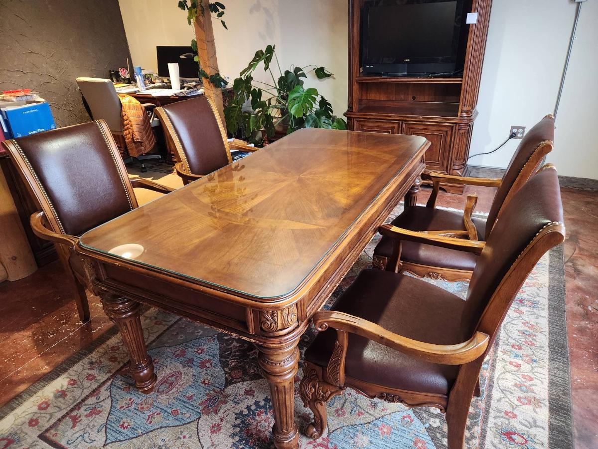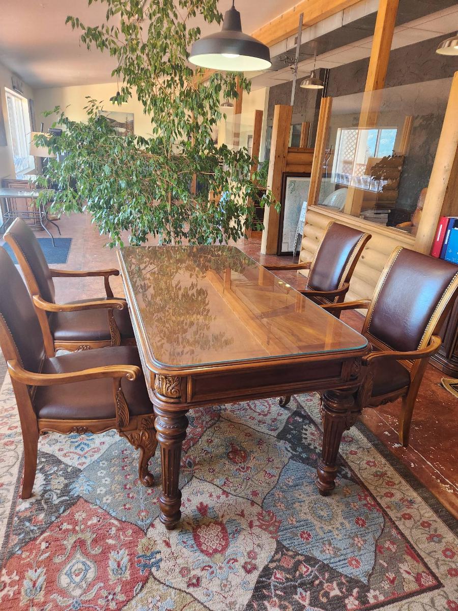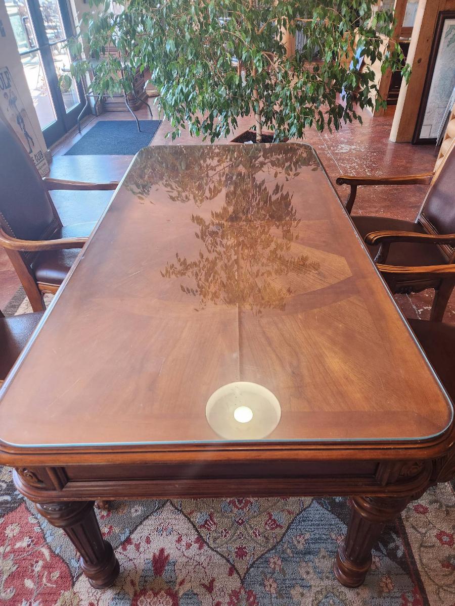 Wooden dining table set measuring 6x3x2.6 feet, featuring a glass top and ornate carved detailing on the legs. Includes six chairs with padded seats and backs, upholstered in brown leather-like material, and armrests. Each chair displays detailed carvings on the arms and legs, complementing the elegant table design. In good condition, showcasing craftsmanship and a cohesive style.