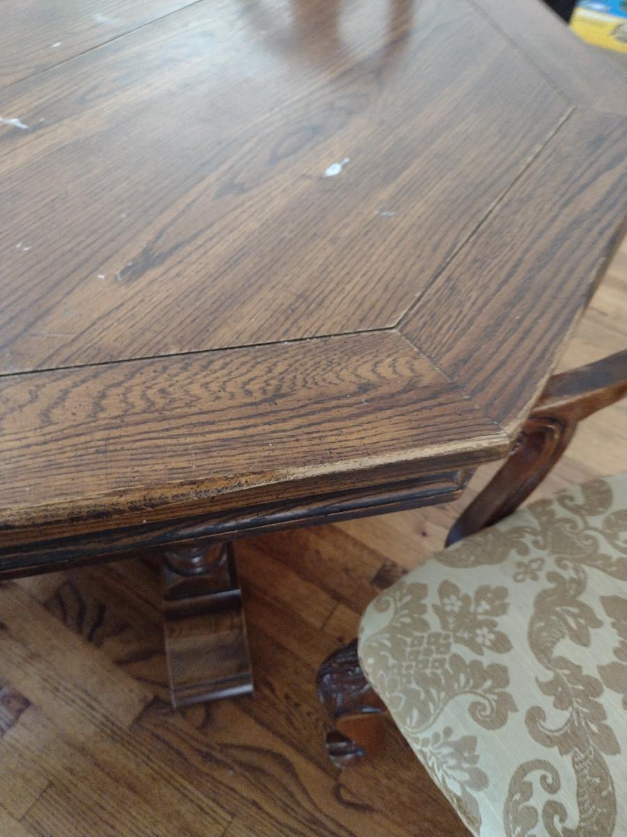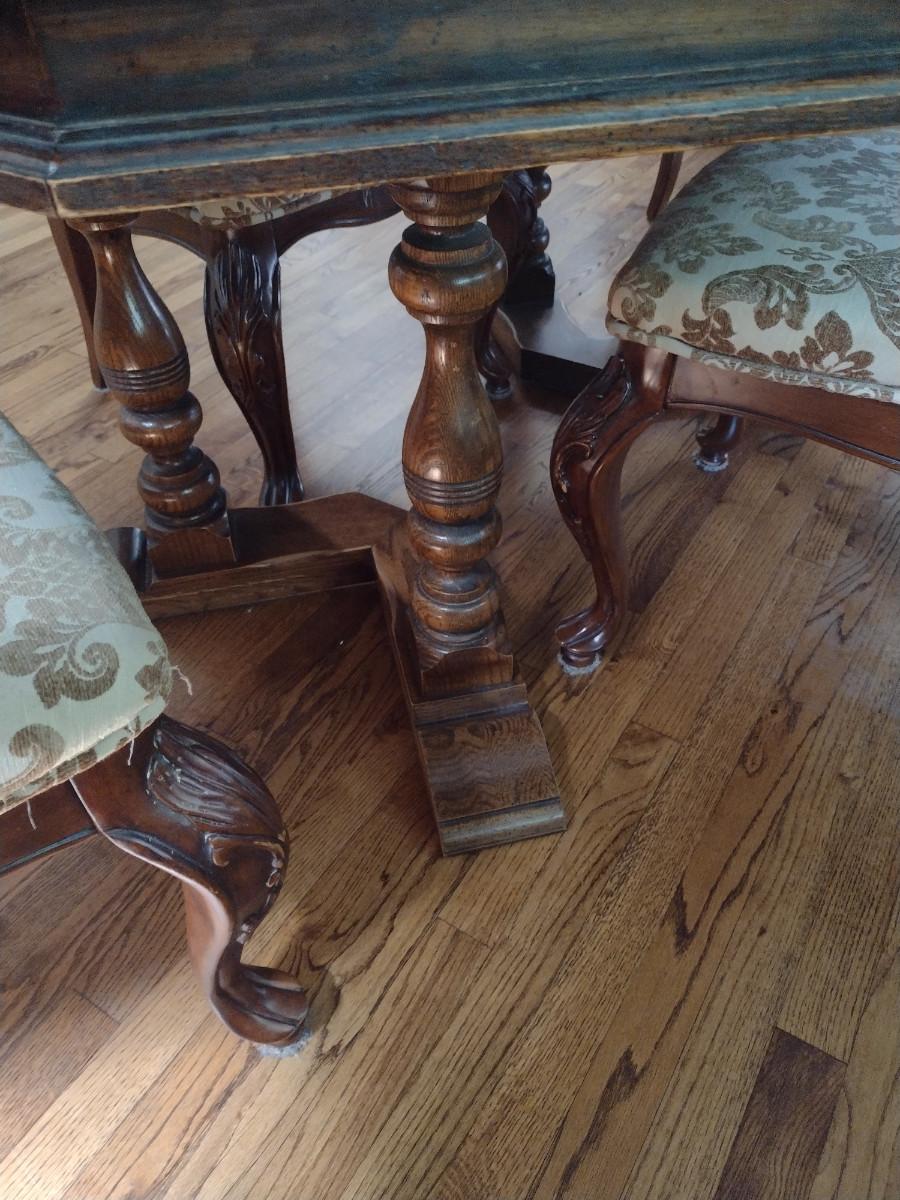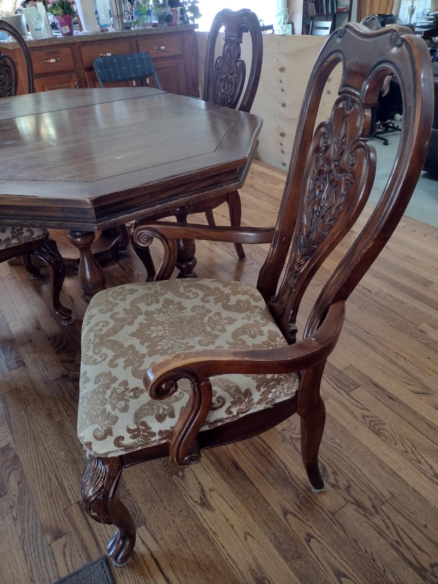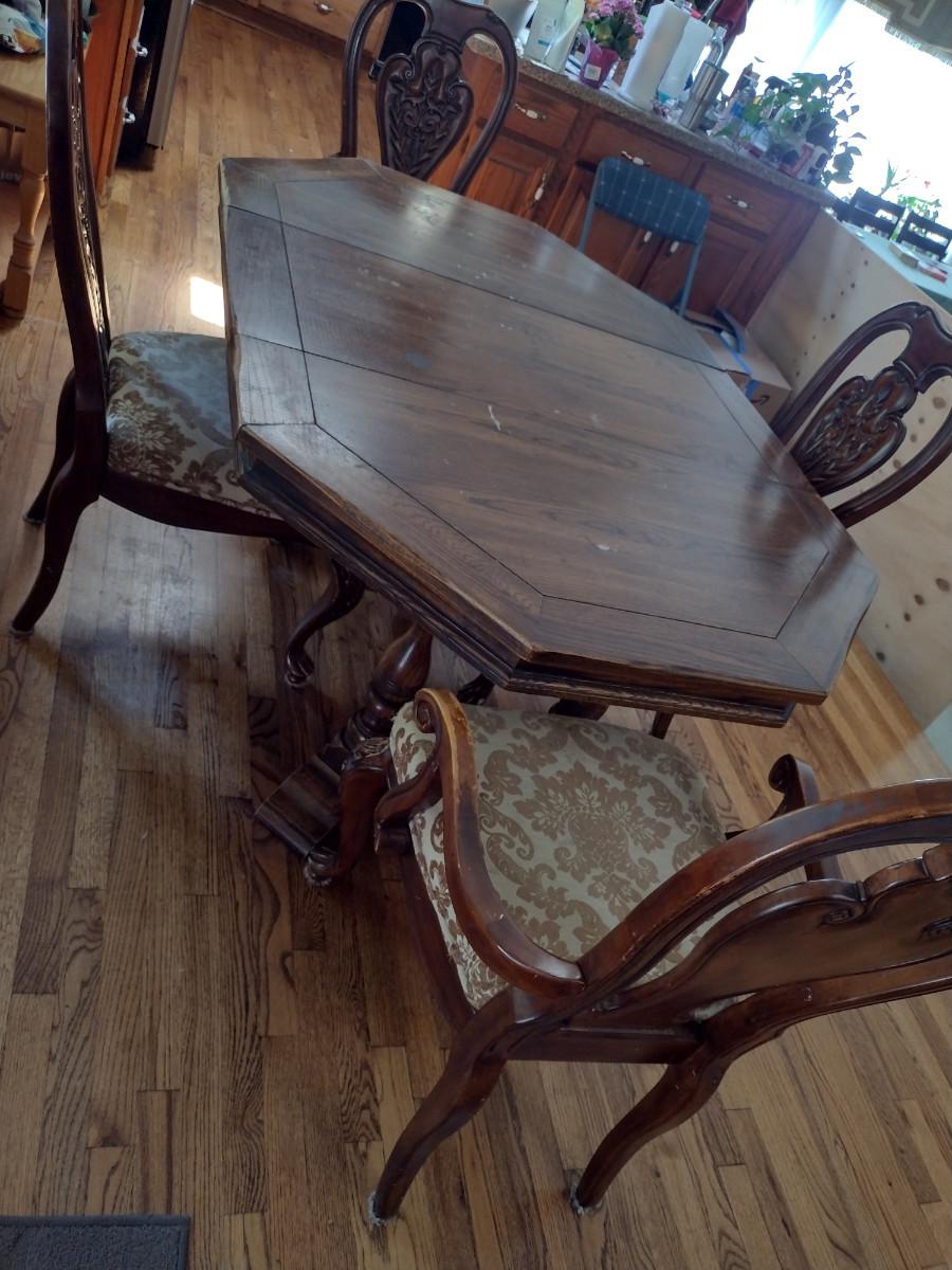 Wooden Dining Table with Four Chairs. Two side chairs, two captain's chairs with arms. Item is in used condition with heavy wear to finish- please see all pictures for condition. Table measures approx 61 3/4" long with leaf included (18"). Table is approx 44" wide.