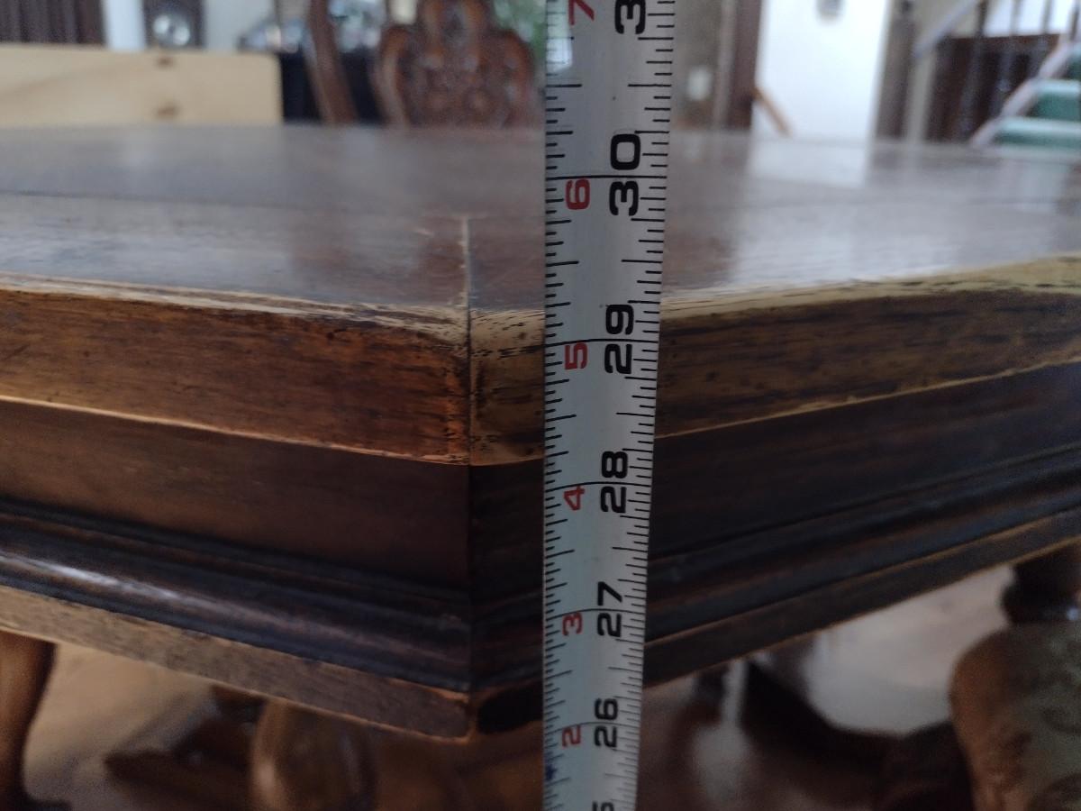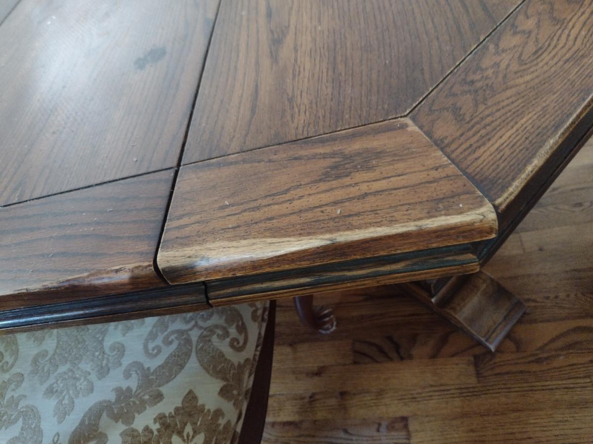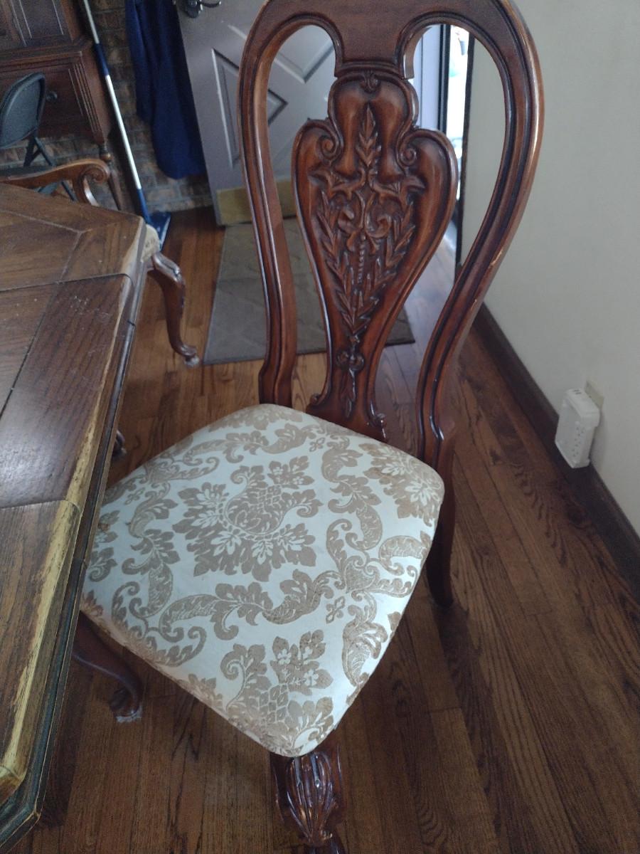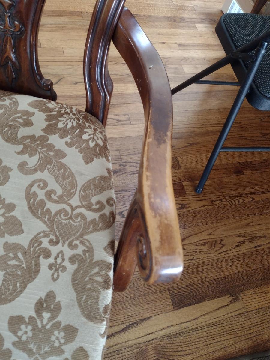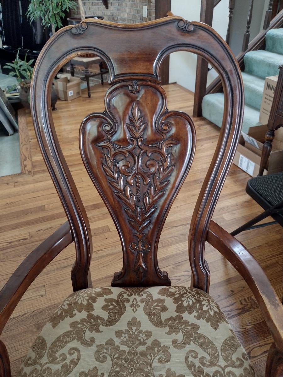Wooden Dining Table with Four Chairs. Two side chairs, two captain's chairs with arms. Item is in used condition with heavy wear to finish- please see all pictures for condition. Table measures approx 61 3/4" long with leaf included (18"). Table is approx 44" wide.