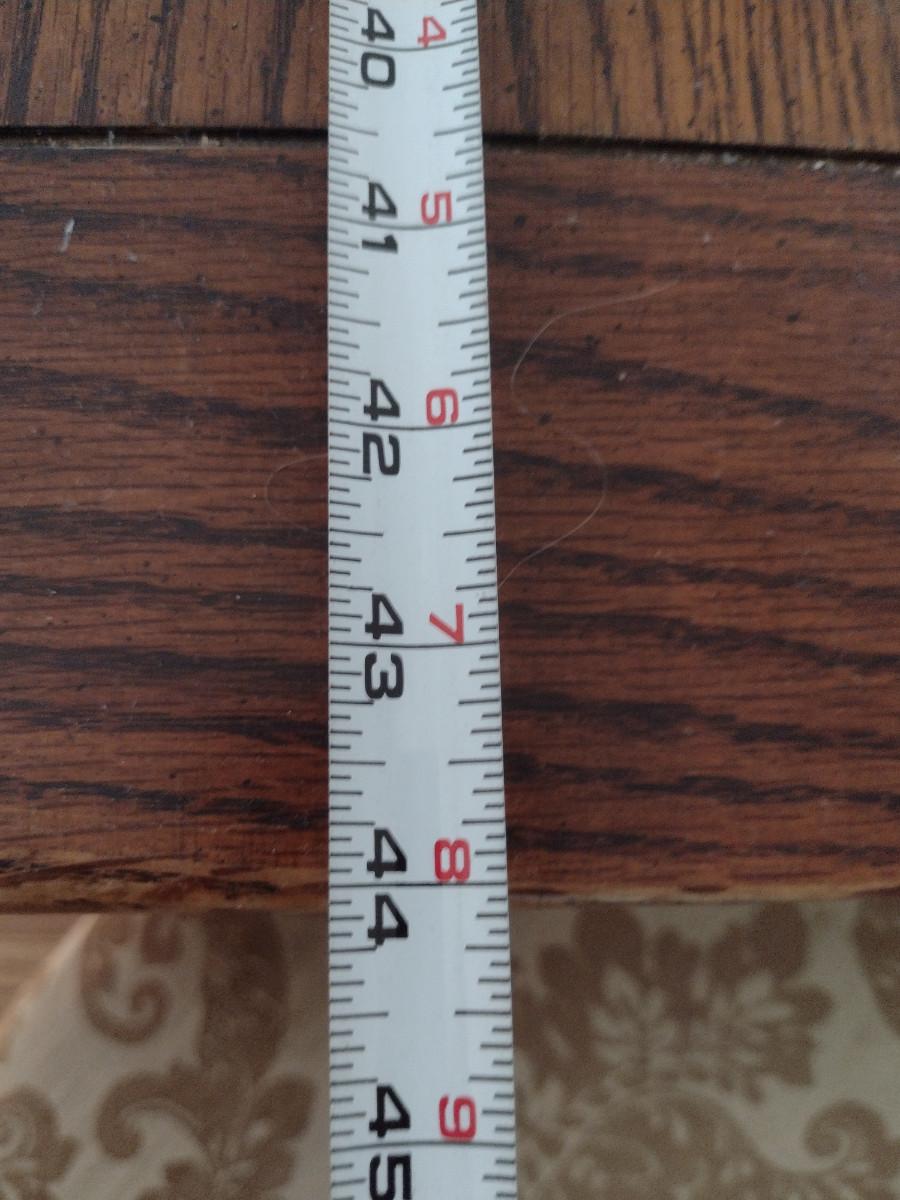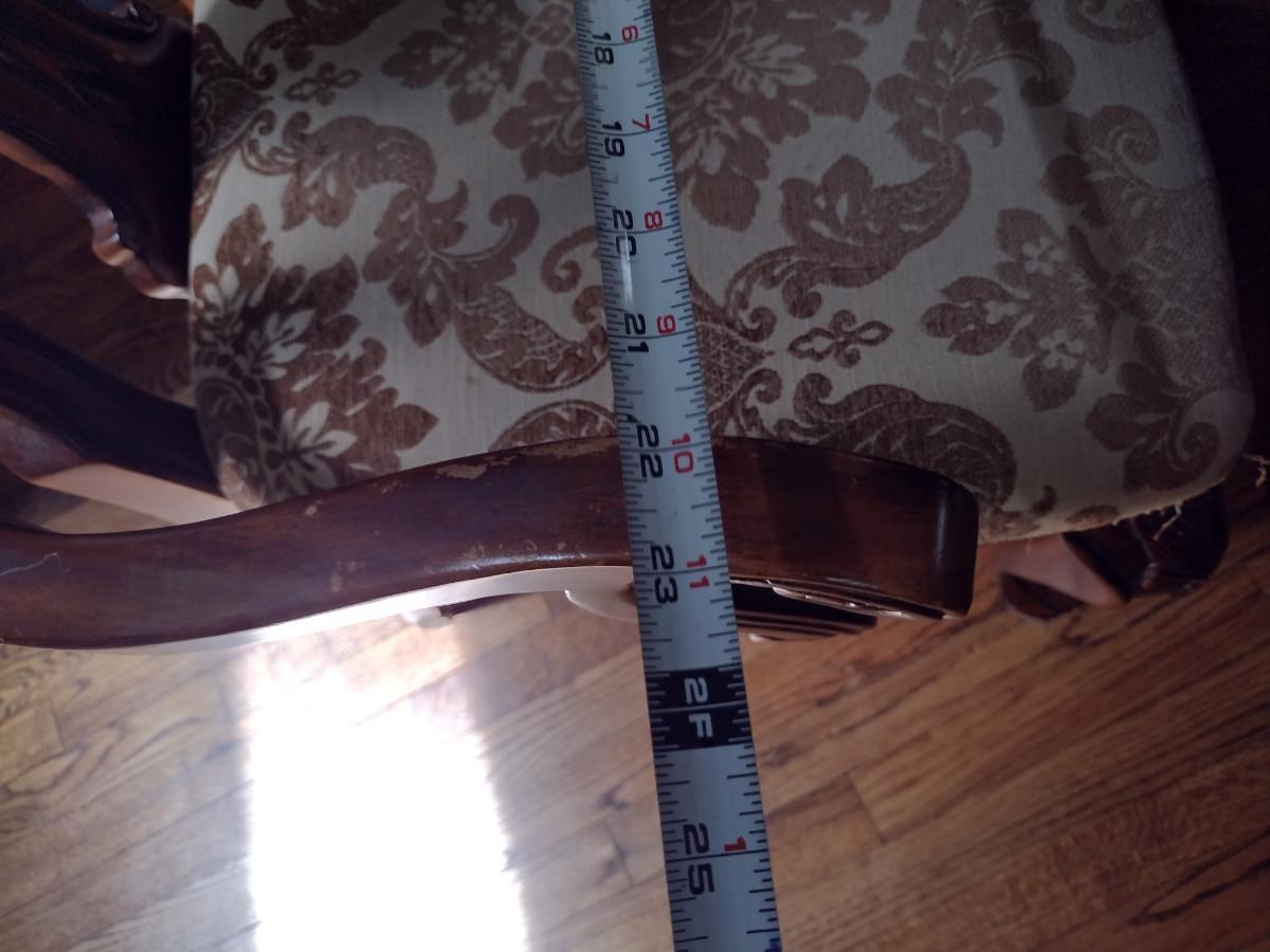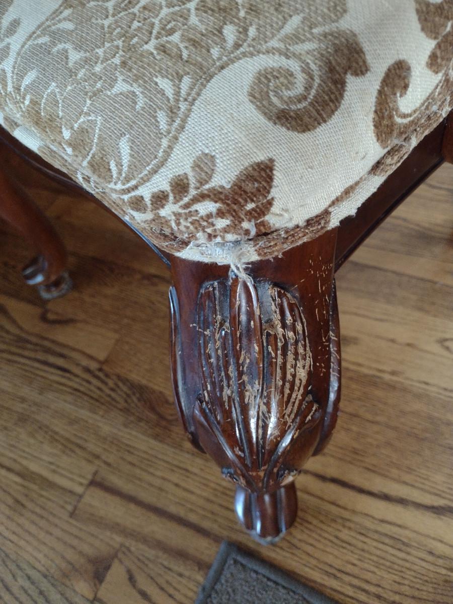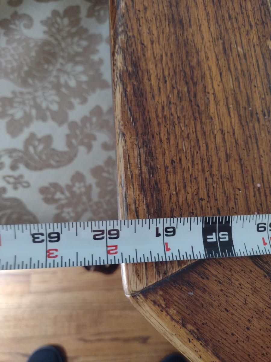 Wooden Dining Table with Four Chairs. Two side chairs, two captain's chairs with arms. Item is in used condition with heavy wear to finish- please see all pictures for condition. Table measures approx 61 3/4" long with leaf included (18"). Table is approx 44" wide.