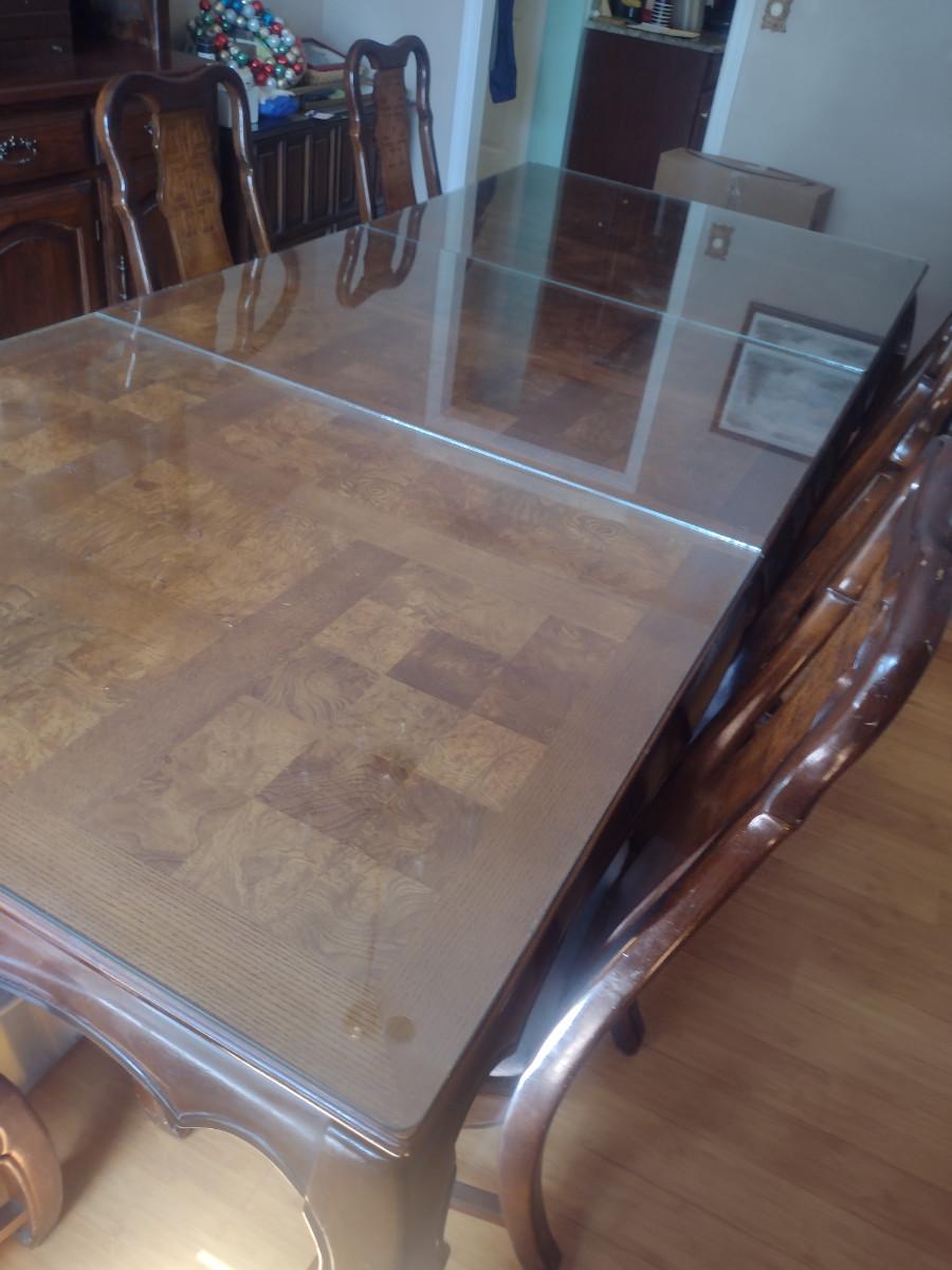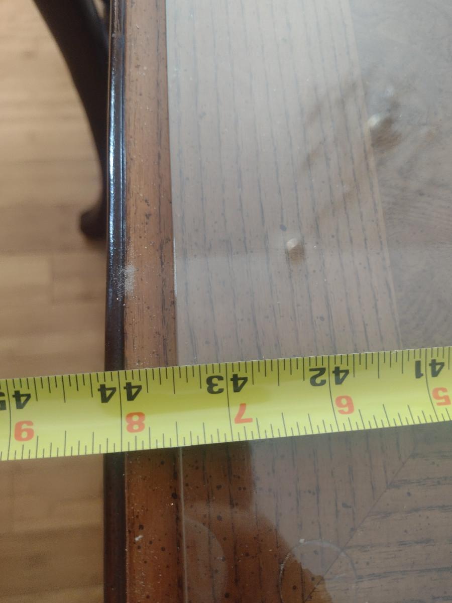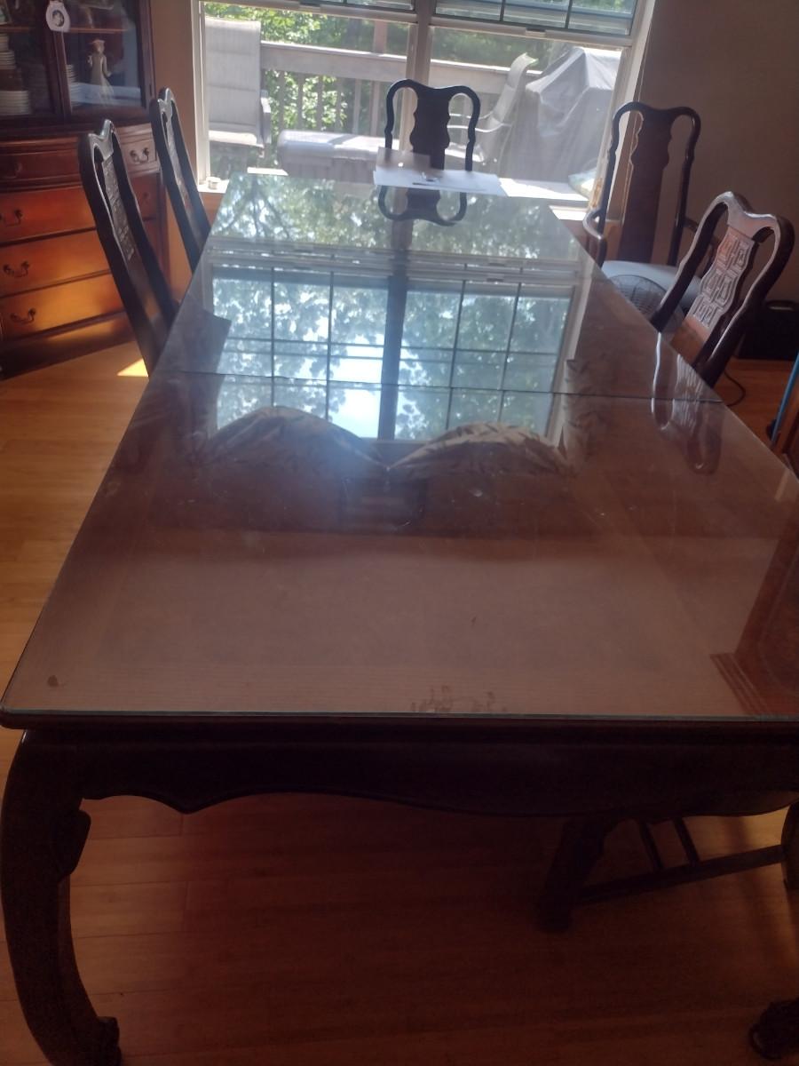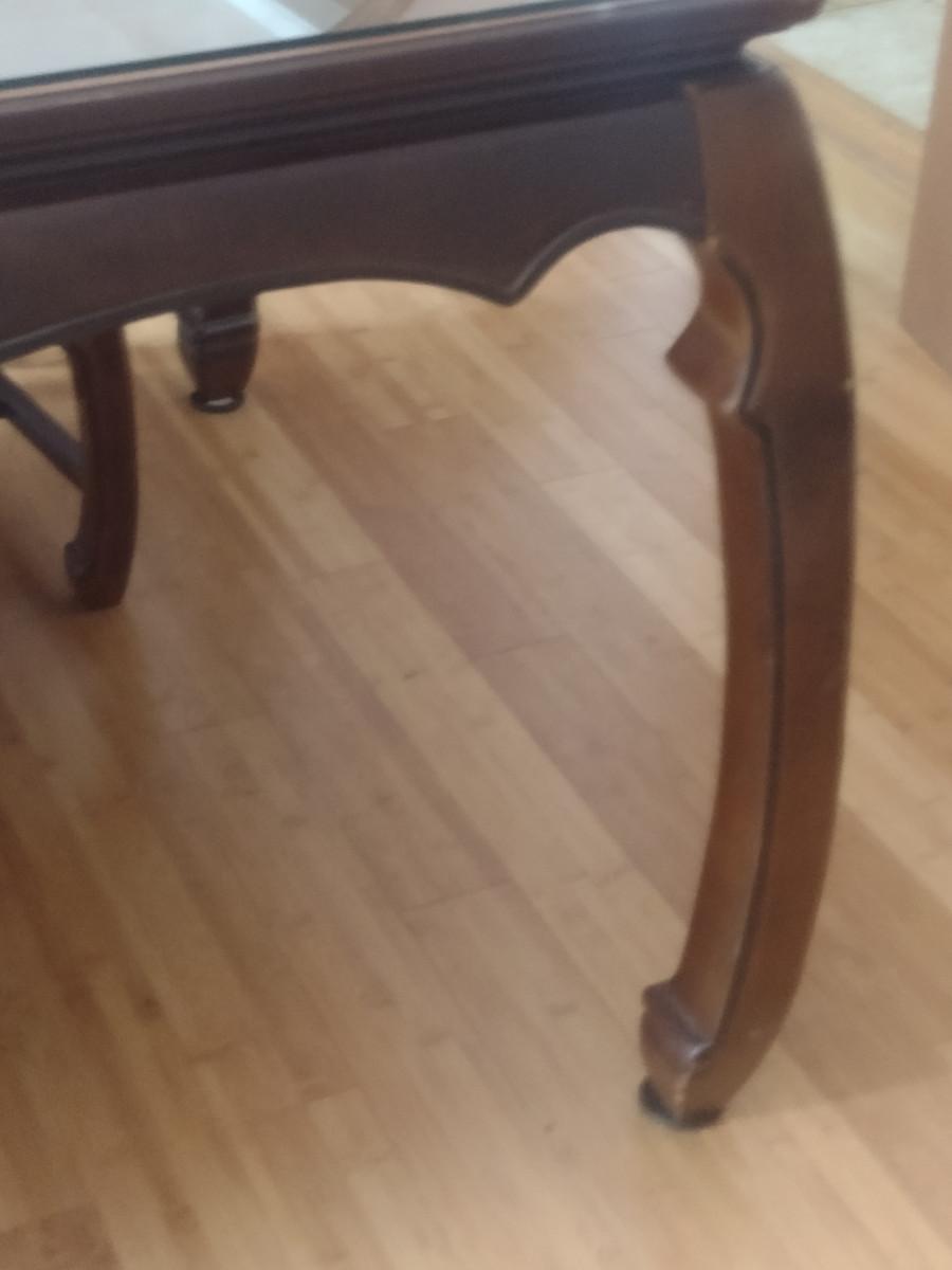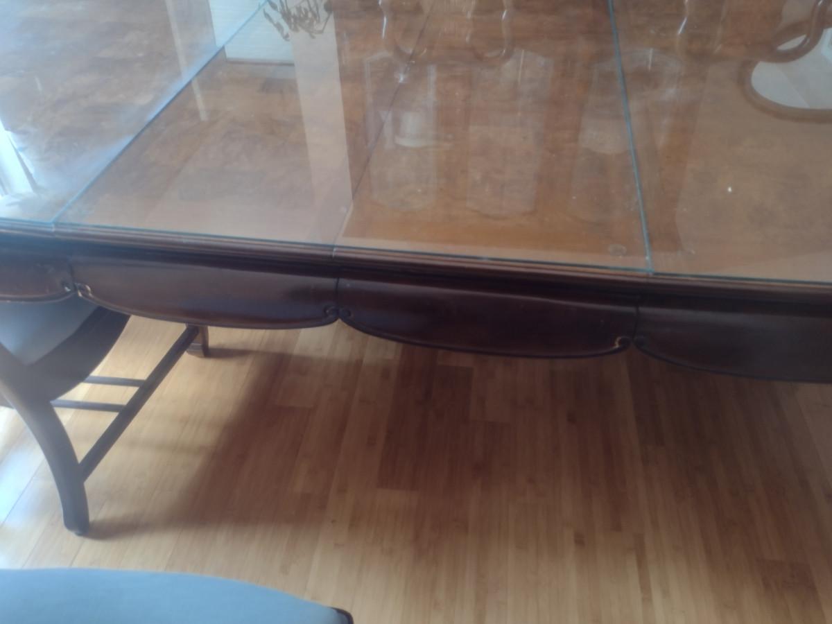 Wooden Dining Table with Glass Top. Item measures approx 44" wide, 30" tall, and a total of 97 1/2" long (with two leaves included- each 15"). Chairs sold separately.