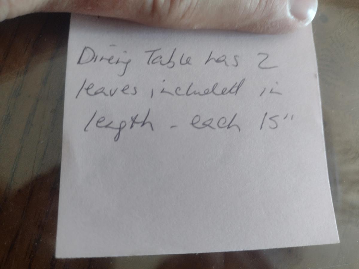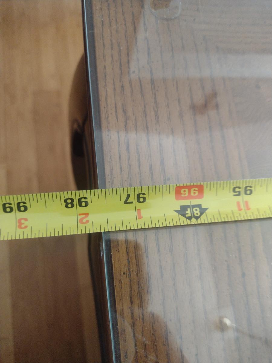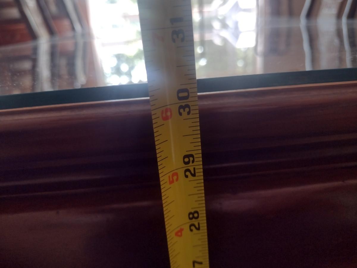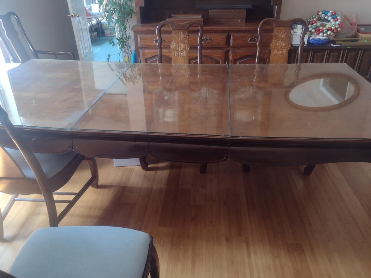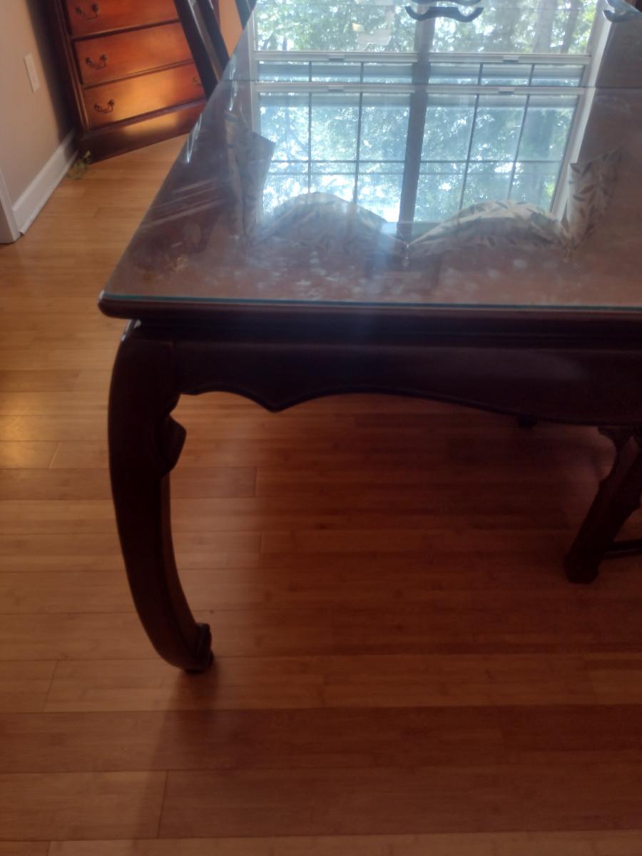 Wooden Dining Table with Glass Top. Item measures approx 44" wide, 30" tall, and a total of 97 1/2" long (with two leaves included- each 15"). Chairs sold separately.