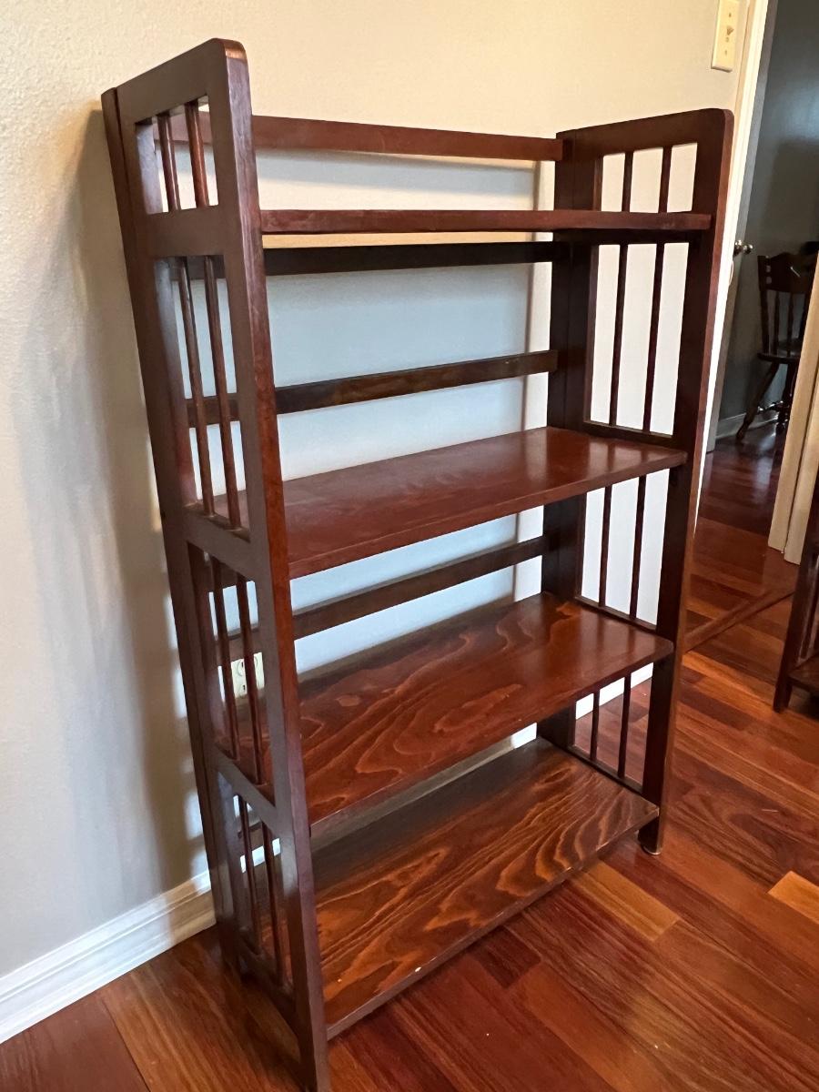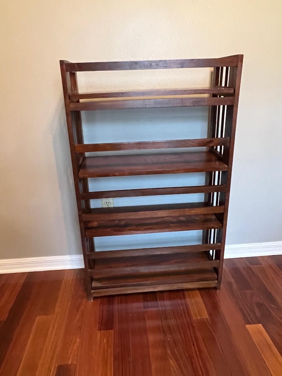 Wooden Display Shelf Measures 46 inches tall, 27 1/2 inches wide 11 1/2 inches deep.