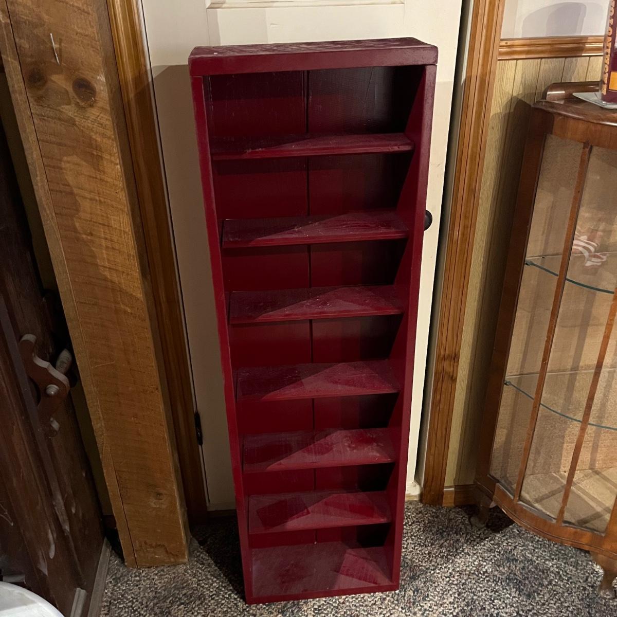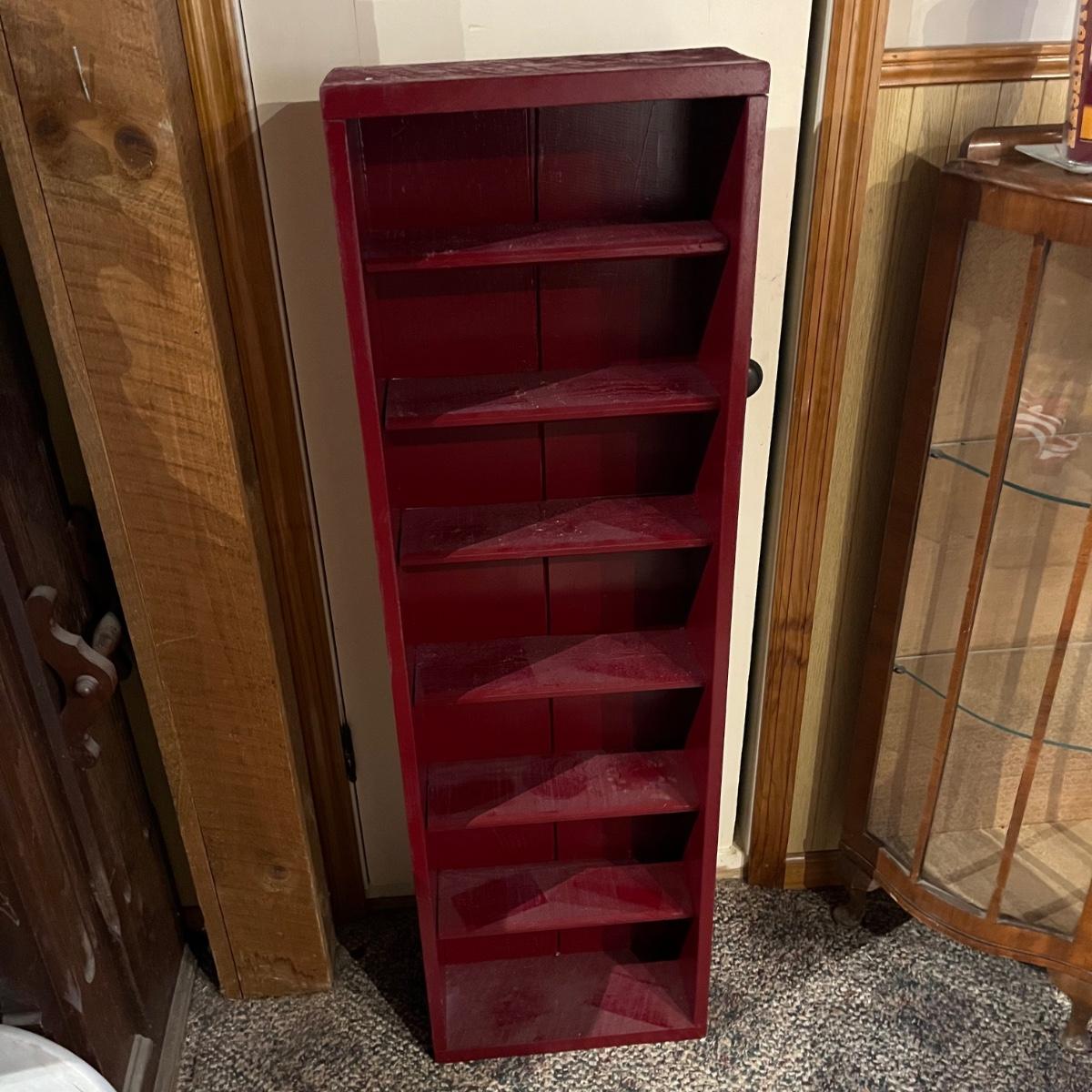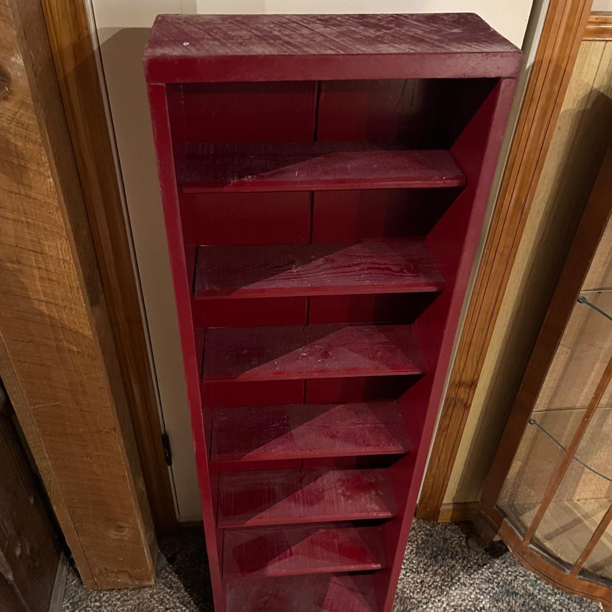Lot includes a wooden display with seven shelves. Unit measures 6.75” x 15.75” x 51.5”.