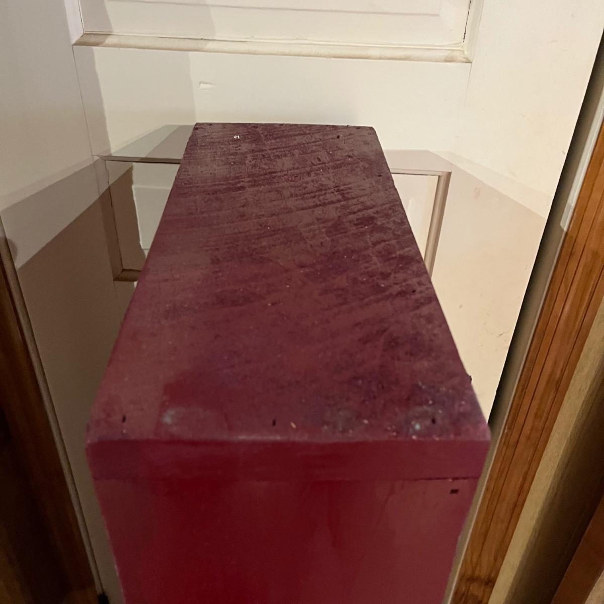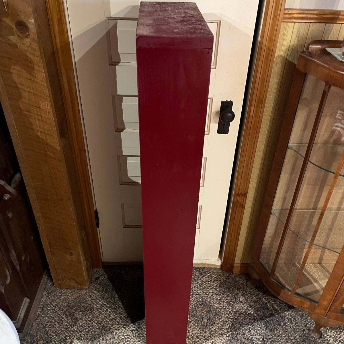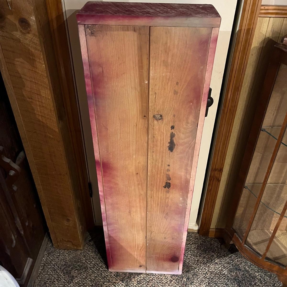 Lot includes a wooden display with seven shelves. Unit measures 6.75” x 15.75” x 51.5”.