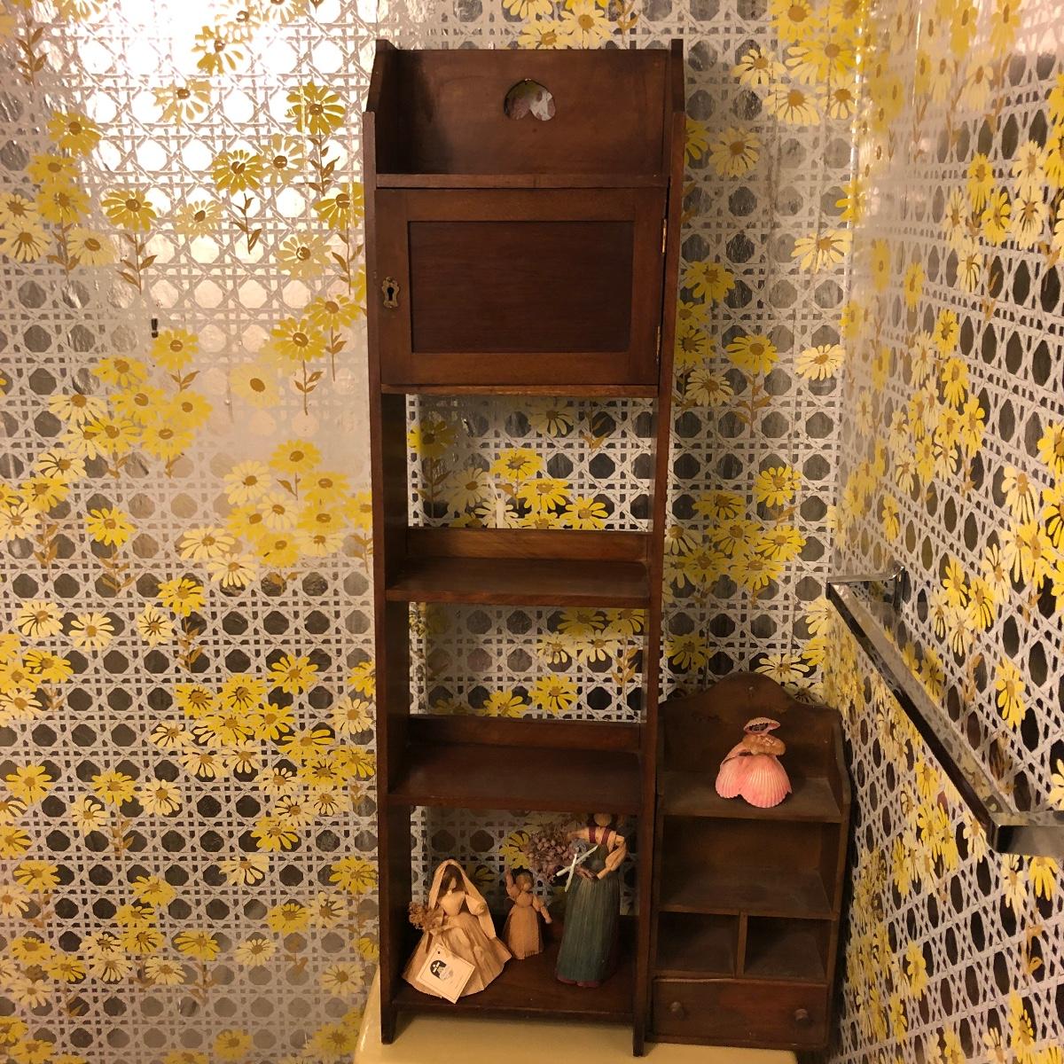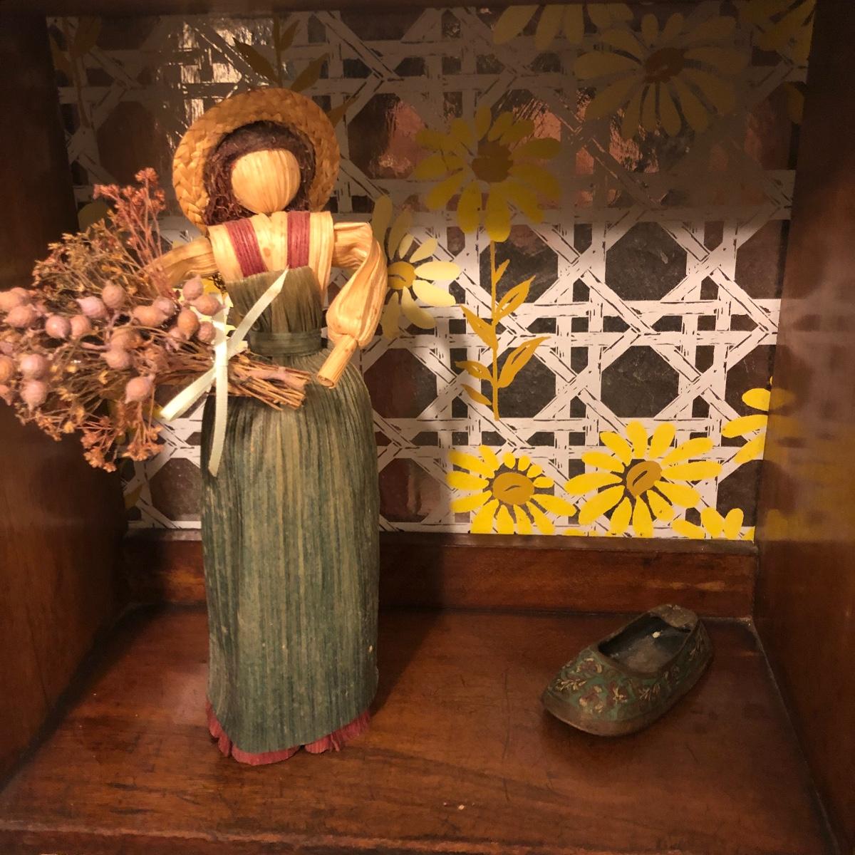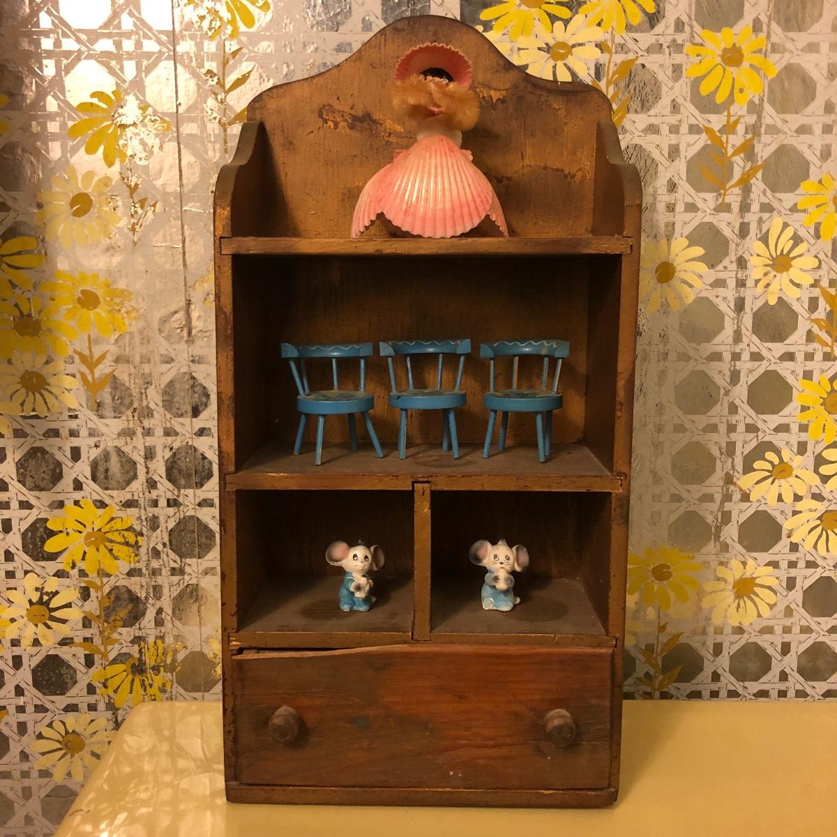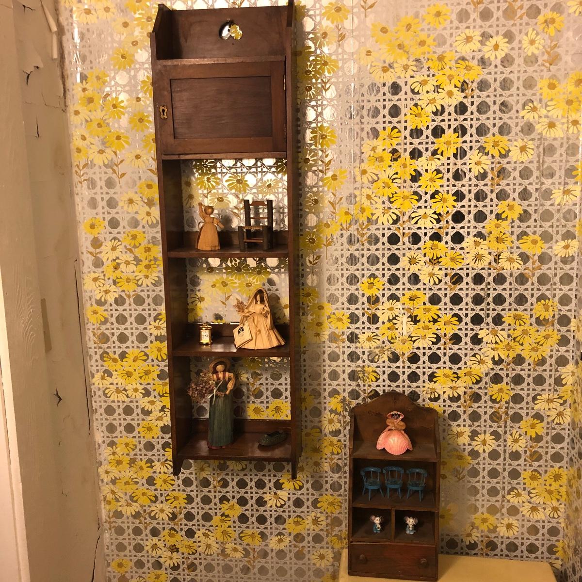 Lot includes two wooden display shelves. One shelf has four shelves with a locking cabinet and one piece has a drawer and three shelves. Also includes brass shoe ashtray, Platinum clock, three corn husk dolls, two Japanese figurines, four mini wooden chairs and a shell figurine. Clock back is not attached and lock on cabinet is in locked position with no key. Largest piece measures 6” x 12” x 44”.