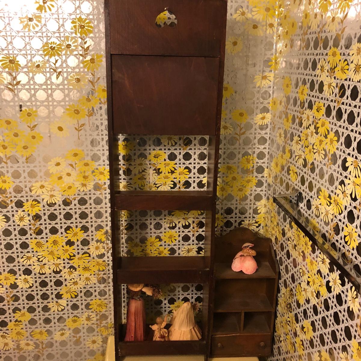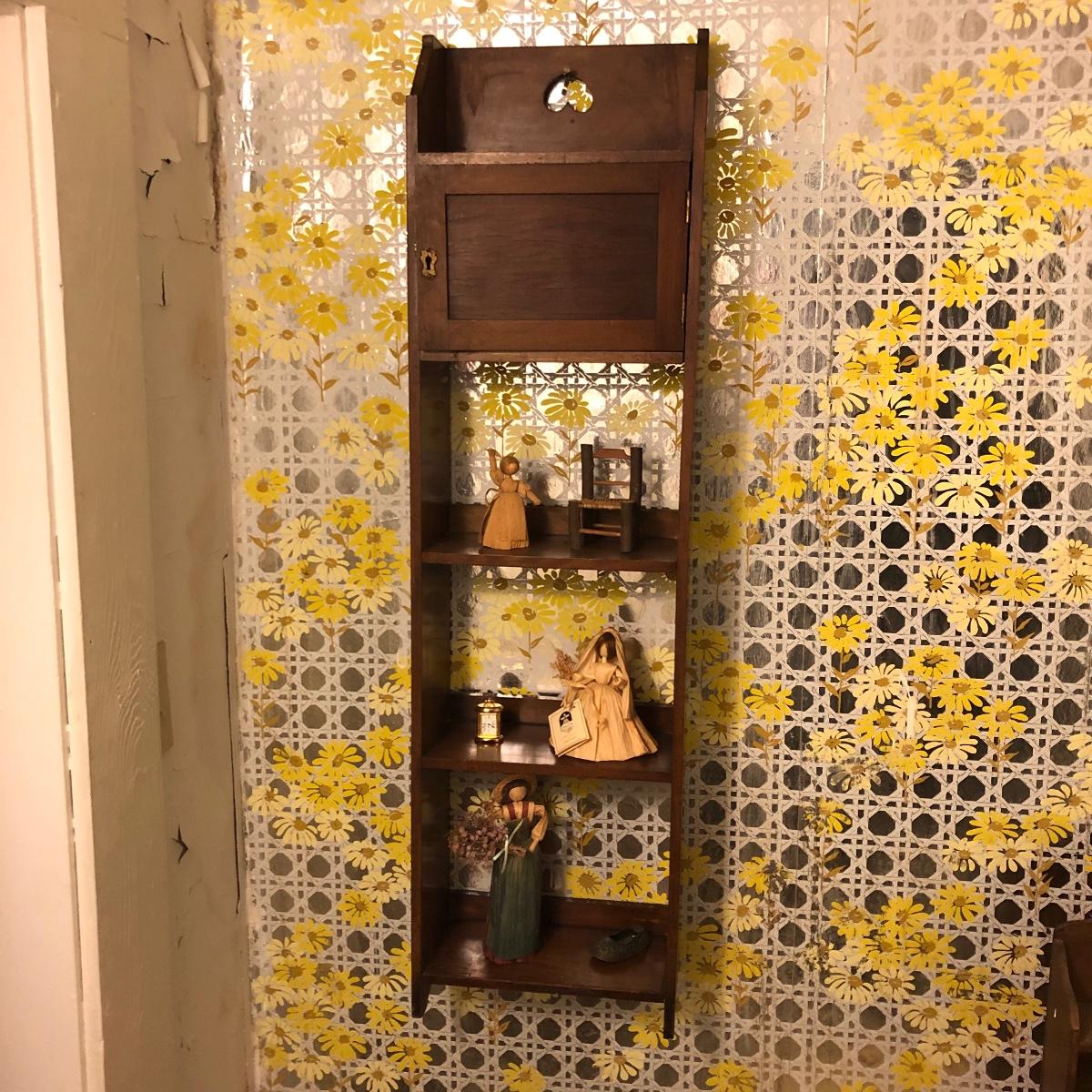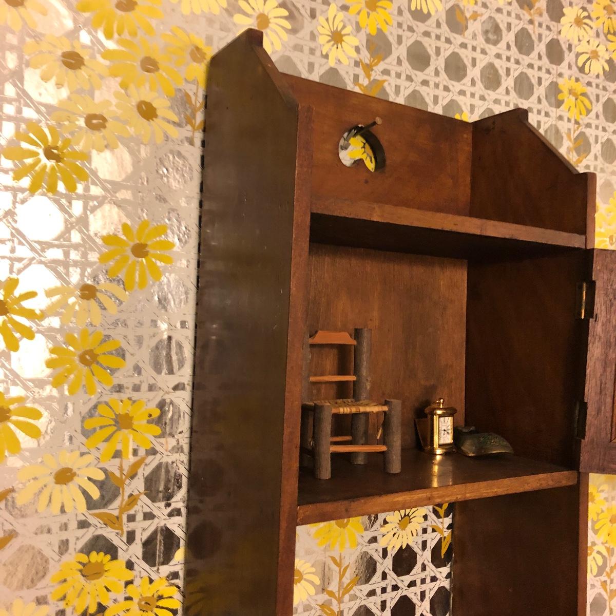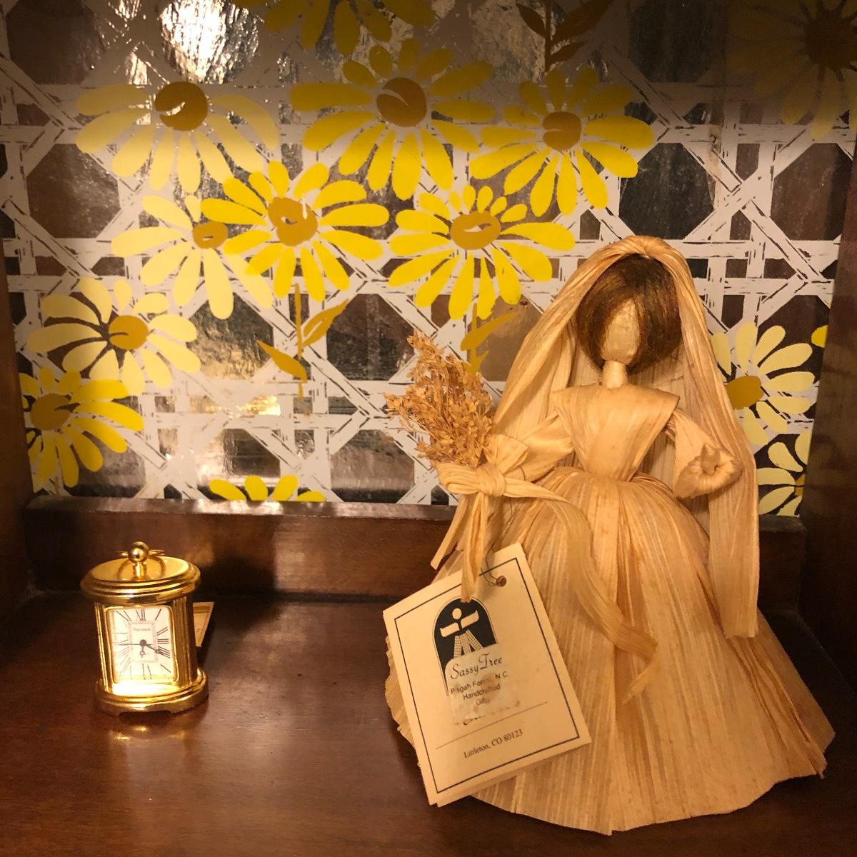Lot includes two wooden display shelves. One shelf has four shelves with a locking cabinet and one piece has a drawer and three shelves. Also includes brass shoe ashtray, Platinum clock, three corn husk dolls, two Japanese figurines, four mini wooden chairs and a shell figurine. Clock back is not attached and lock on cabinet is in locked position with no key. Largest piece measures 6” x 12” x 44”.