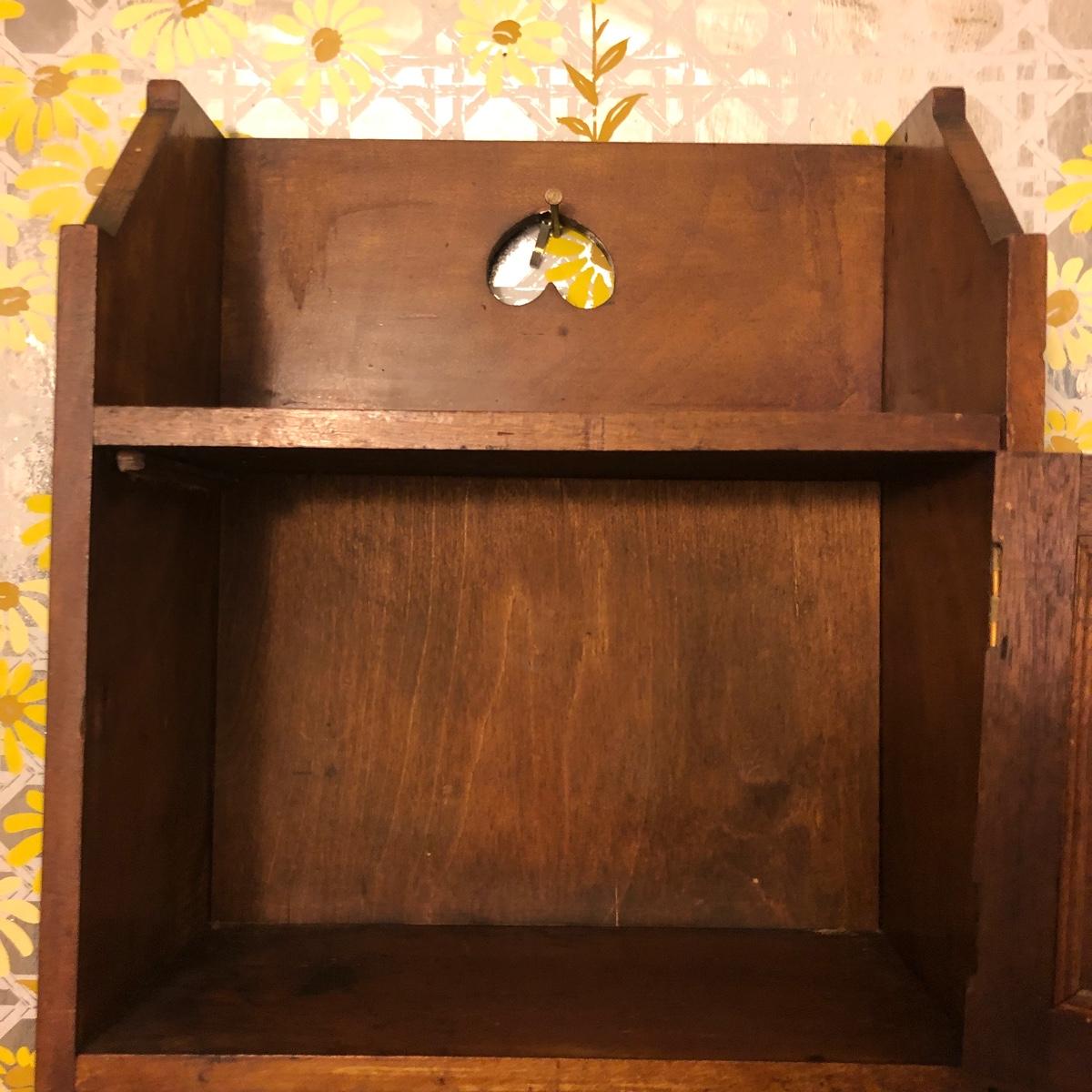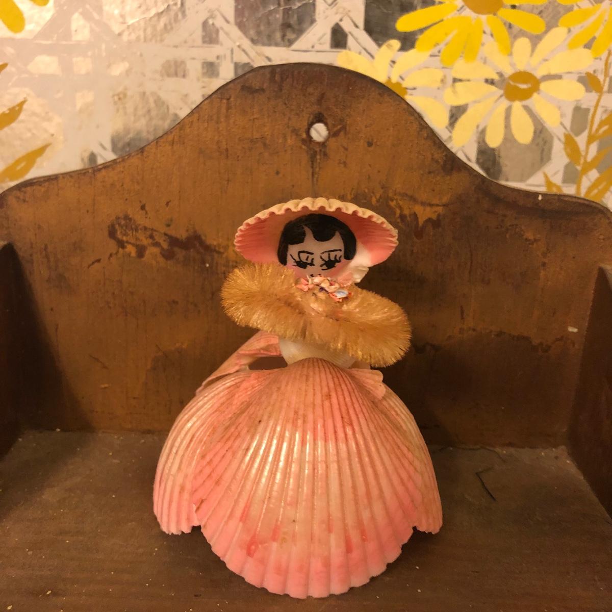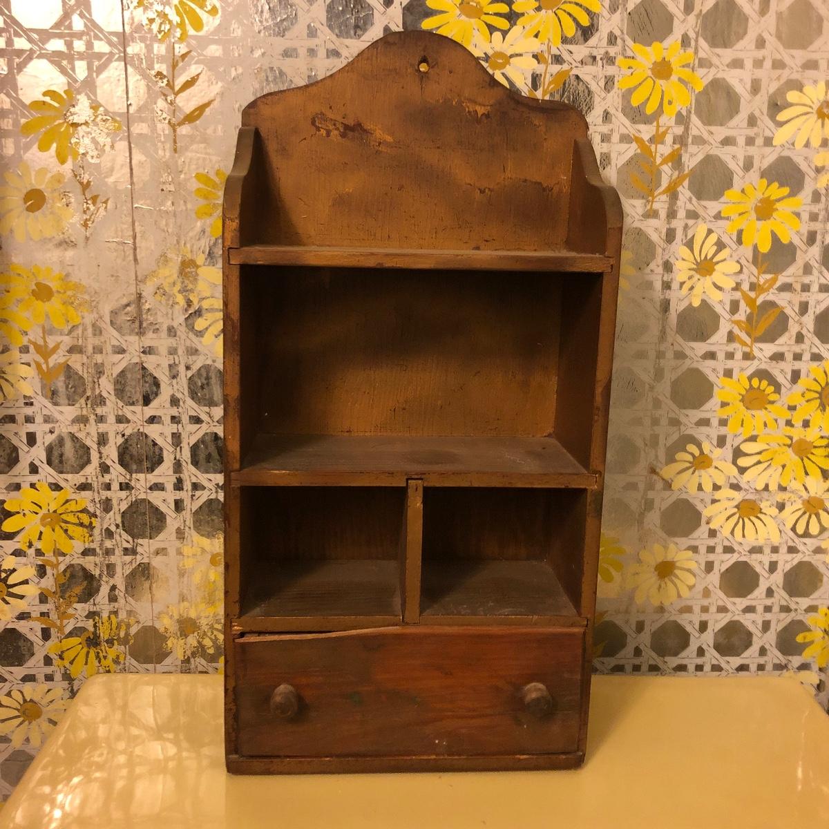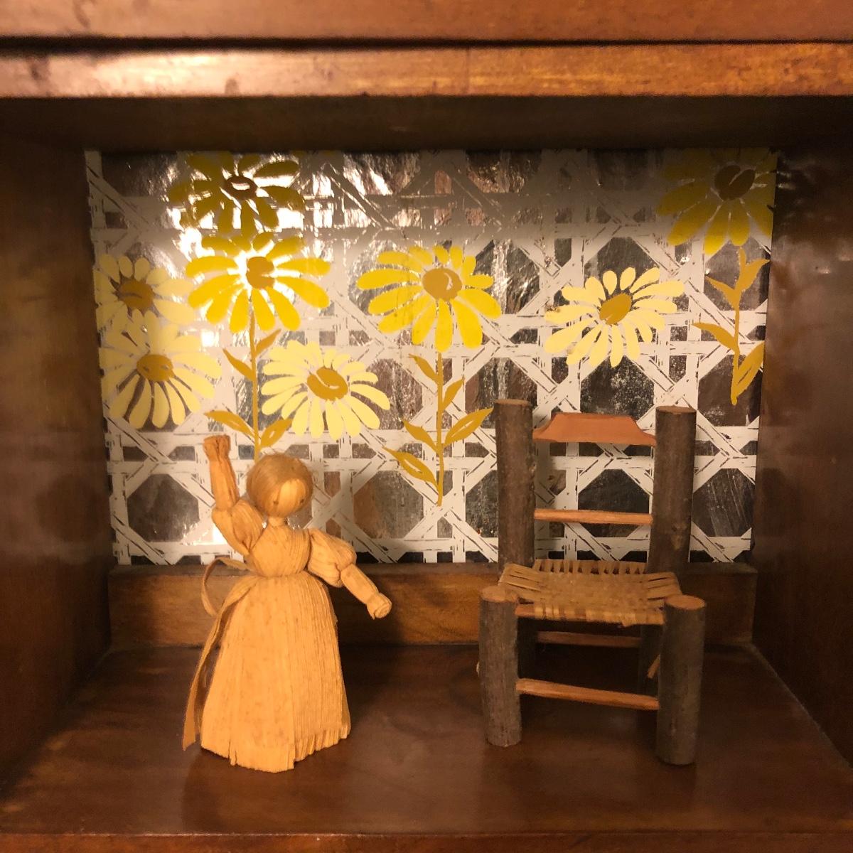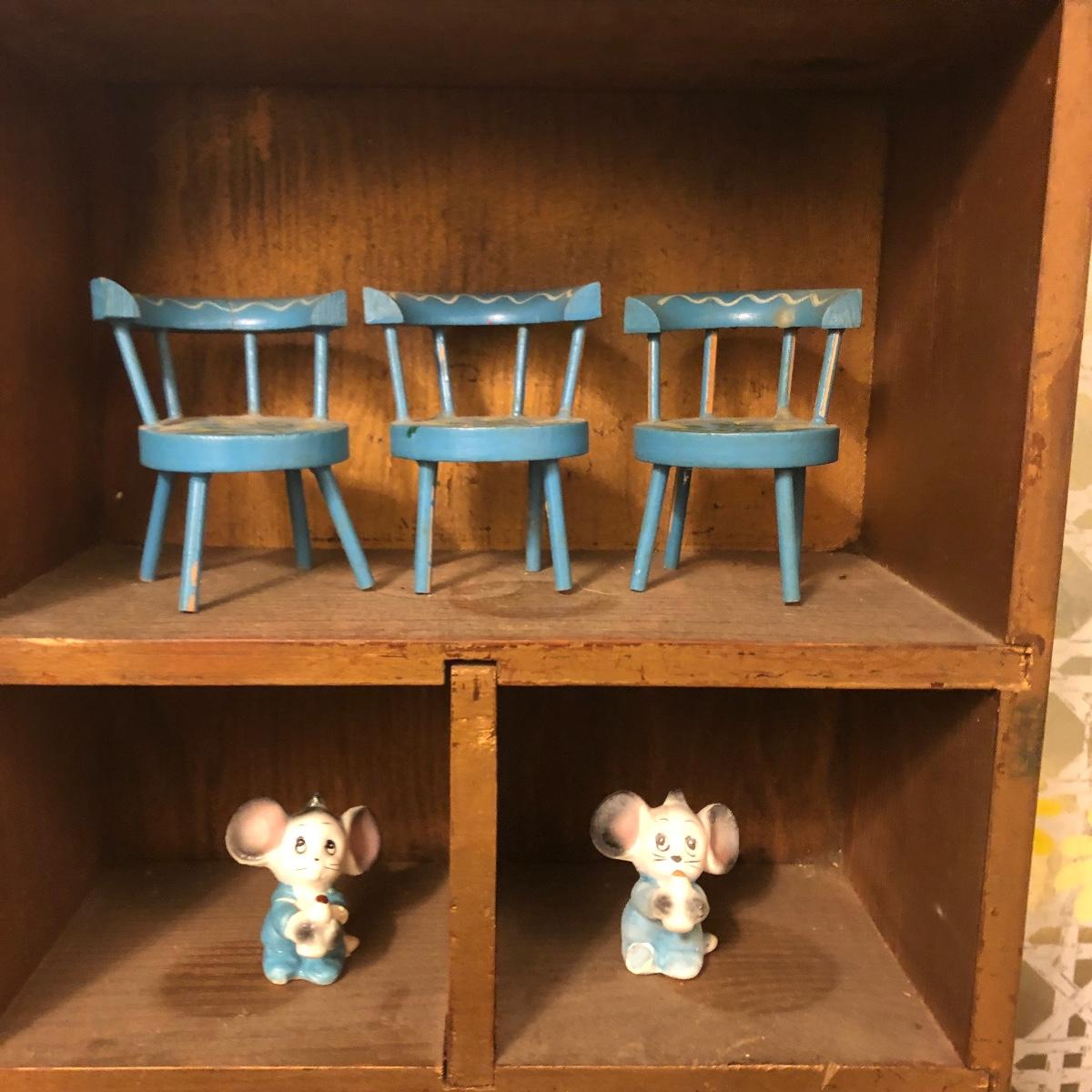 Lot includes two wooden display shelves. One shelf has four shelves with a locking cabinet and one piece has a drawer and three shelves. Also includes brass shoe ashtray, Platinum clock, three corn husk dolls, two Japanese figurines, four mini wooden chairs and a shell figurine. Clock back is not attached and lock on cabinet is in locked position with no key. Largest piece measures 6” x 12” x 44”.