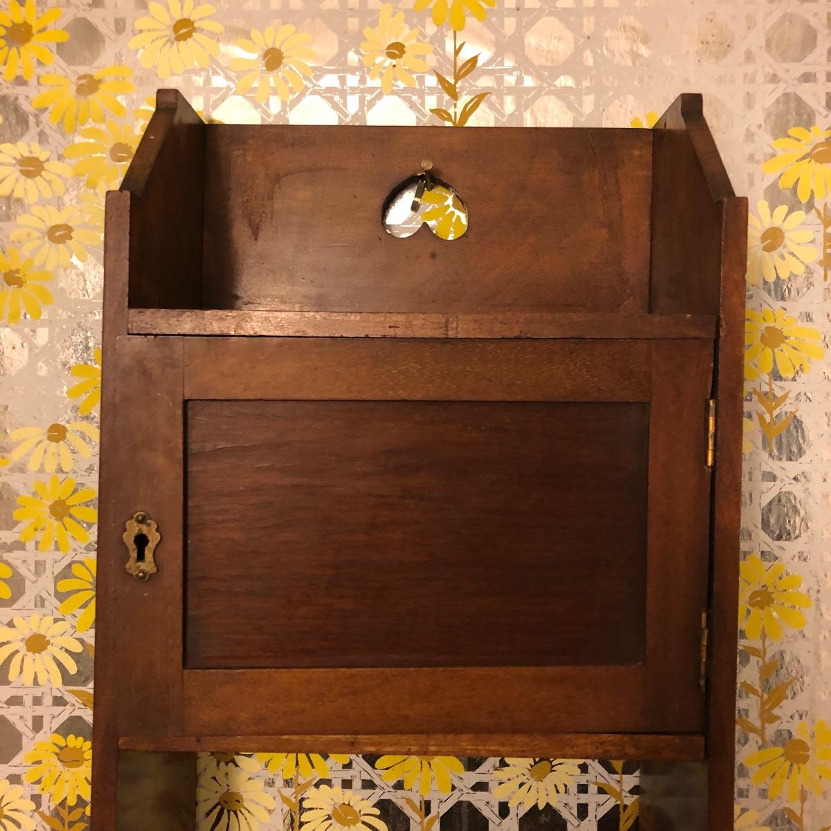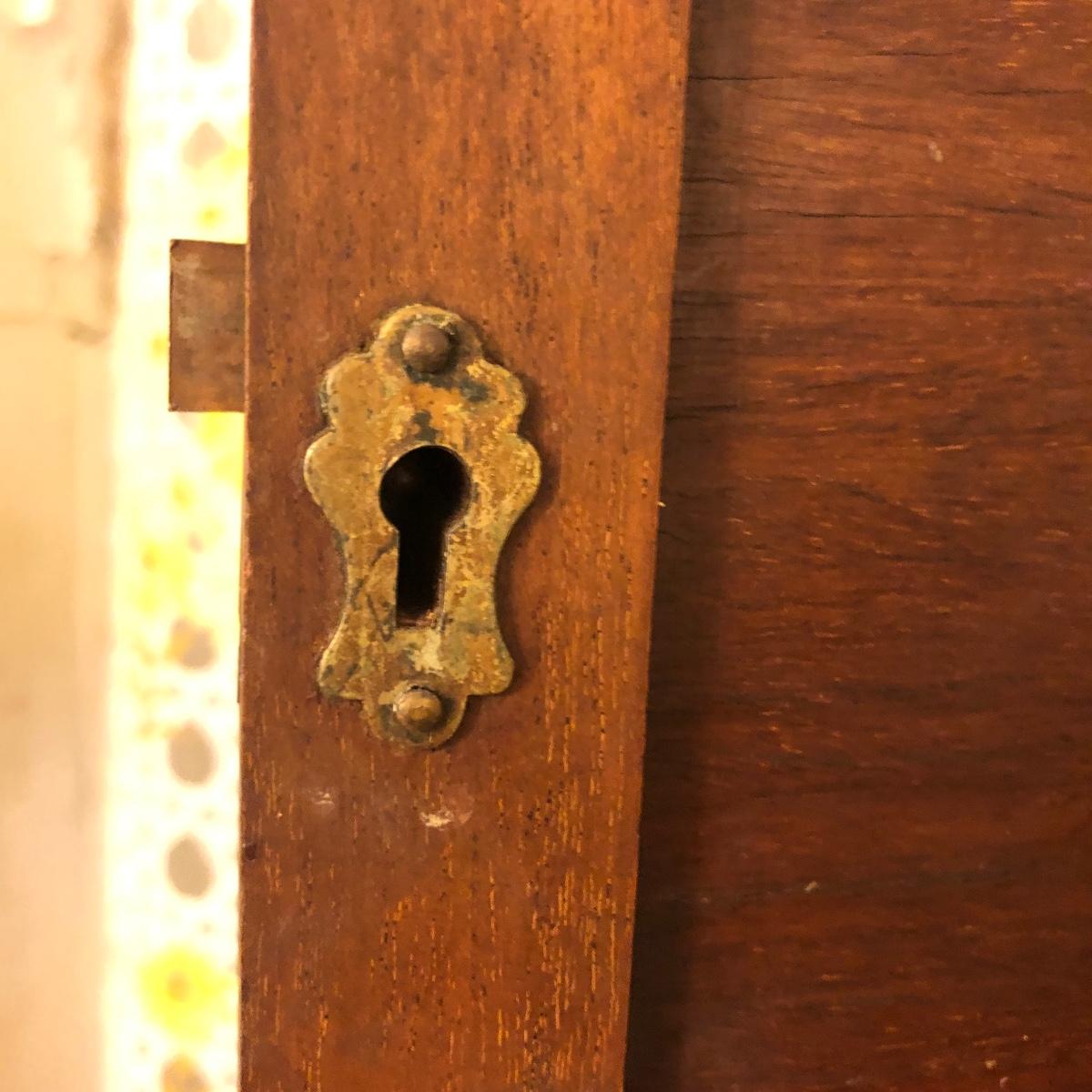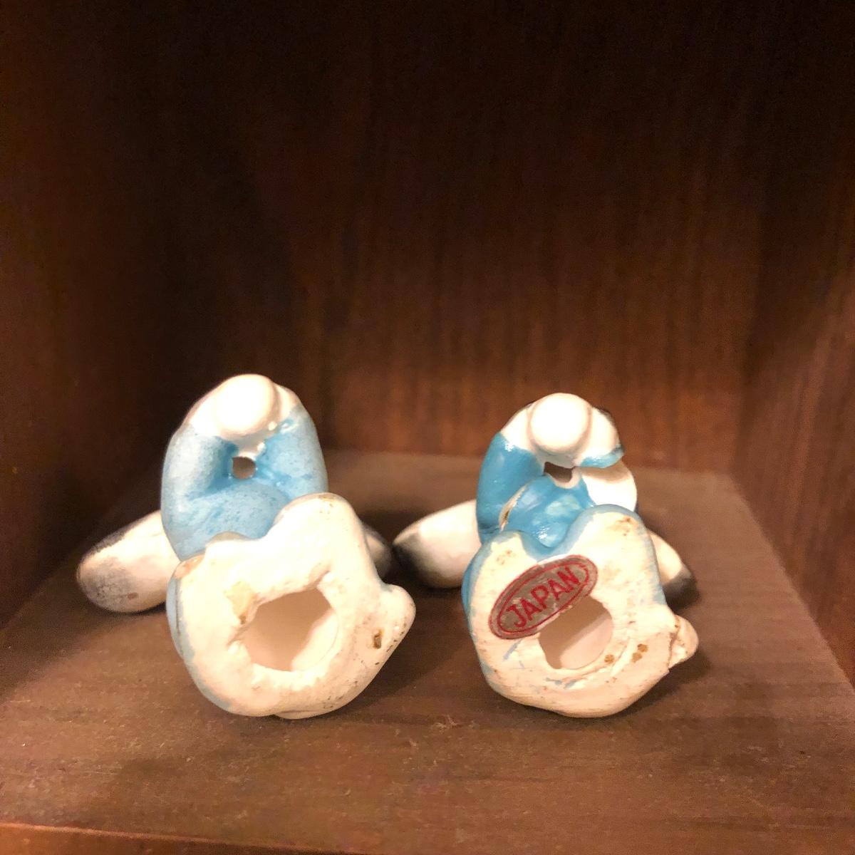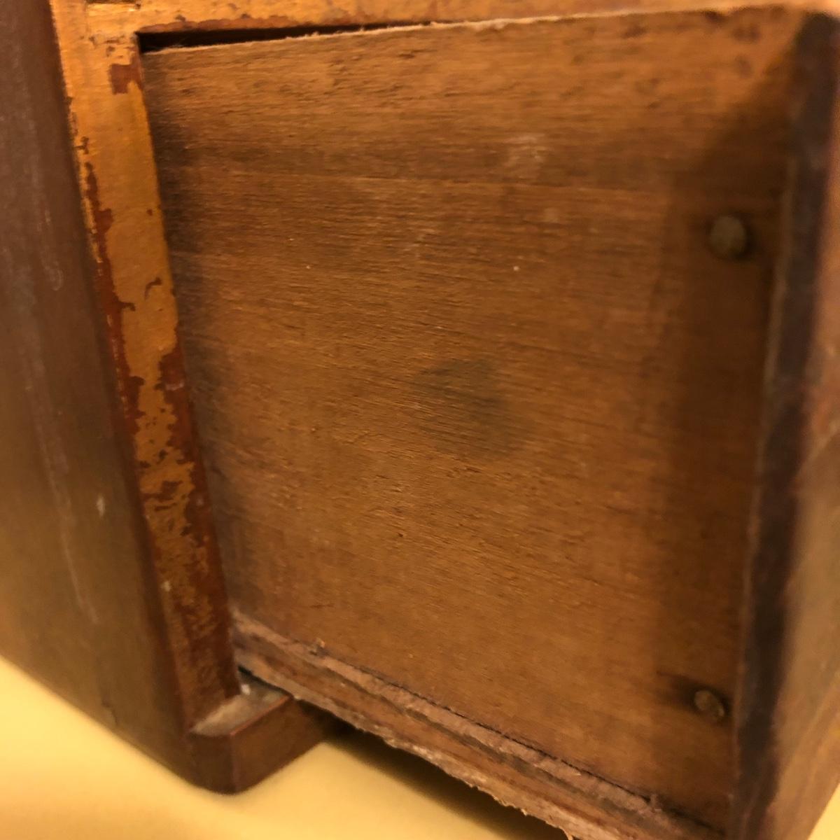 Lot includes two wooden display shelves. One shelf has four shelves with a locking cabinet and one piece has a drawer and three shelves. Also includes brass shoe ashtray, Platinum clock, three corn husk dolls, two Japanese figurines, four mini wooden chairs and a shell figurine. Clock back is not attached and lock on cabinet is in locked position with no key. Largest piece measures 6” x 12” x 44”.