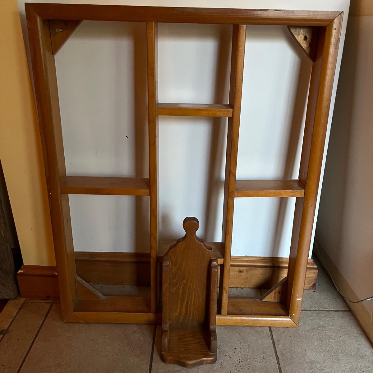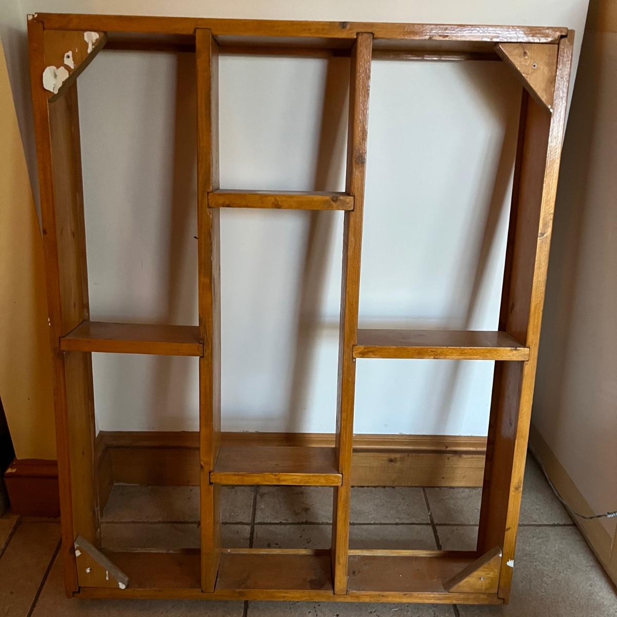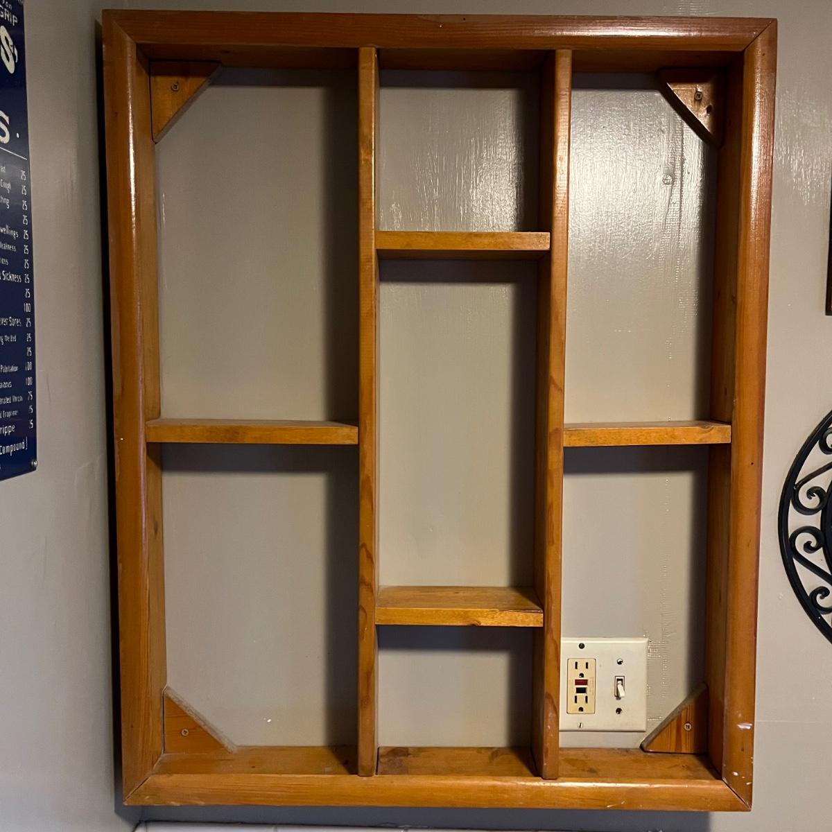 Lot includes a rectangular wooden display frame and a small wooden display shelf. Largest shelf measures 27” x 33” x 4”.