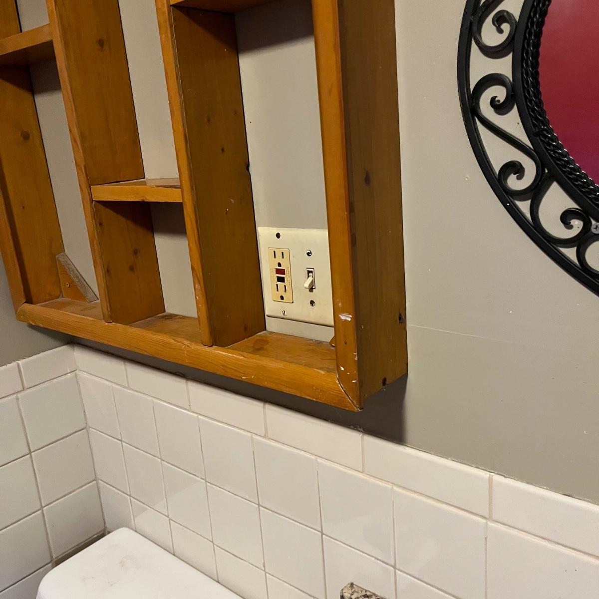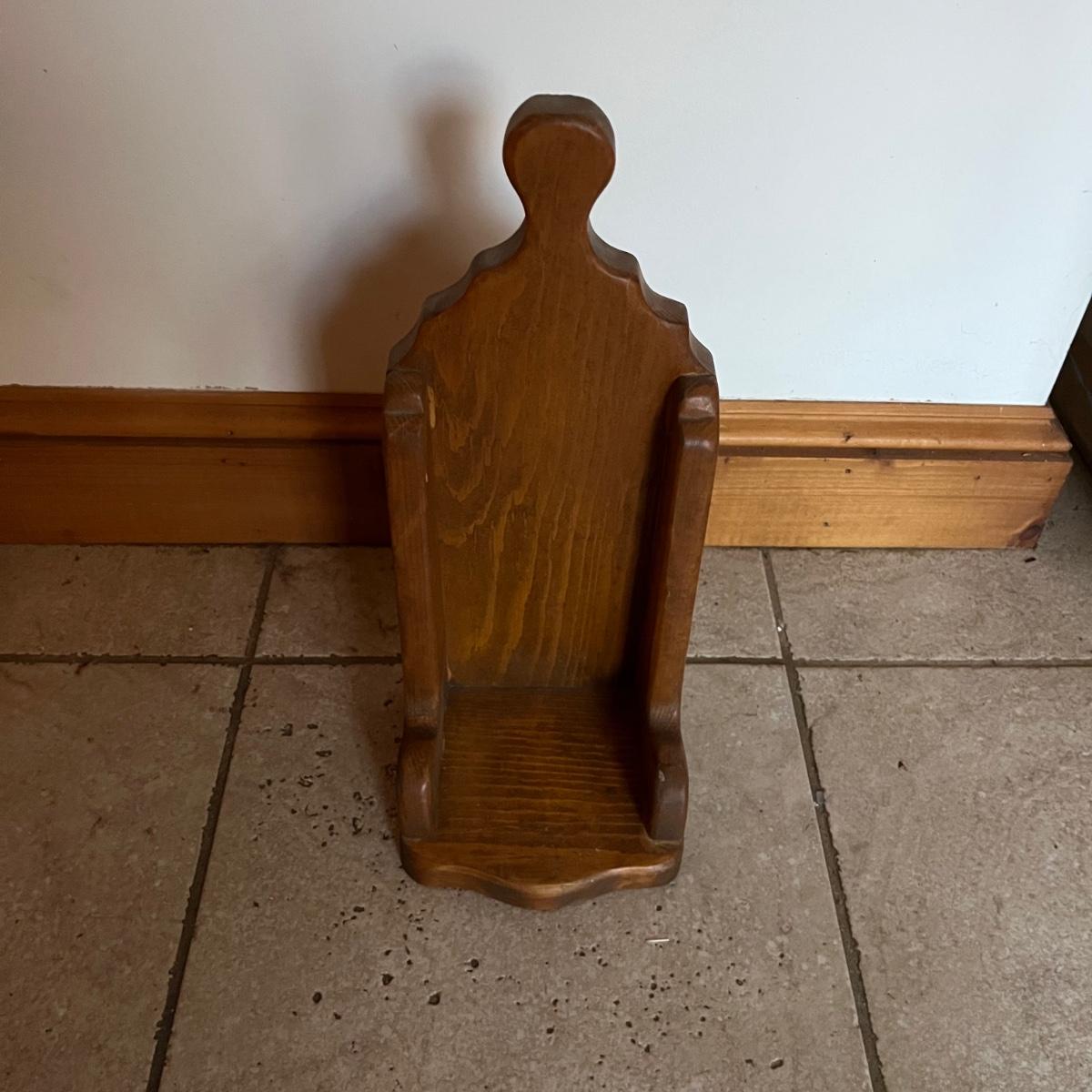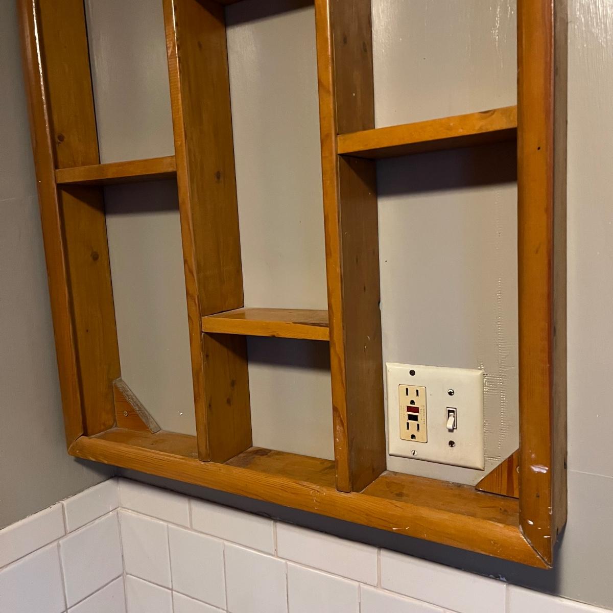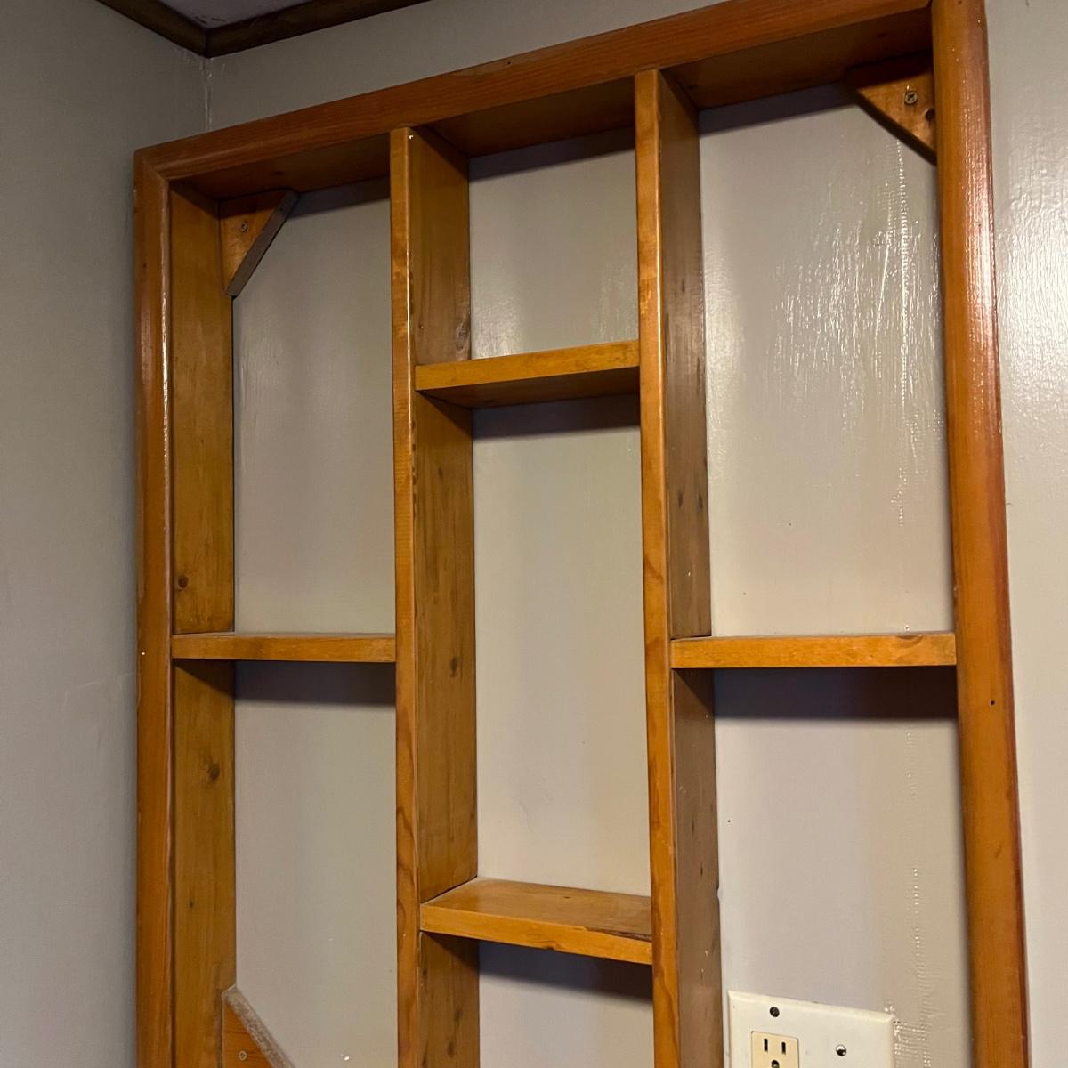 Lot includes a rectangular wooden display frame and a small wooden display shelf. Largest shelf measures 27” x 33” x 4”.