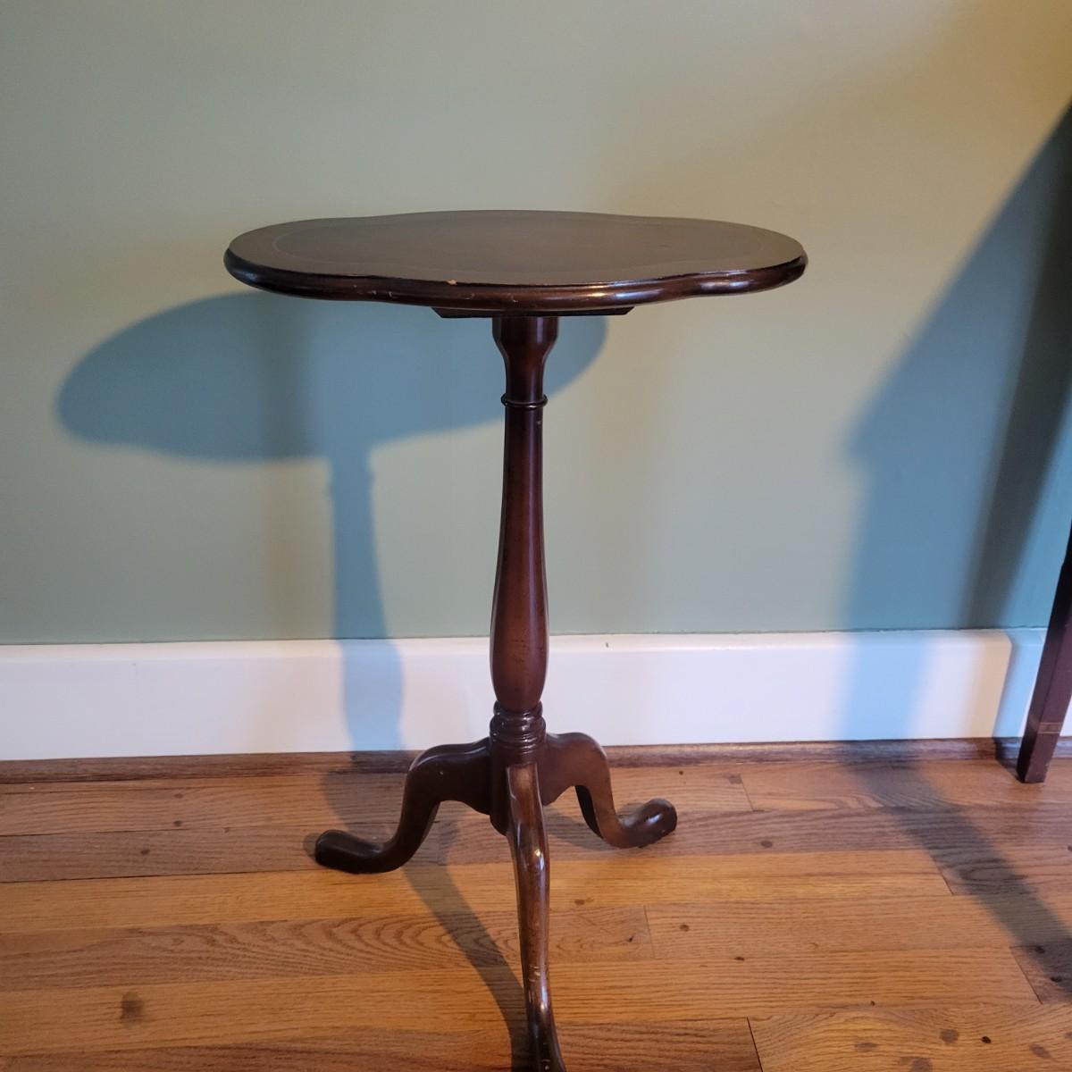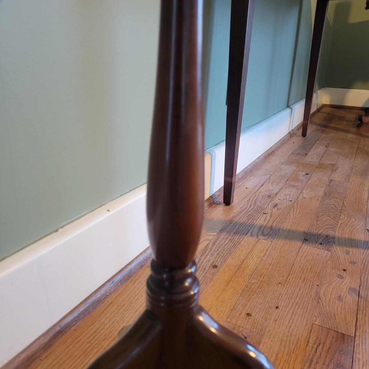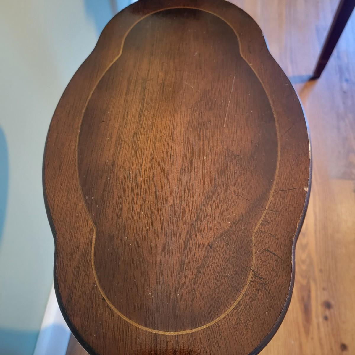 A wooden pedestal wine table in good condition with a few minor blemishes. This piece has a glossy dark stain and a small inlaid line on its top with scalloped edges. Measures approximately 14" x 8.5" x 22". Local pickup only