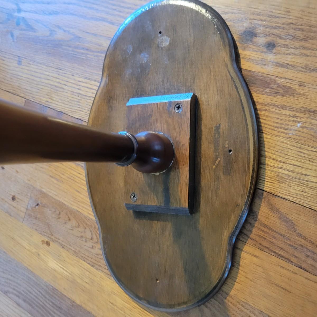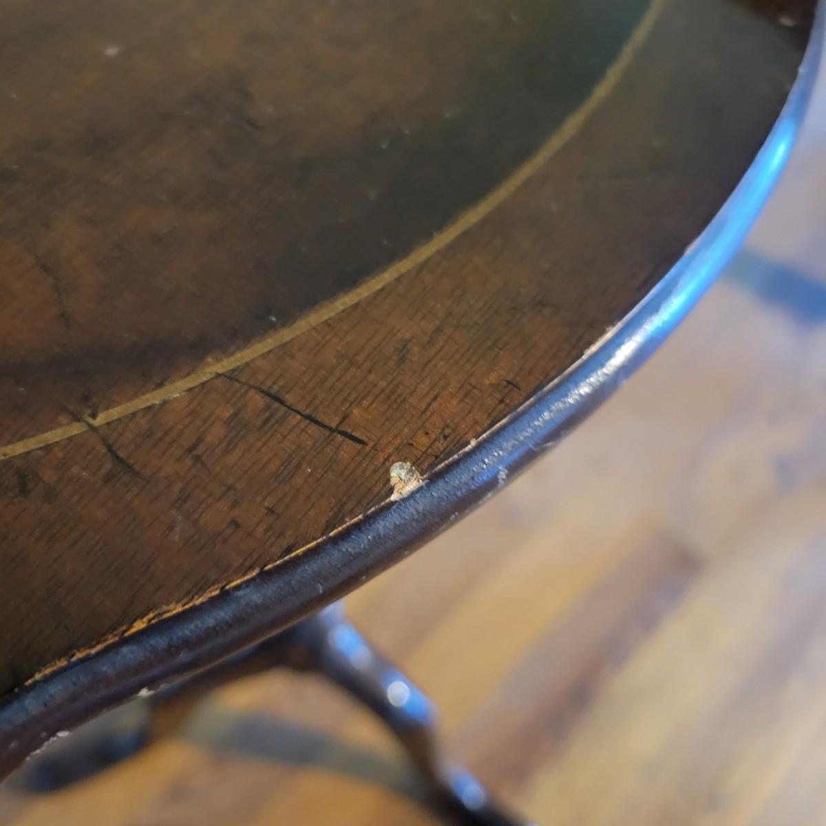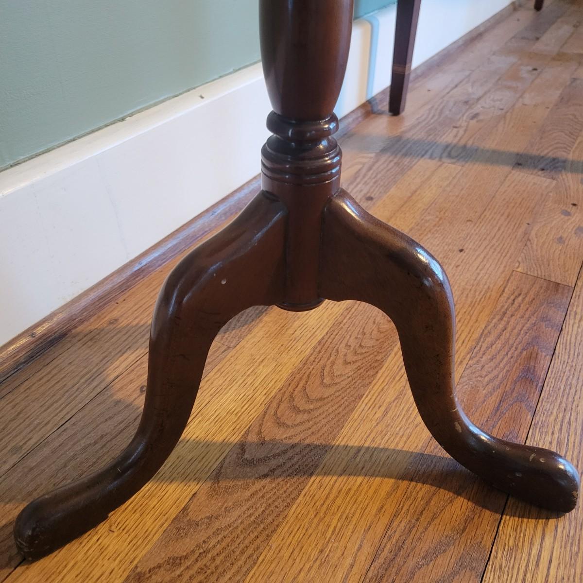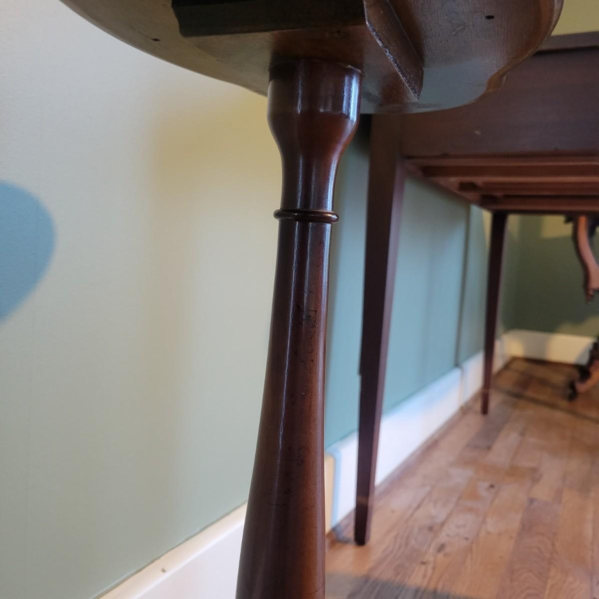 A wooden pedestal wine table in good condition with a few minor blemishes. This piece has a glossy dark stain and a small inlaid line on its top with scalloped edges. Measures approximately 14" x 8.5" x 22". Local pickup only