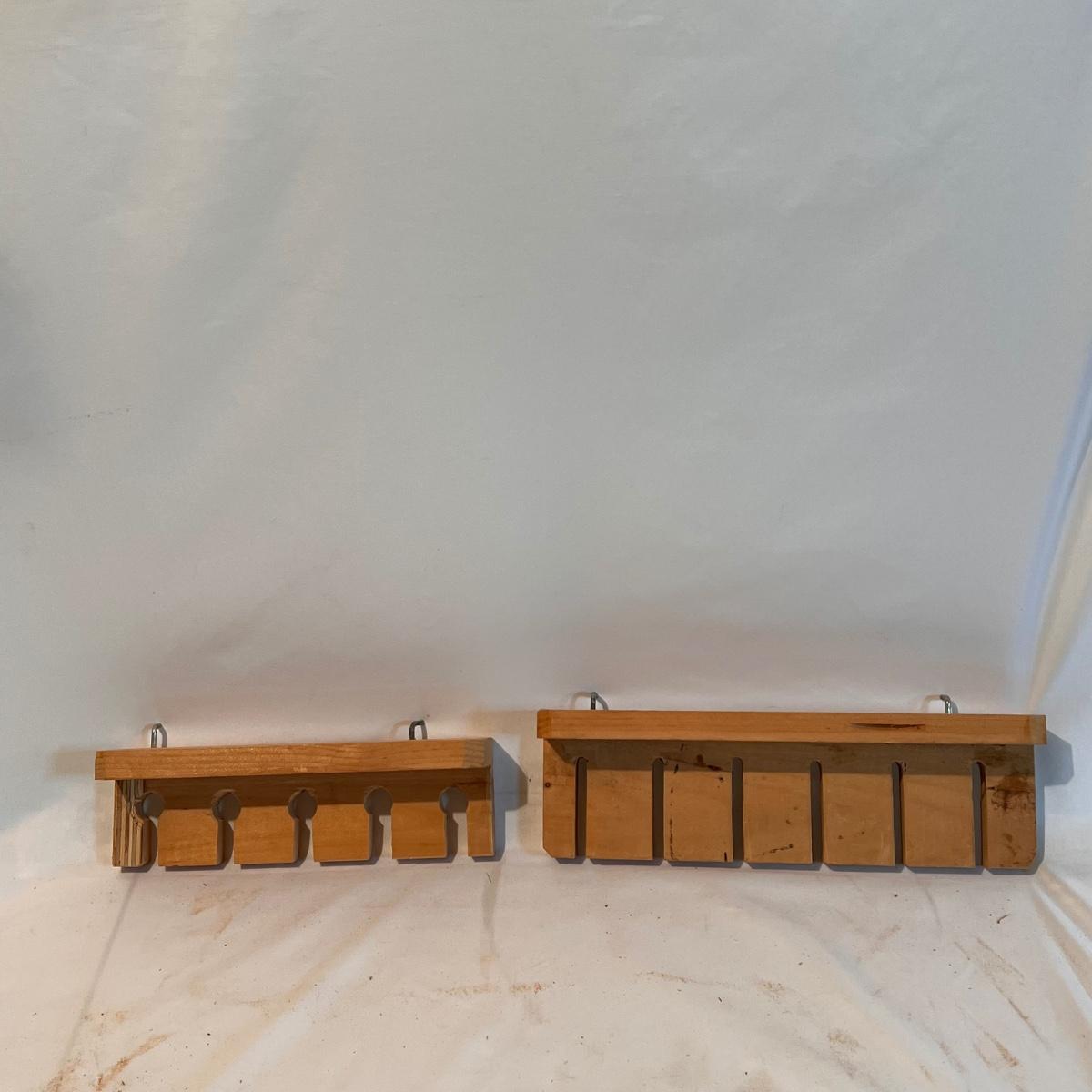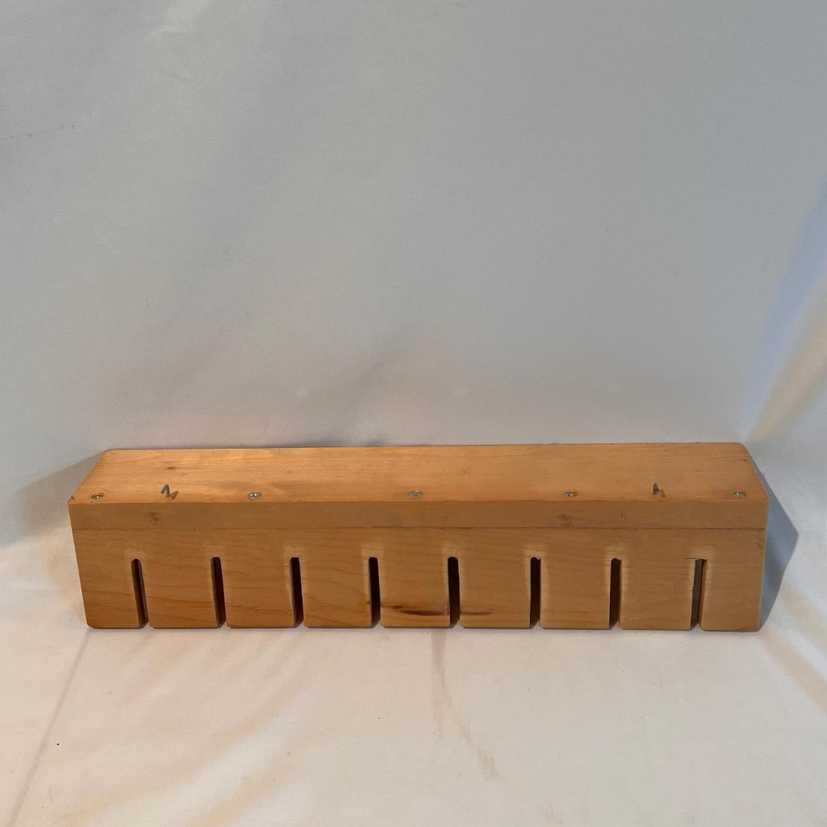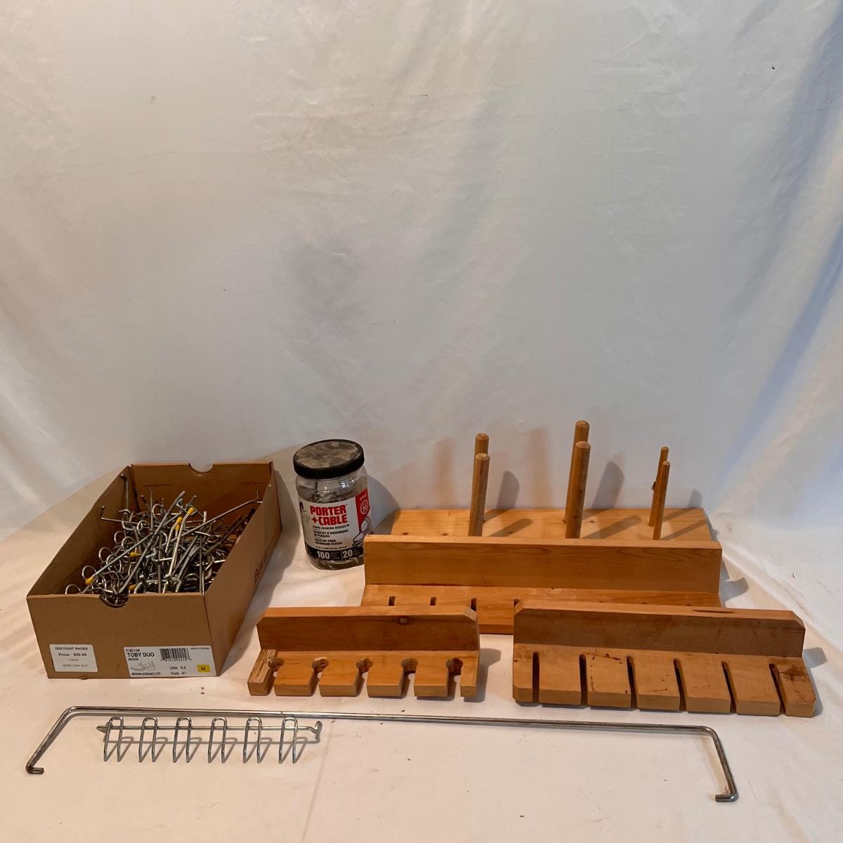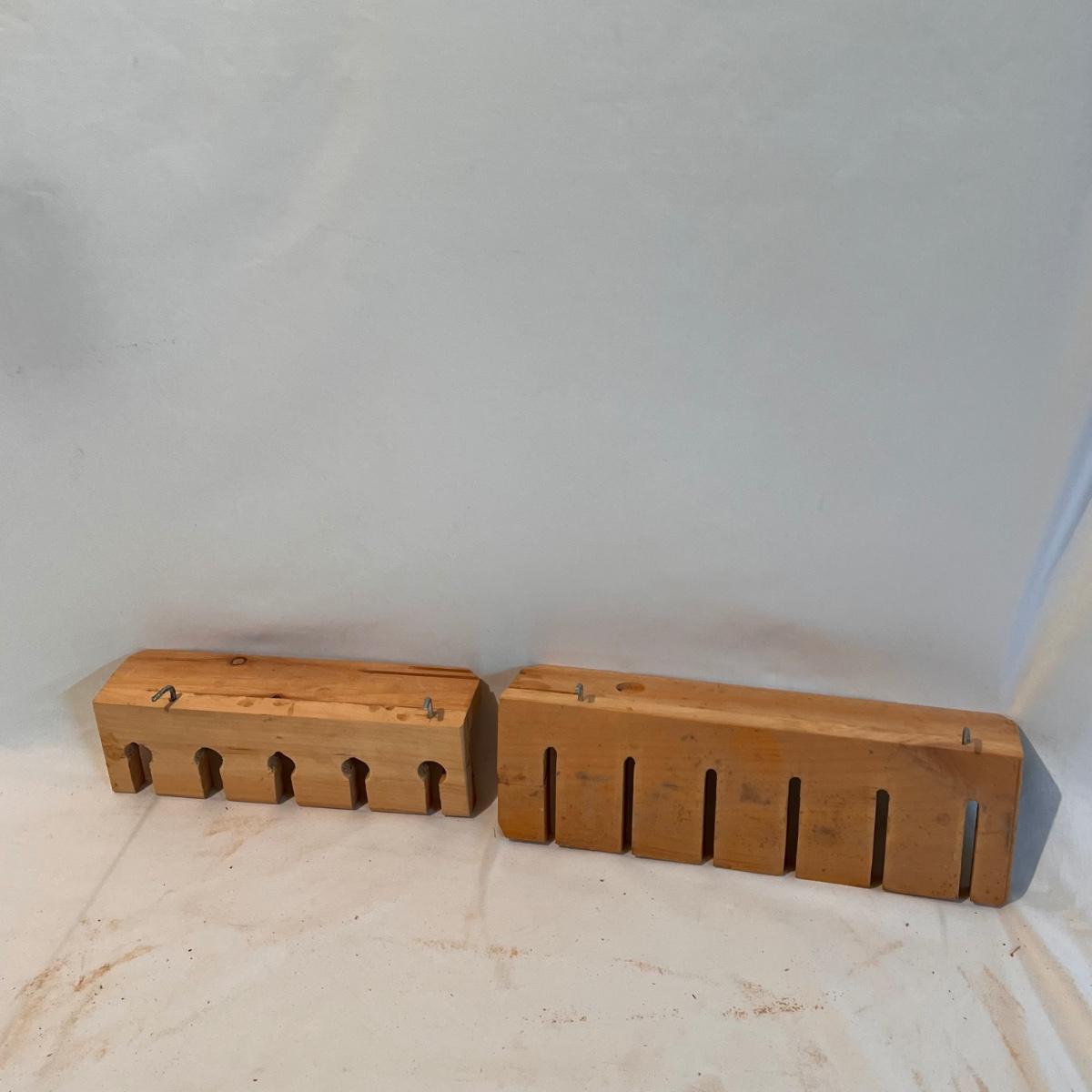 This lot includes four wooden display boards (that have peg board hooks to attach them) and several variously sized metal peg board hooks. The largest display board measures 17” x 4” x 3”H and the smallest 10” x 2.25” x 3”H. One of the small wooden organizers was broken after lot was created. Please see photo. Shipping available.