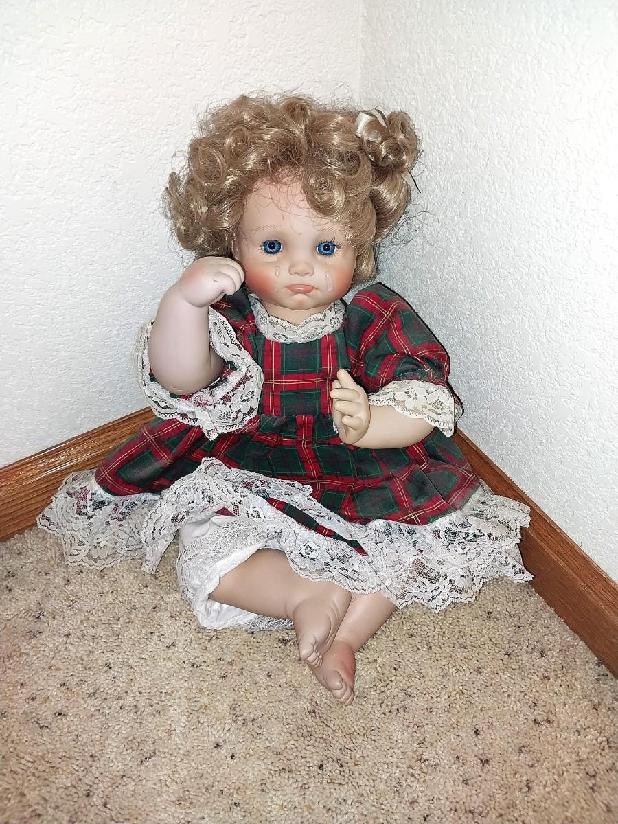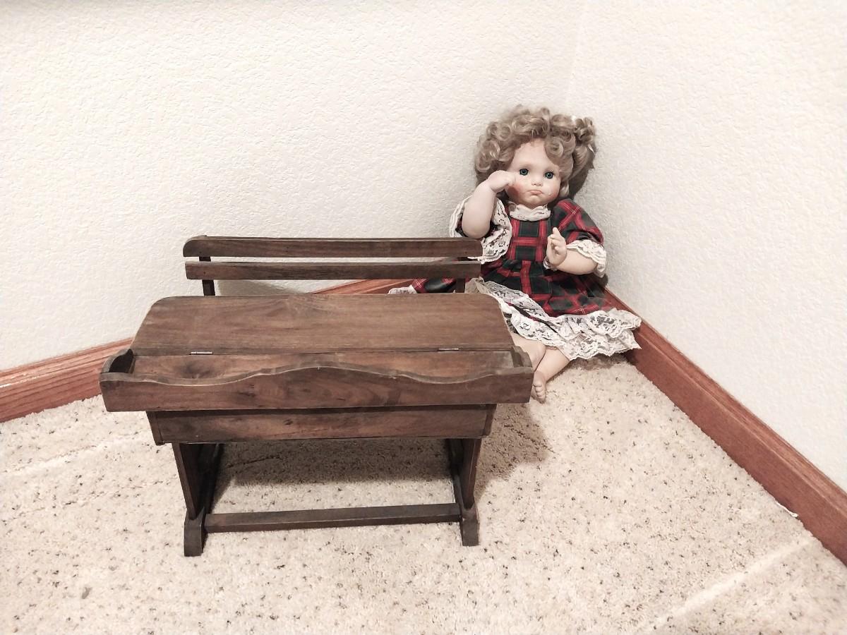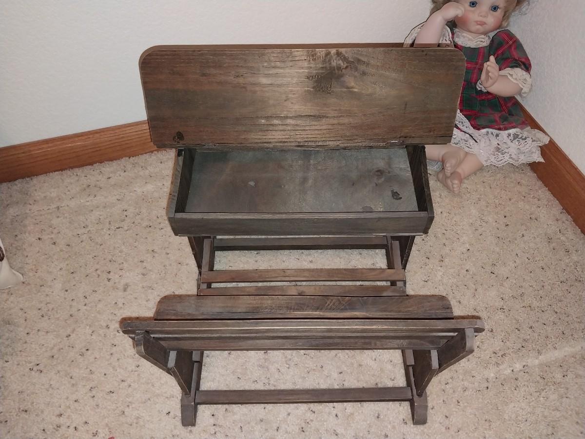 WOODEN DOLL SCHOOL DESK AND DOLL