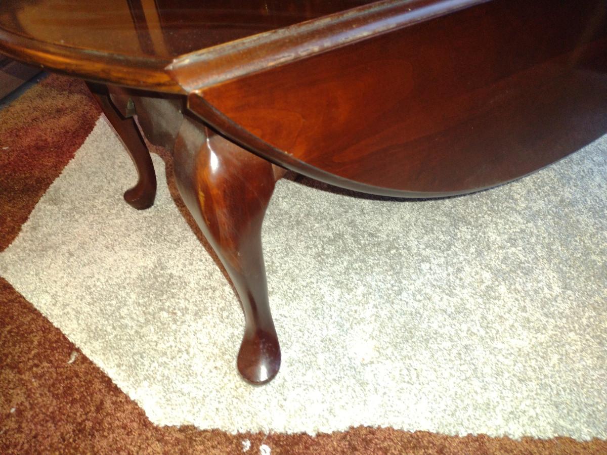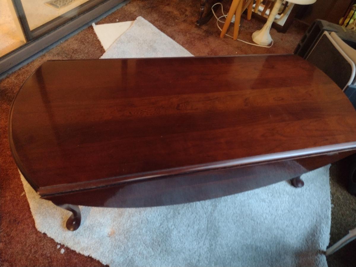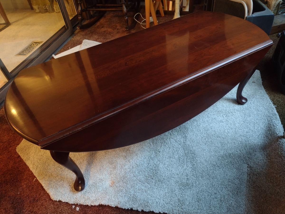 Wooden Double Drop Leaf Coffee Table. Item measures approx 47 1/2" long, 21" wide with leaves down, 37 3/4" with both leaves up.
