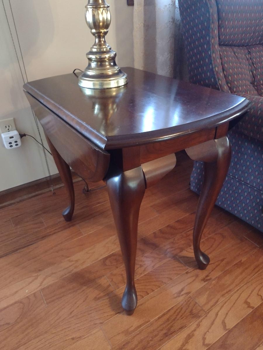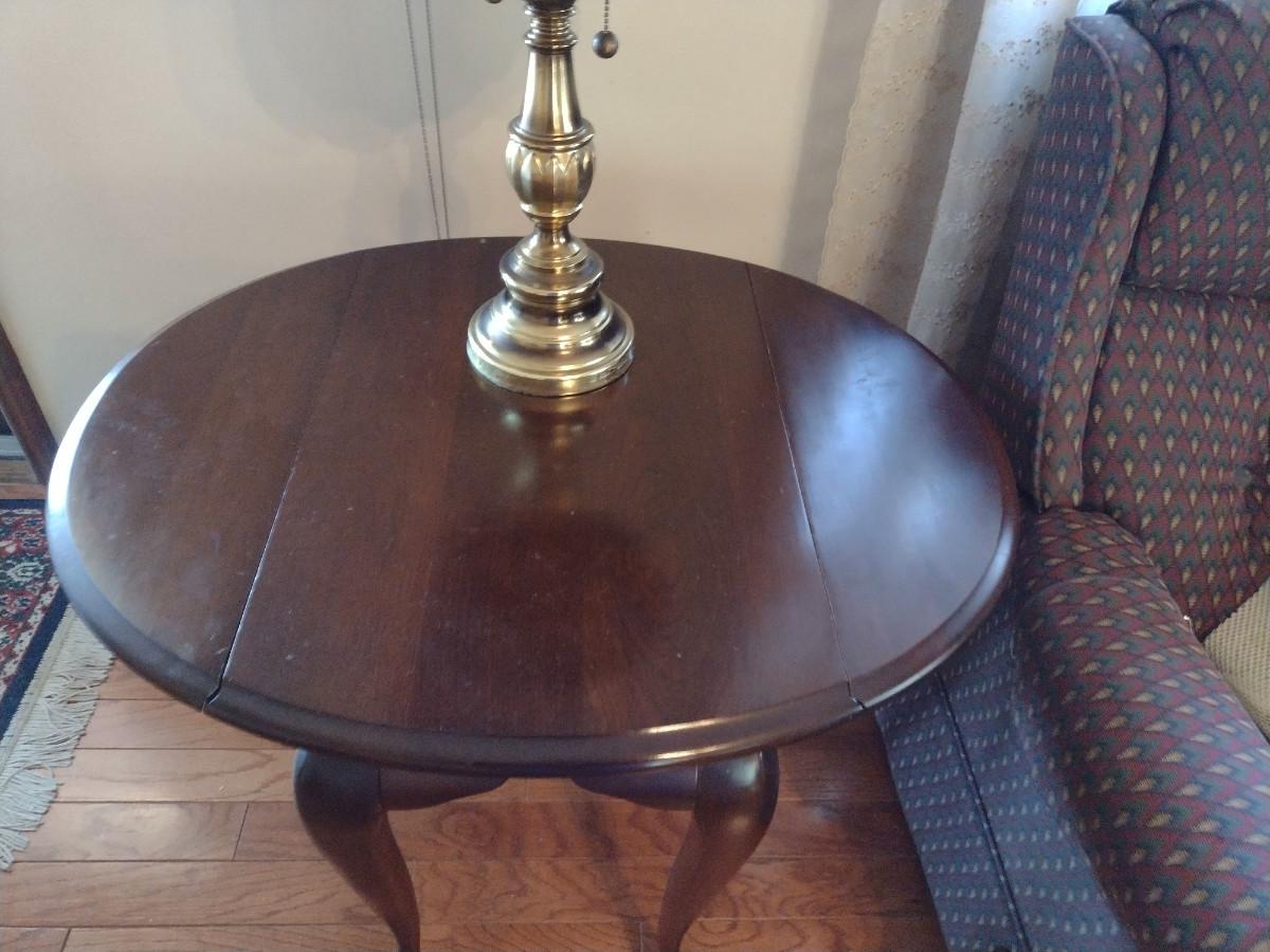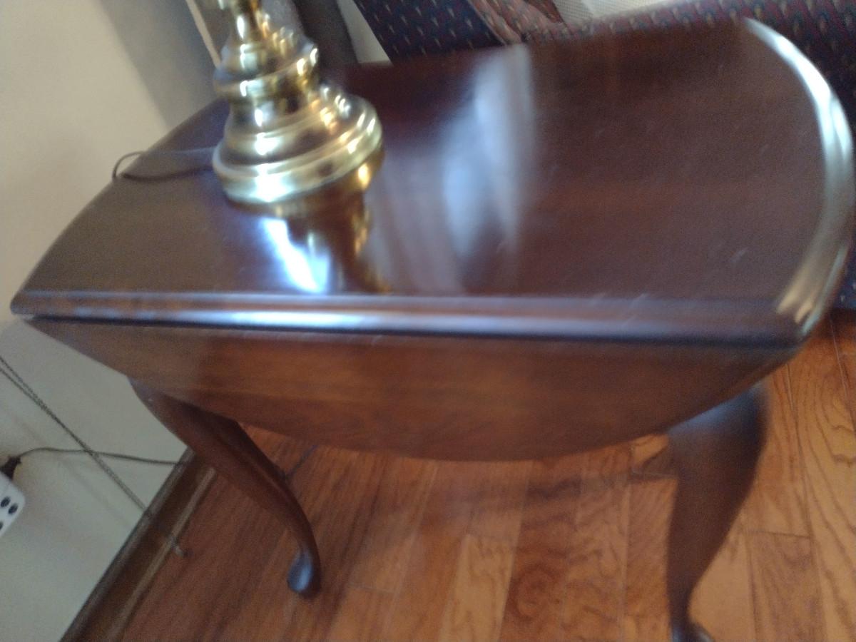Wooden Double Drop Leaf Side Table. Item measures approx 26 1/4" deep, 25" tall- 32" wide with leaves extended, 17 1/4" with leaves down. Item may have minor damage to finish.
