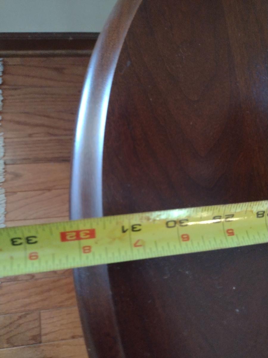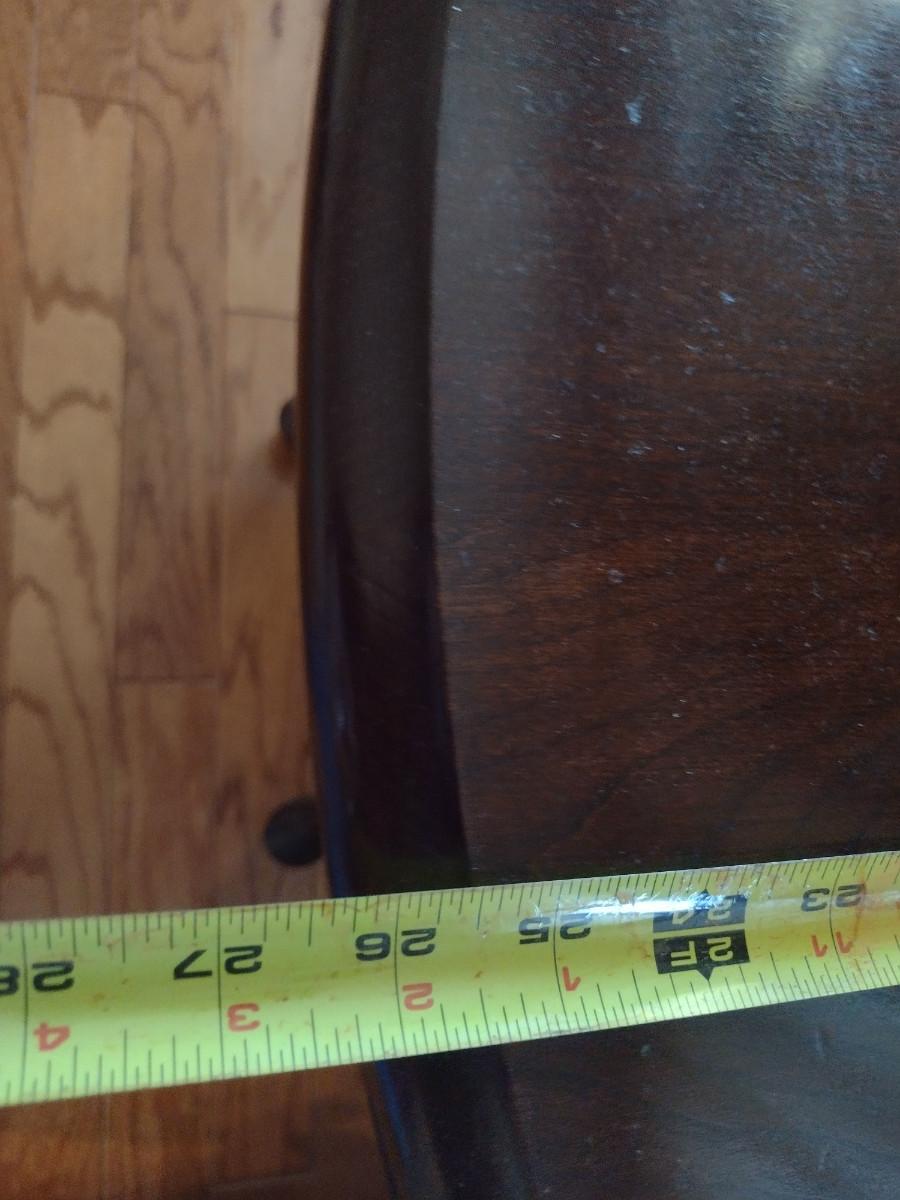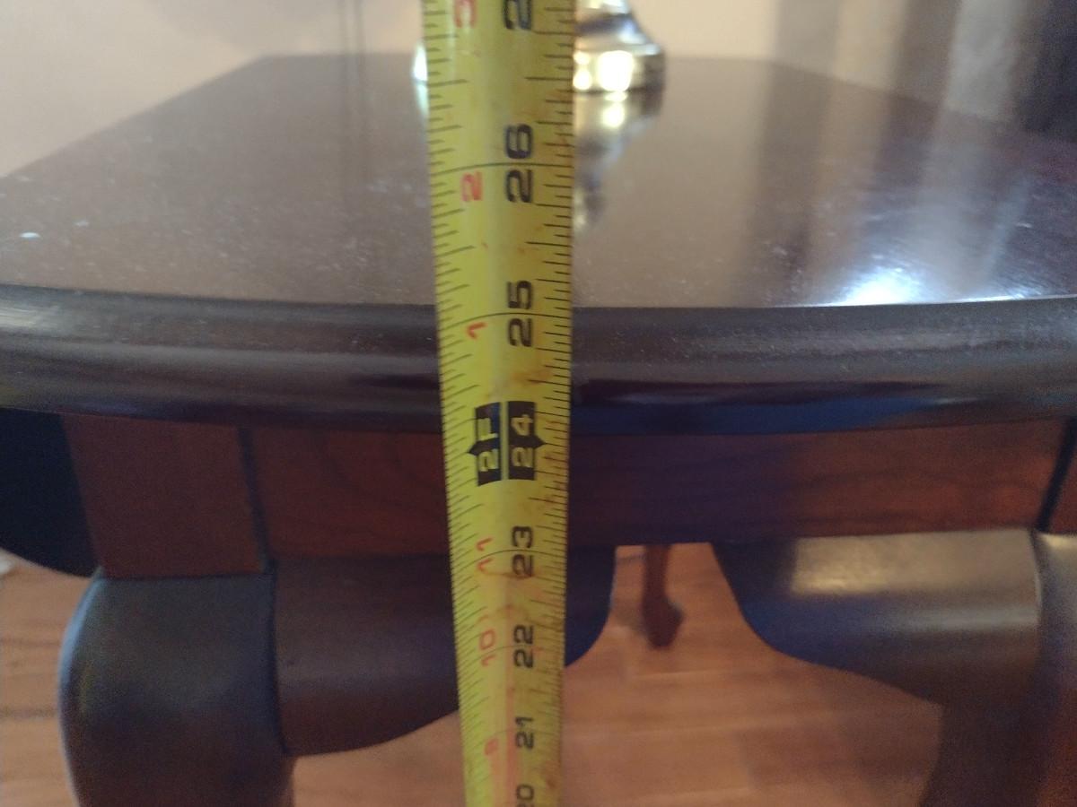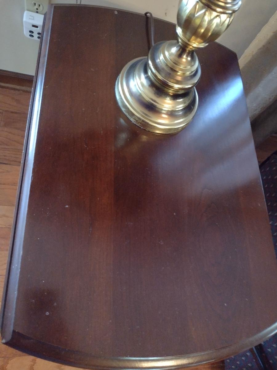 Wooden Double Drop Leaf Side Table. Item measures approx 26 1/4" deep, 25" tall- 32" wide with leaves extended, 17 1/4" with leaves down. Item may have minor damage to finish.