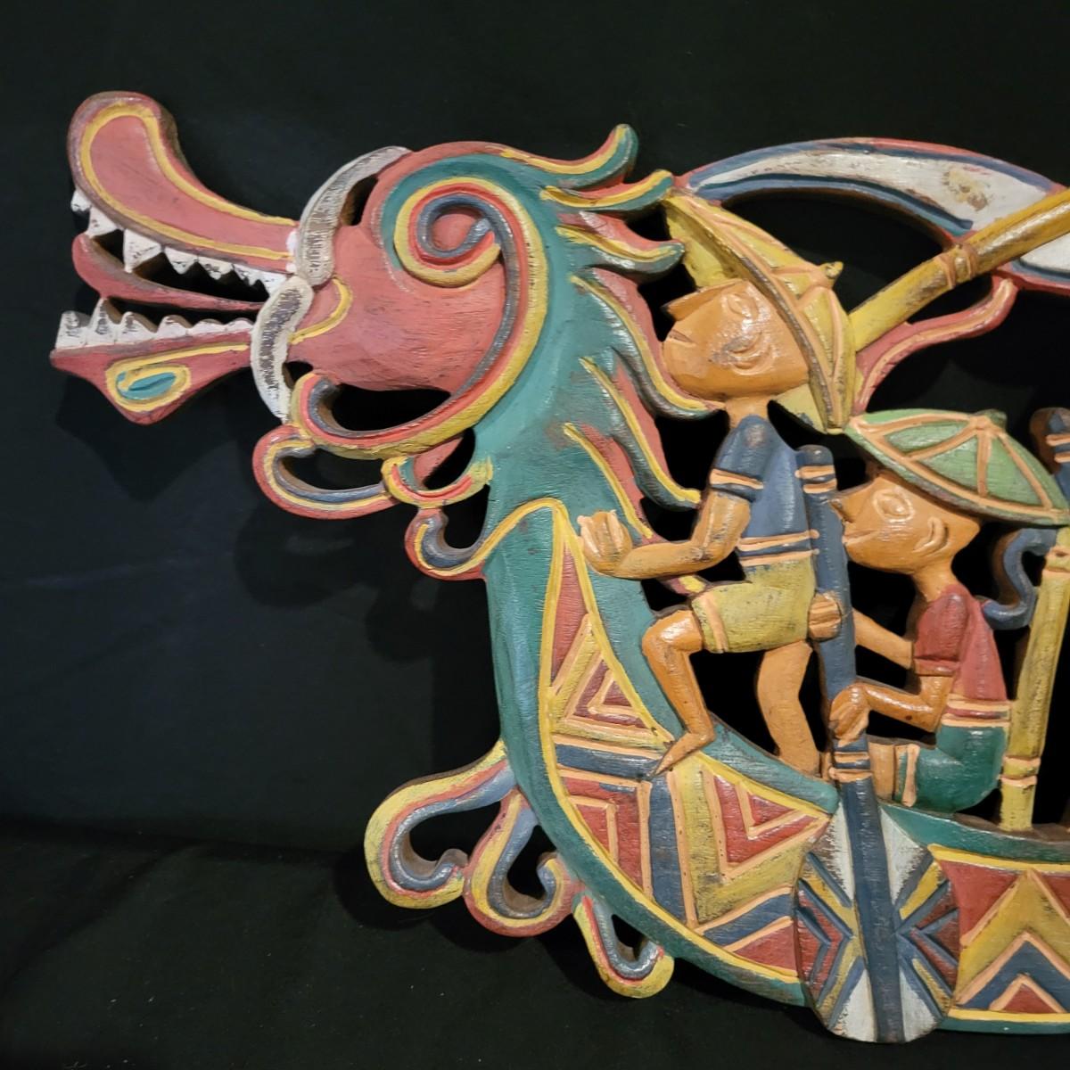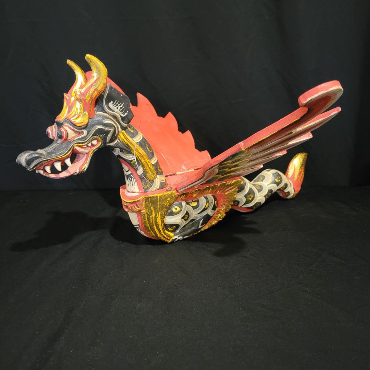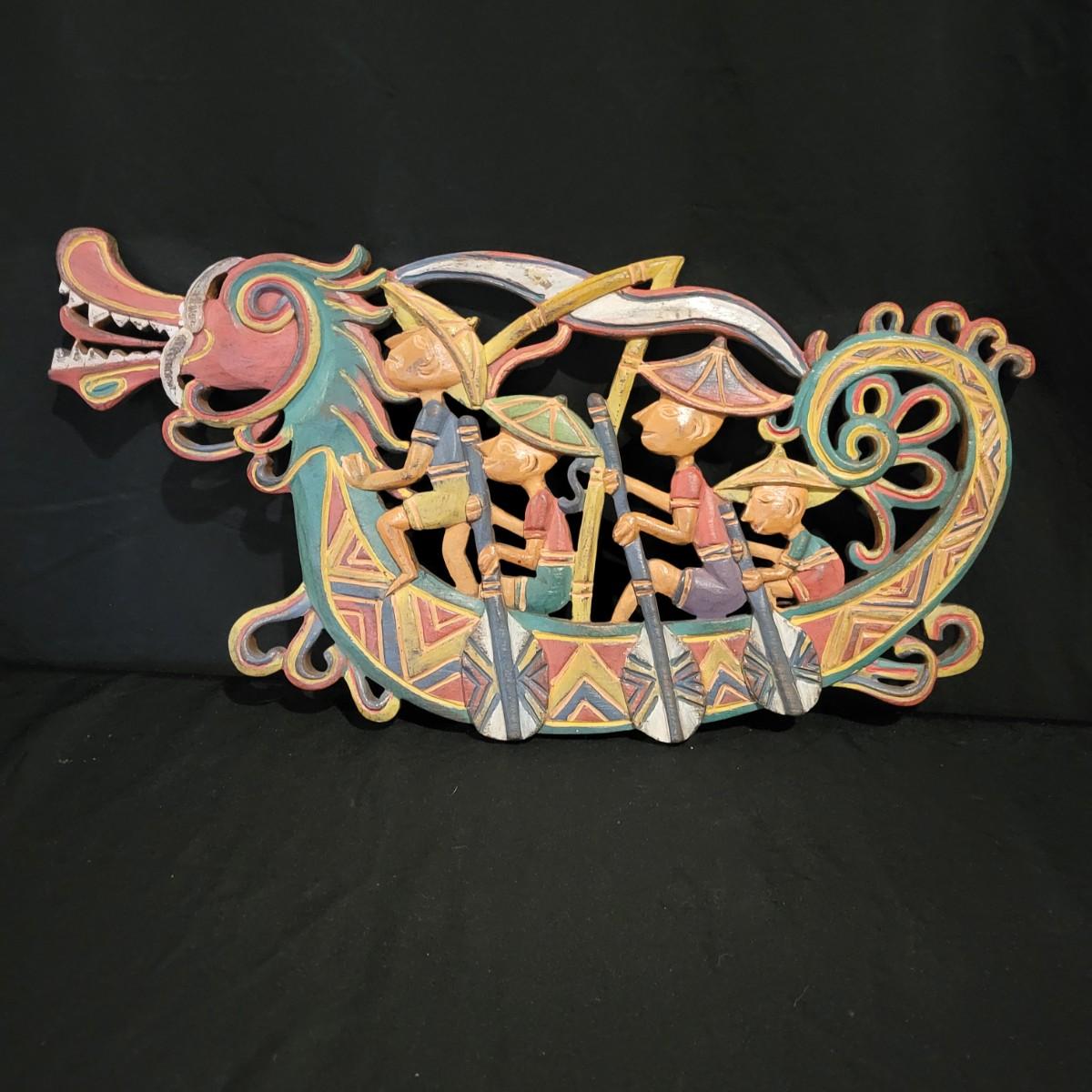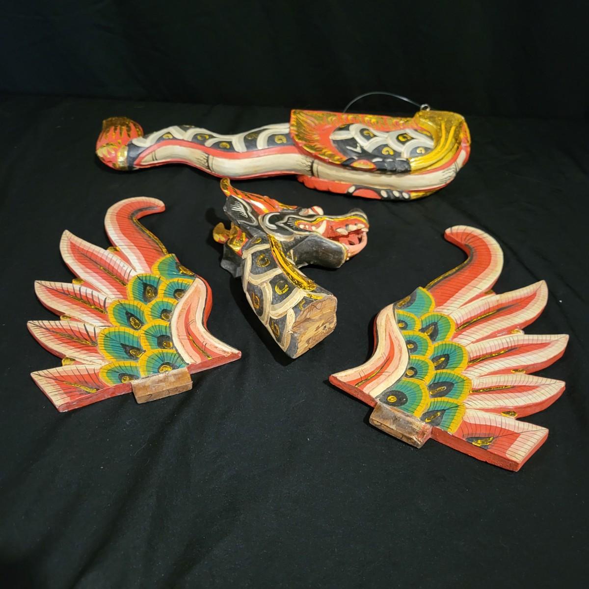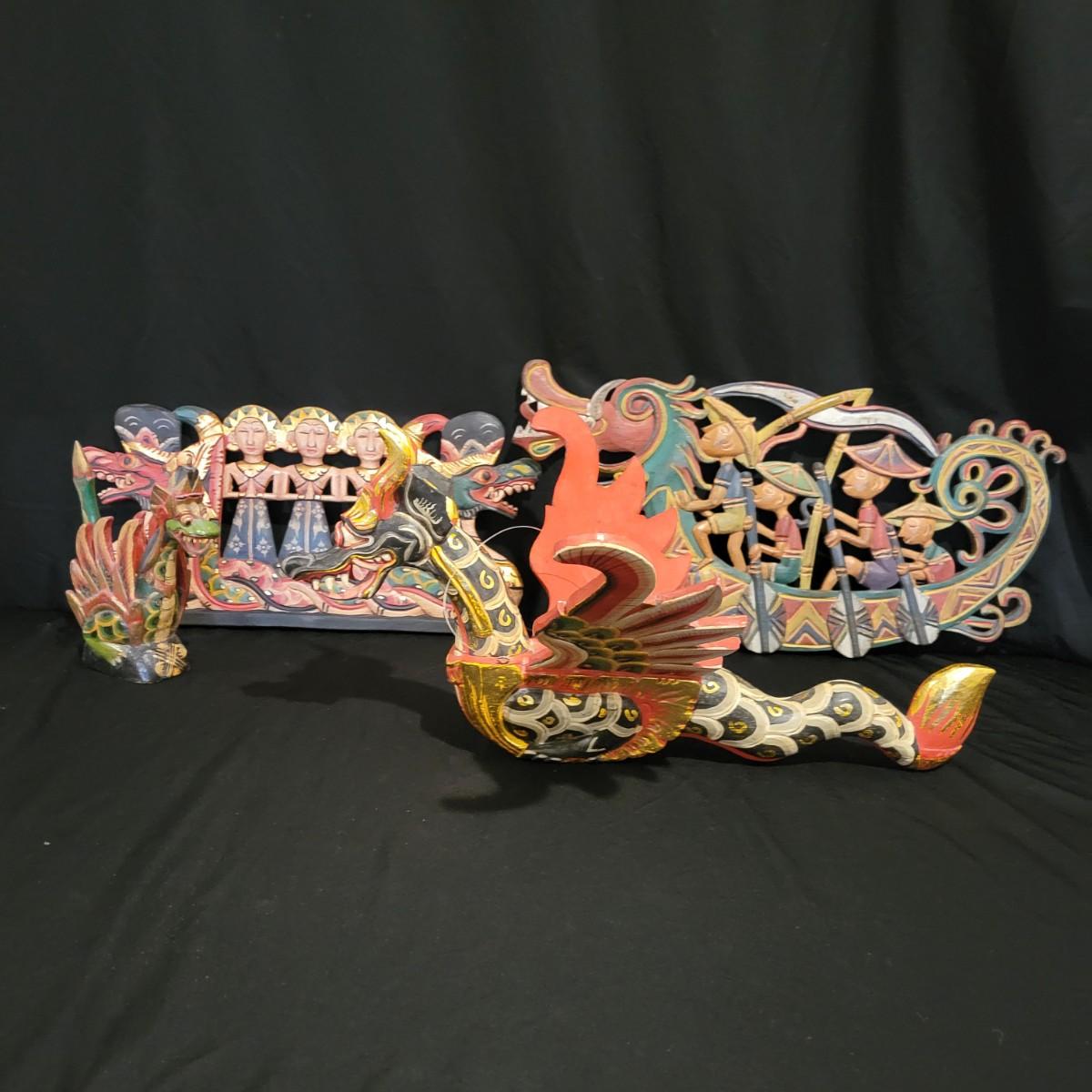 A collection of four wooden dragon carvings that appear to be hand painted. Two are wall reliefs and one is wired for hanging. The hanging dragon measures approximately 22" x 18" x 10"H. Shipping available