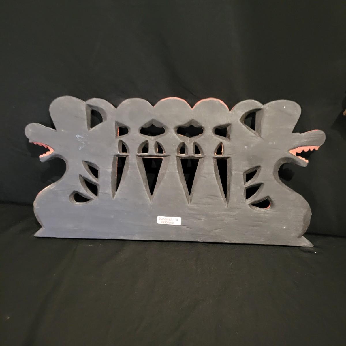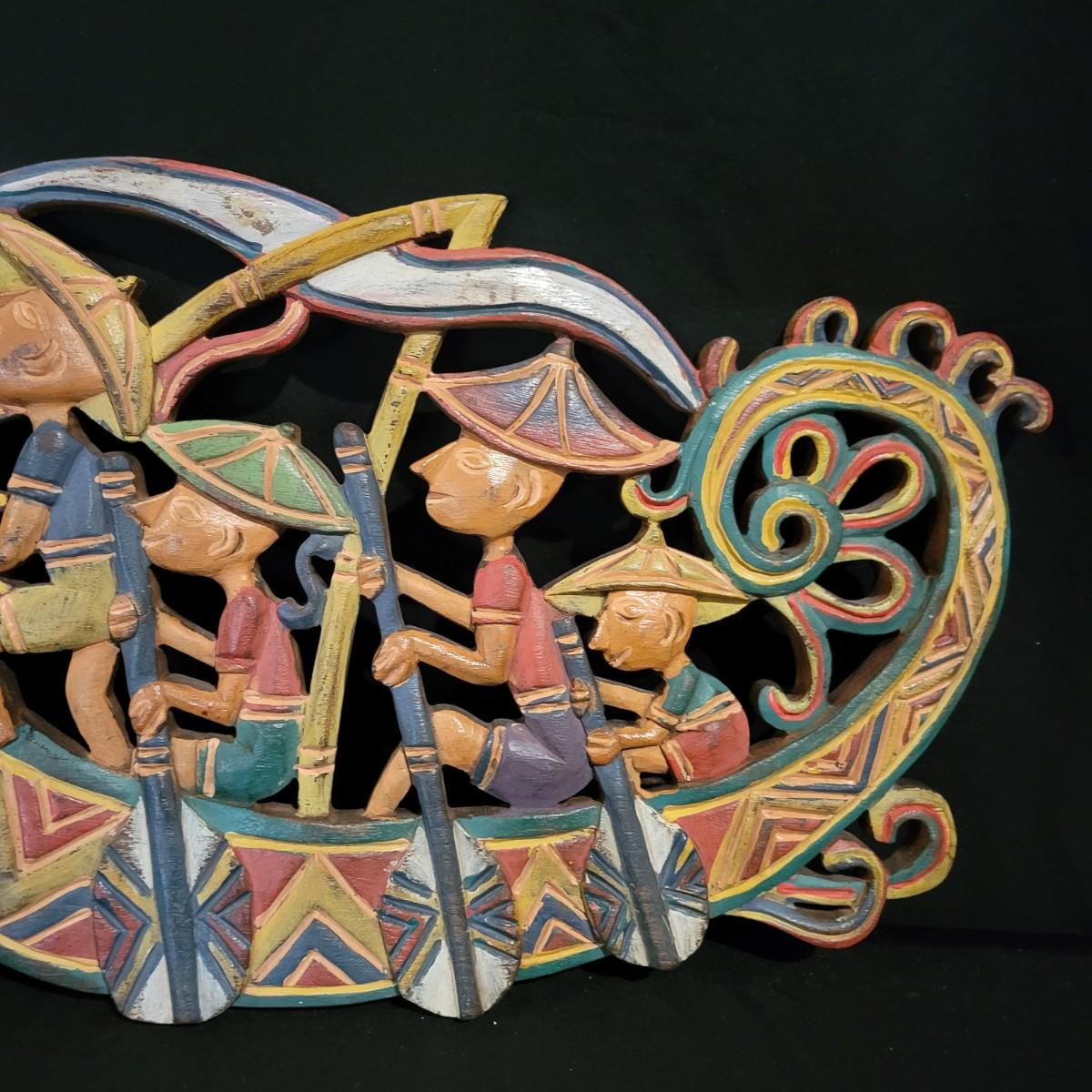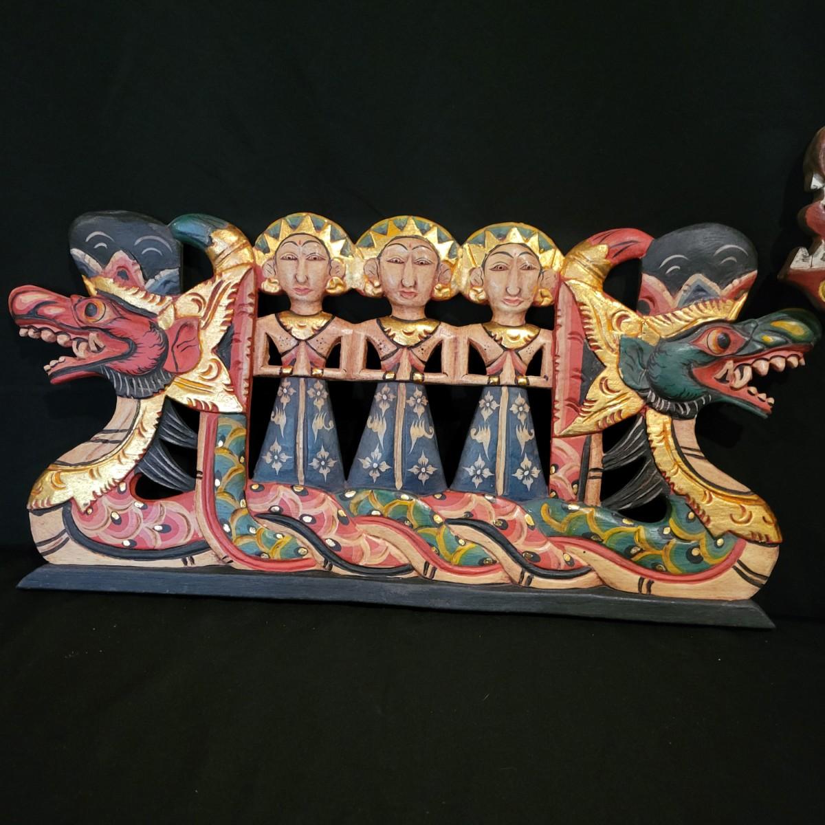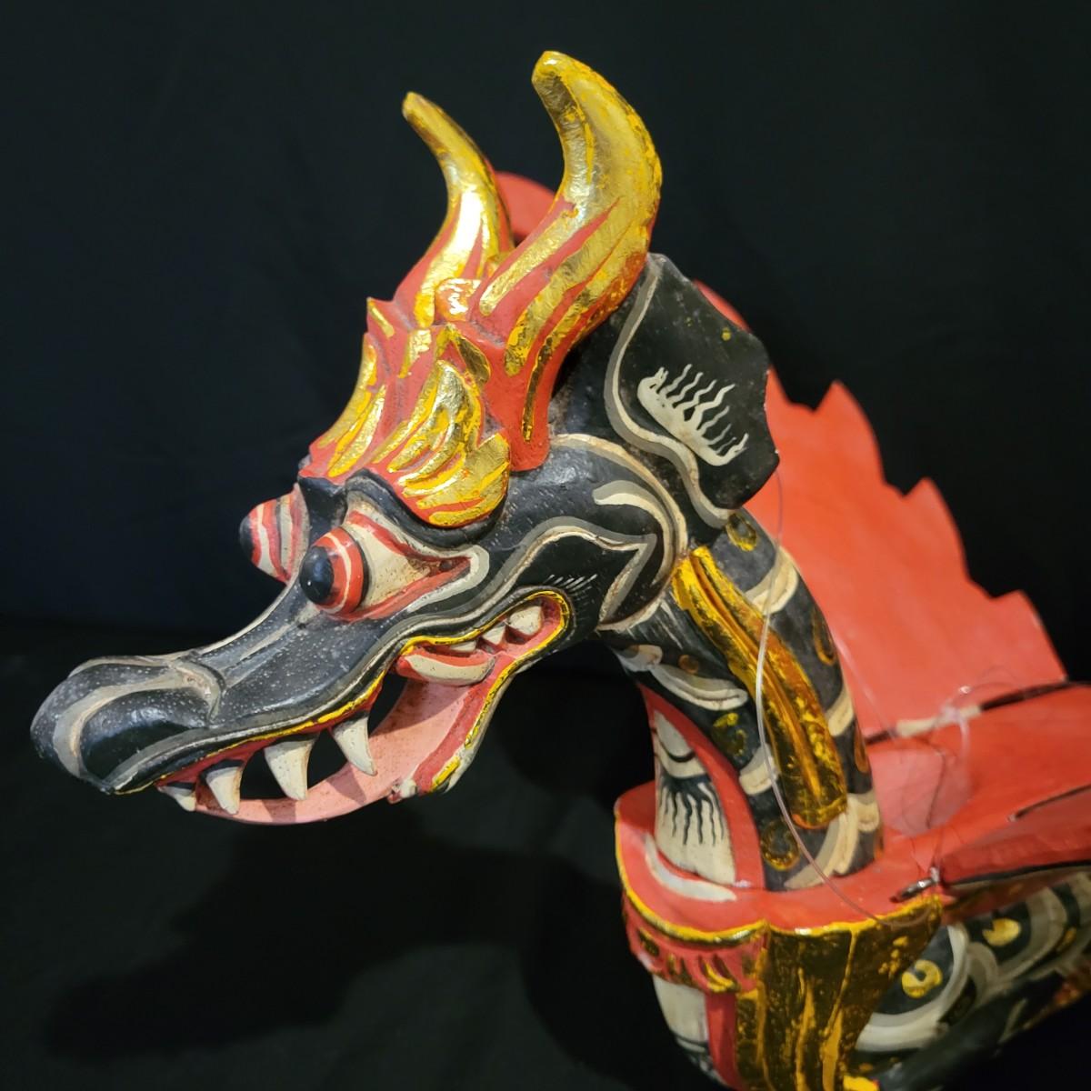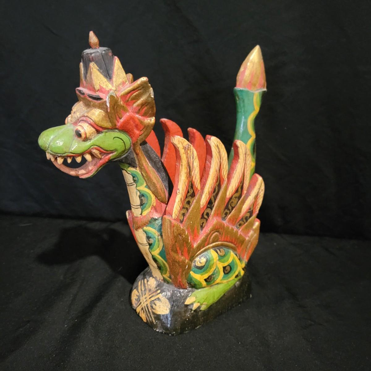 A collection of four wooden dragon carvings that appear to be hand painted. Two are wall reliefs and one is wired for hanging. The hanging dragon measures approximately 22" x 18" x 10"H. Shipping available