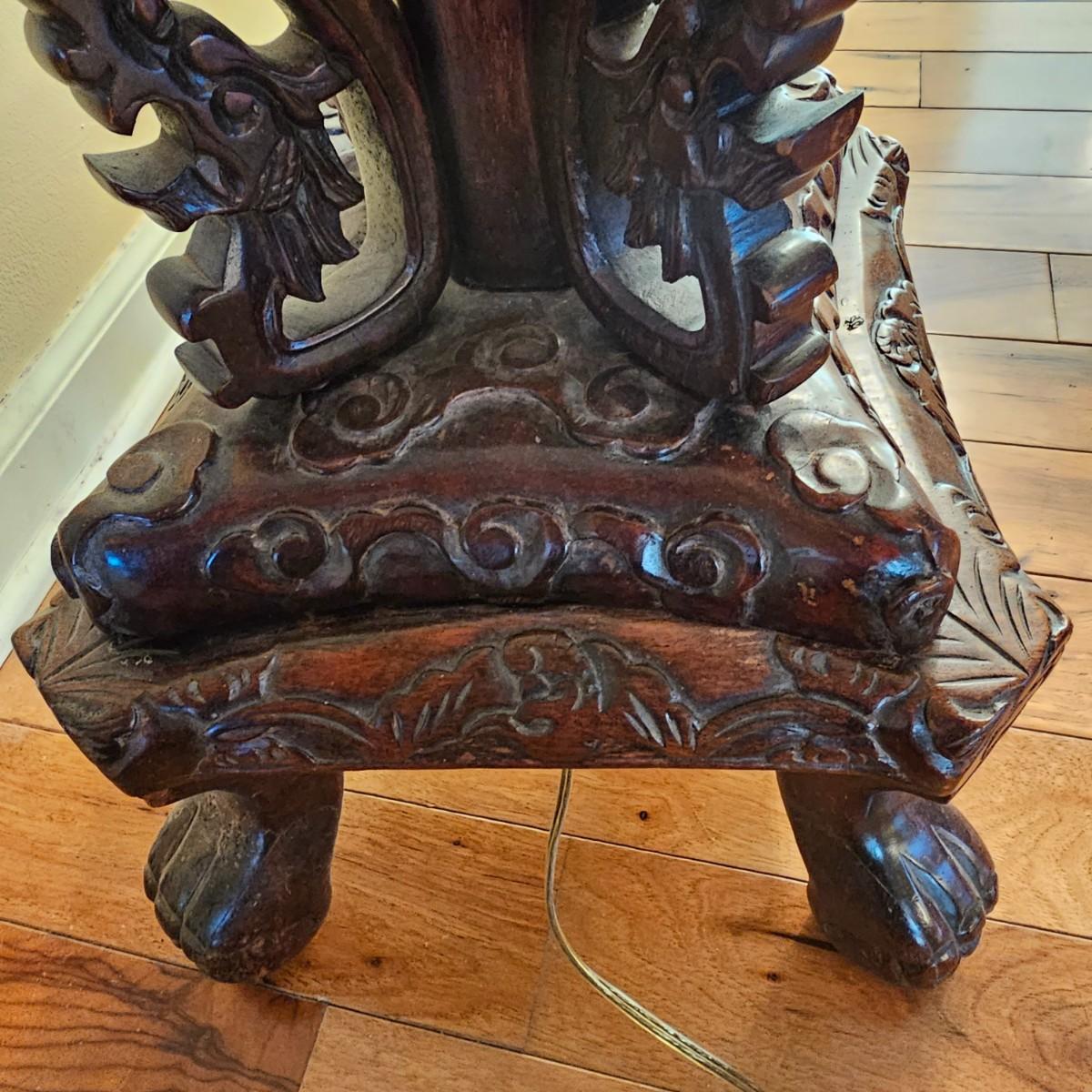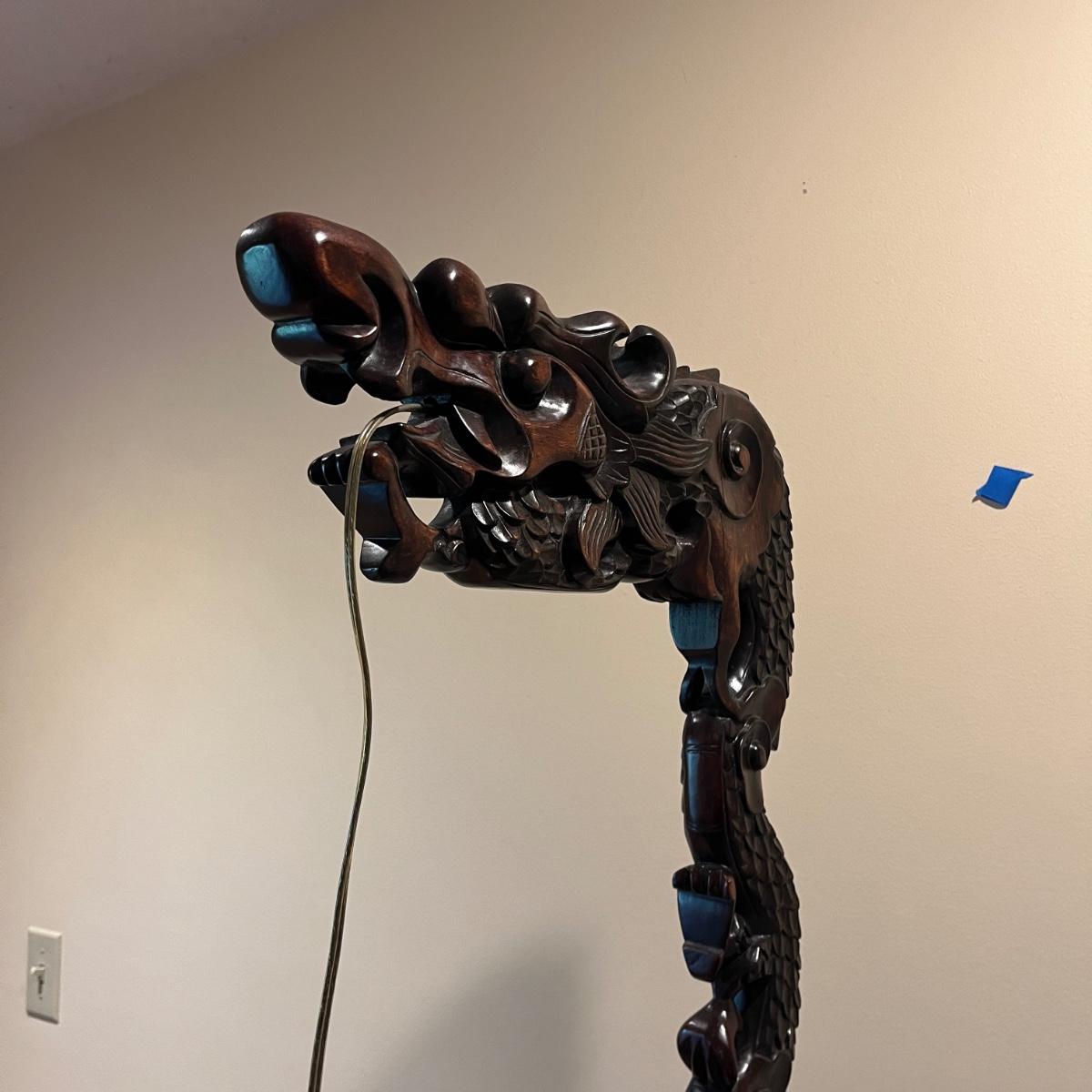 Lot includes a tall wooden dragon that appears to have been wired to become a lamp. It still needs some work to function but has a wire running through the middle. Item measures 18” x 12” x 73”H.