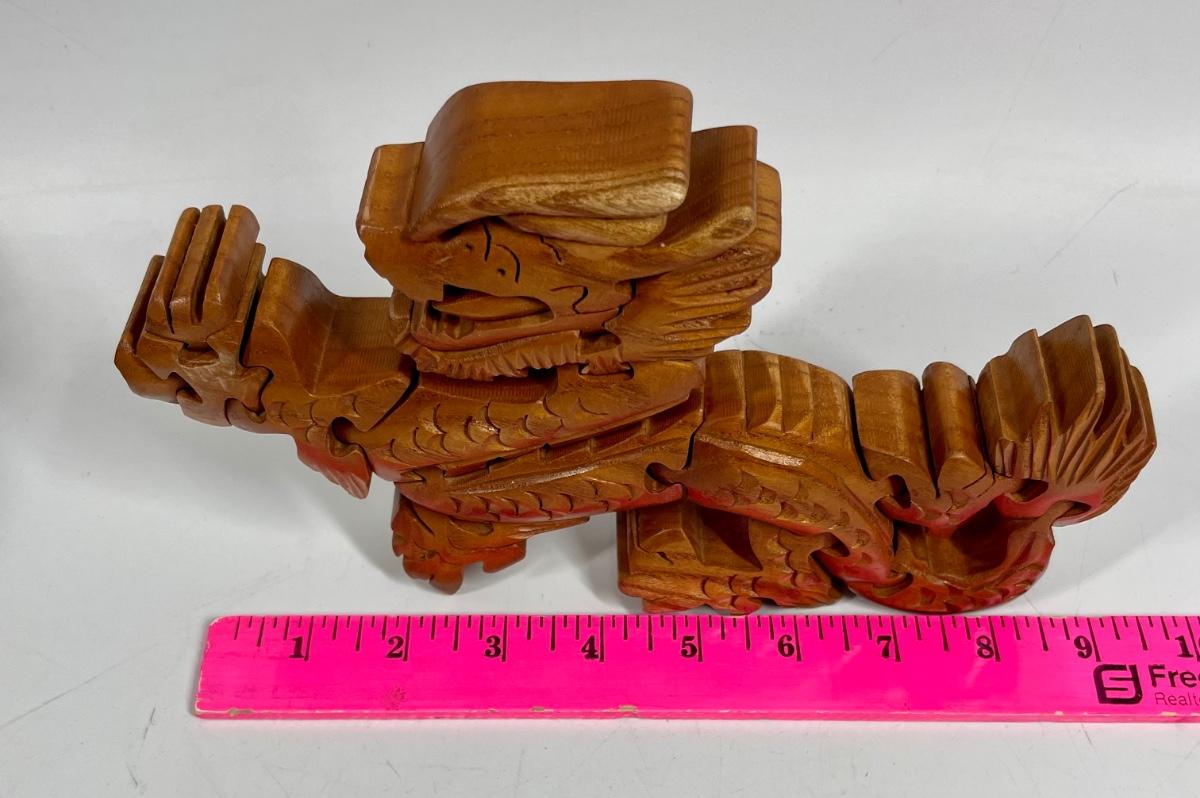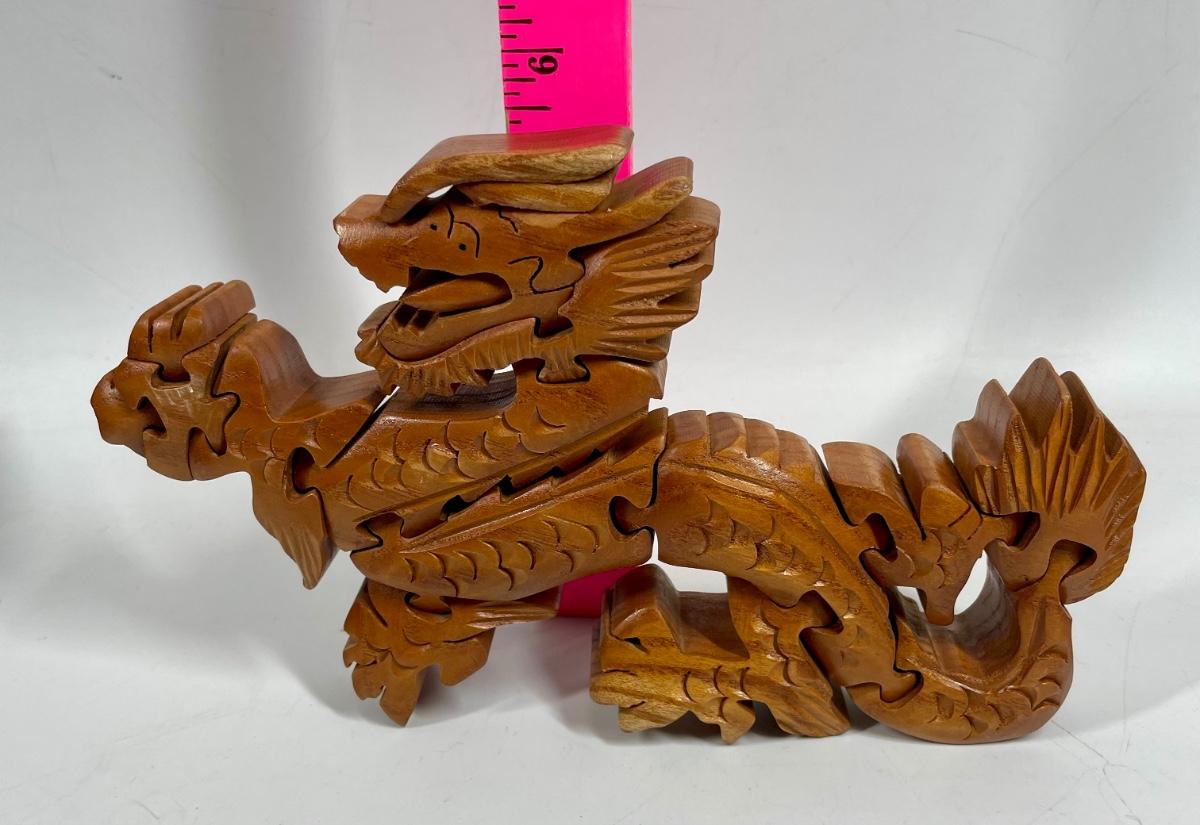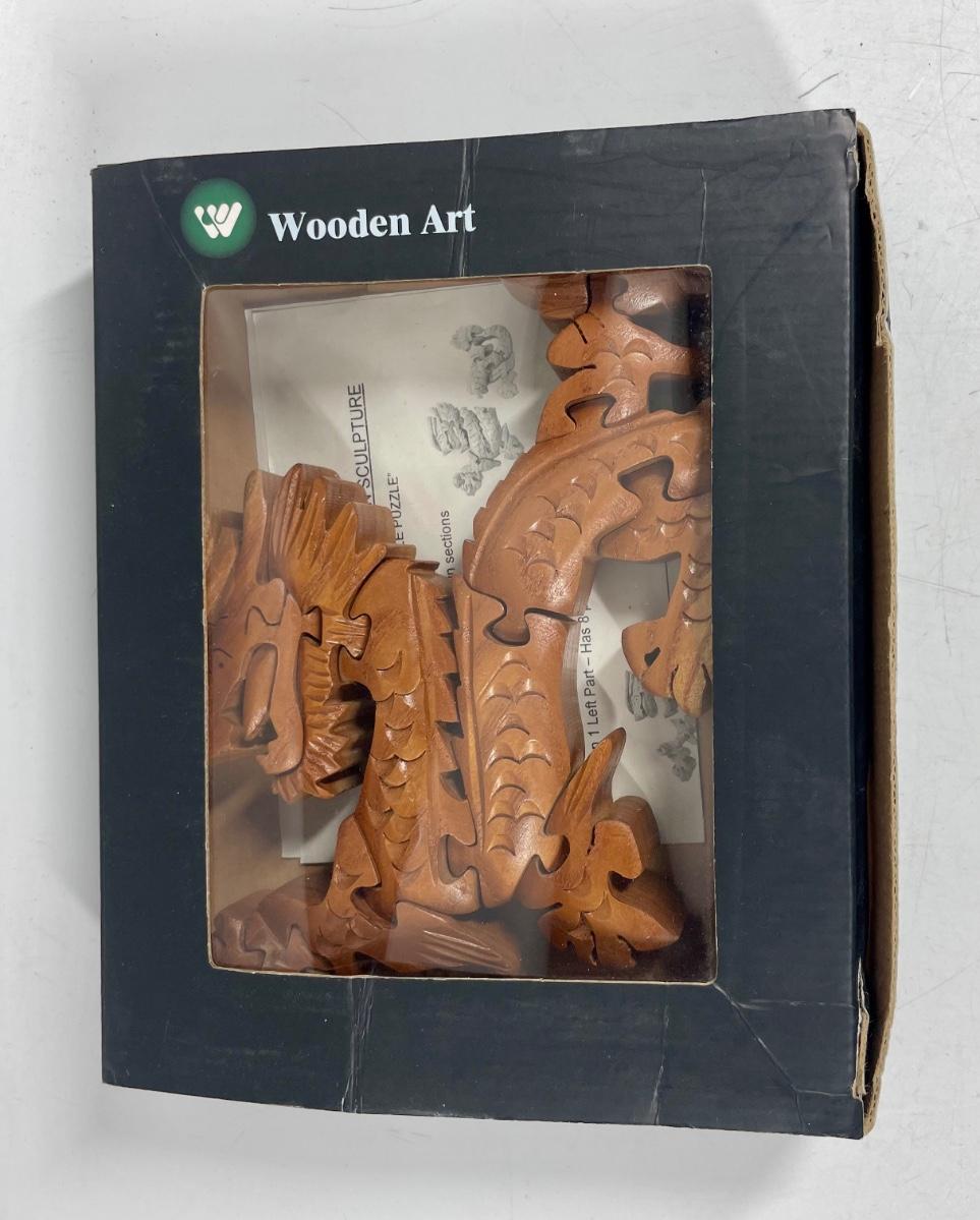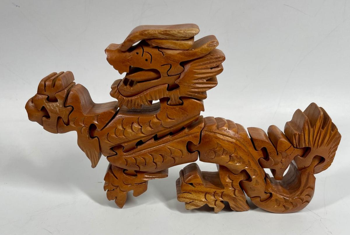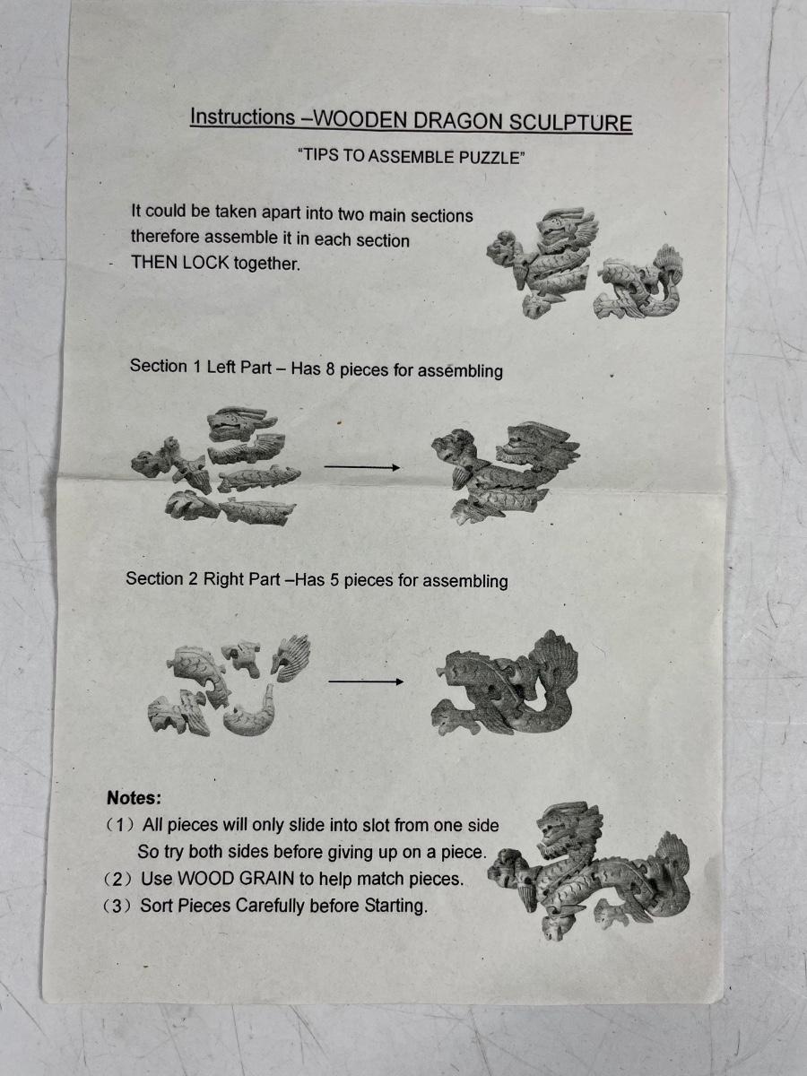 13-piece wooden puzzle, made to look like a stylized Chinese dragon. Includes storage box and instruction sheet.