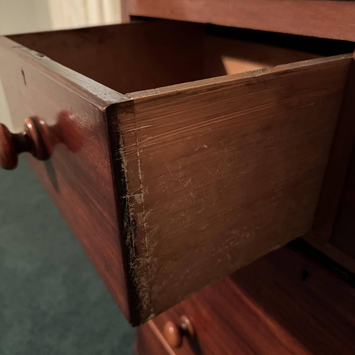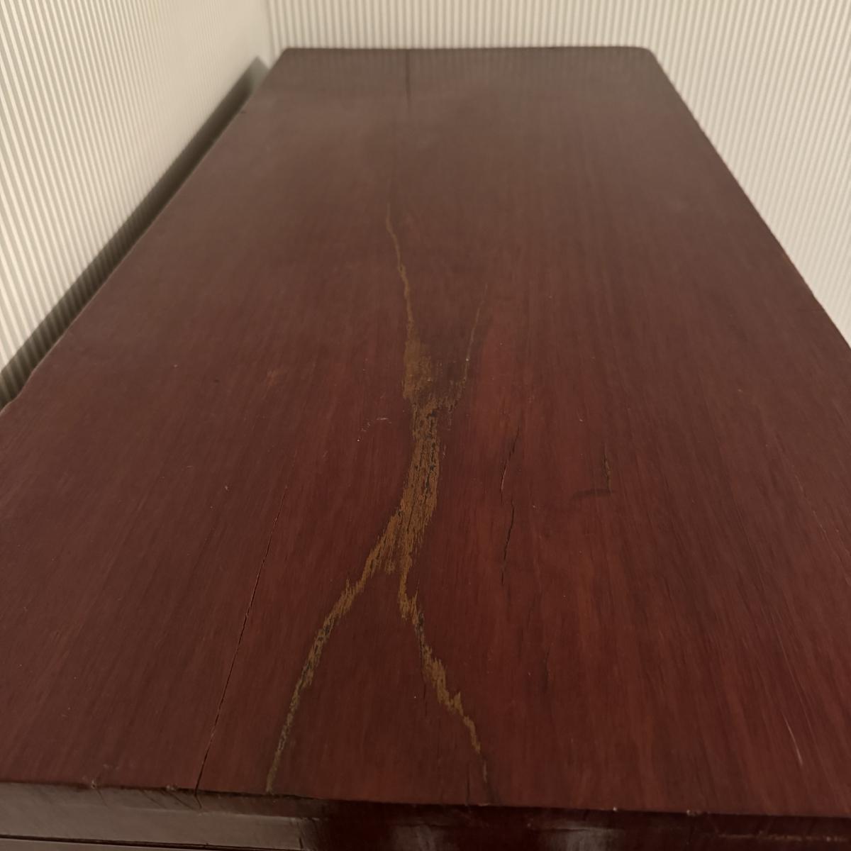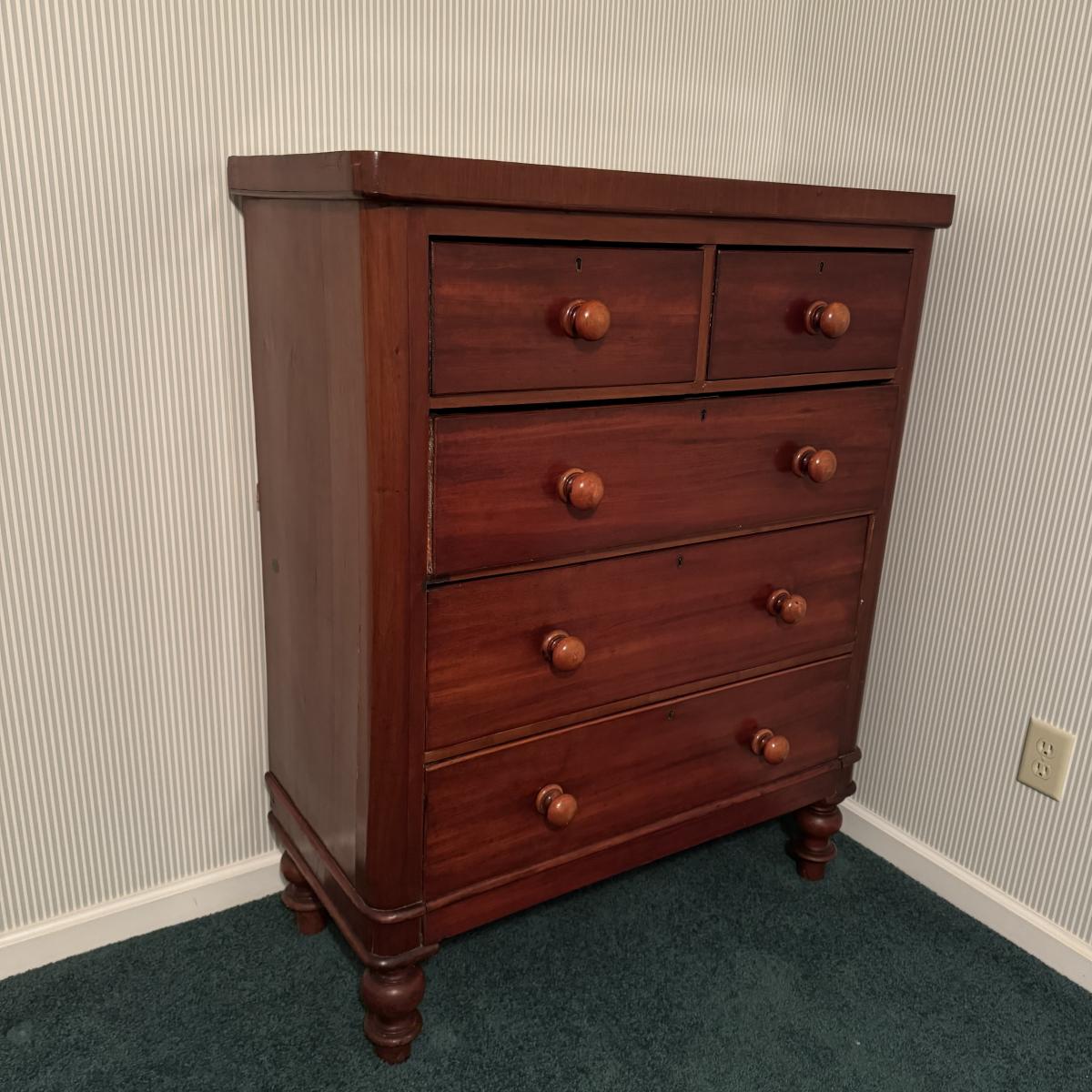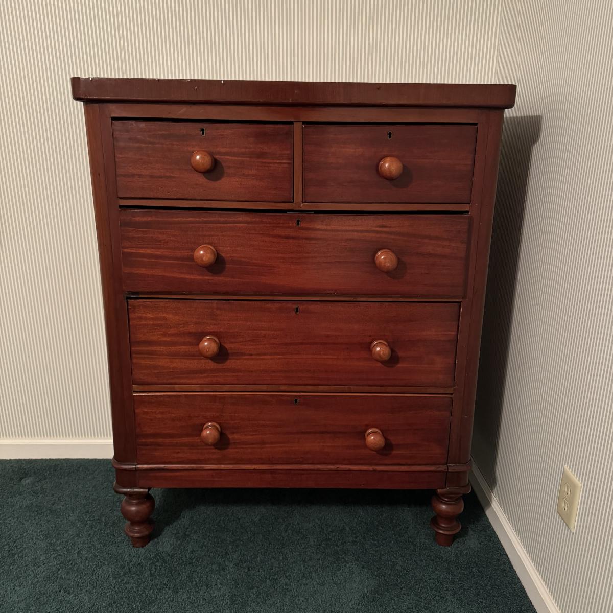 Nice size drawers on this wooden dresser. Slide easily to open and close although come off tracks easily when empty. No keys found. Some cracks in wood on top but they do not compromise the integrity of the piece. Measures 38” x 19” x 47”H Local pick up only. Winning bidder must bring assistance to help move and load this item due to its weight and/or size. It will need to go up a flight of stairs. This piece is all wood but not too heavy.