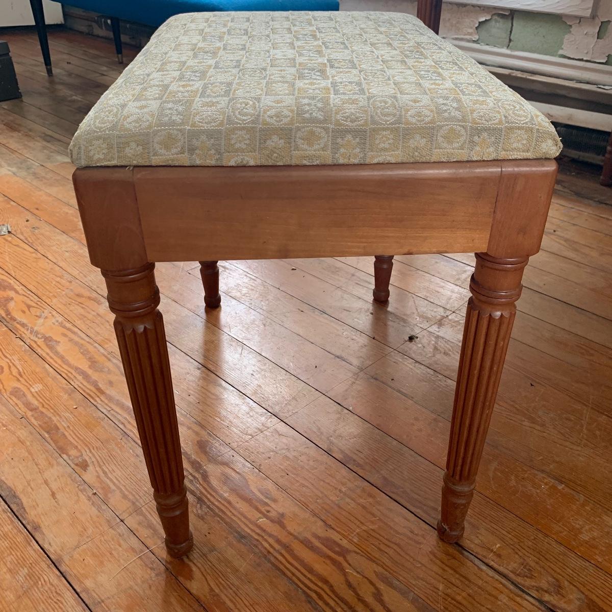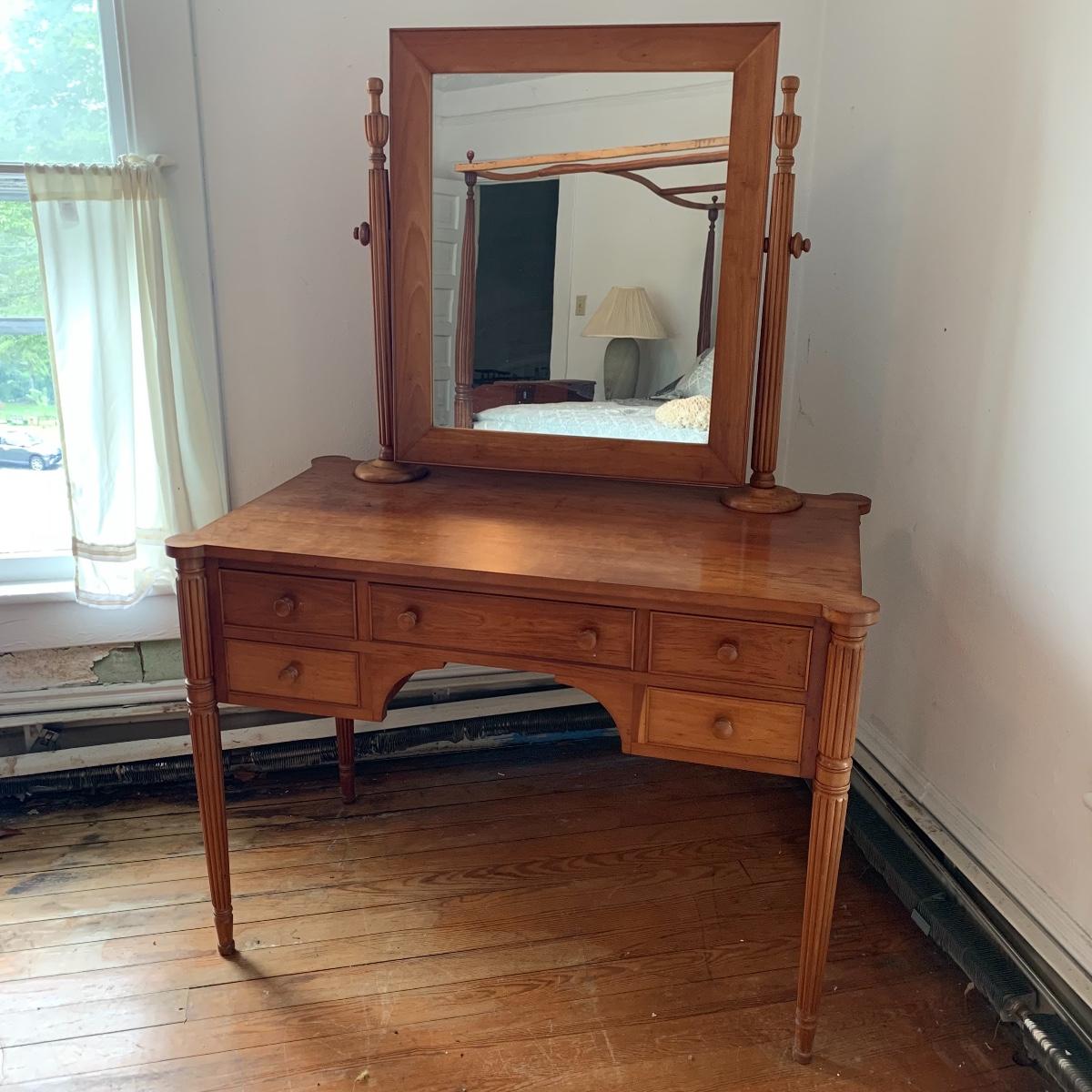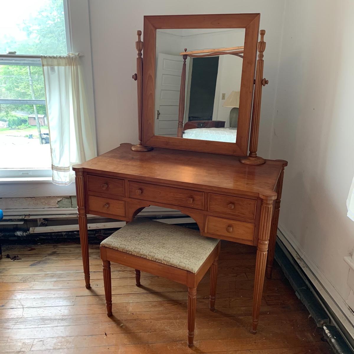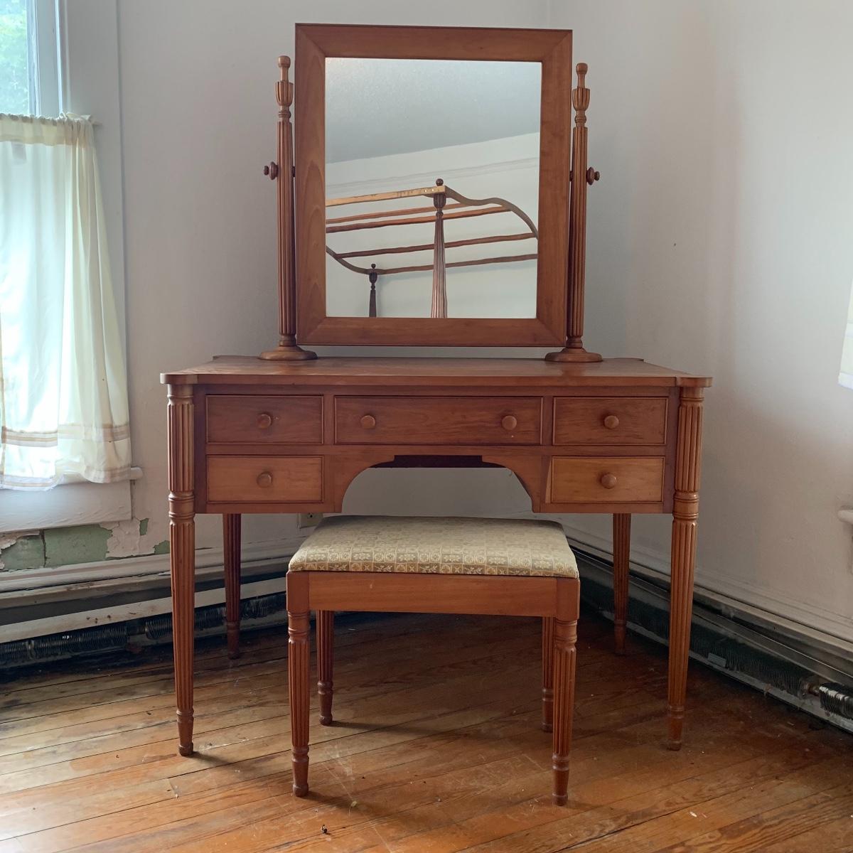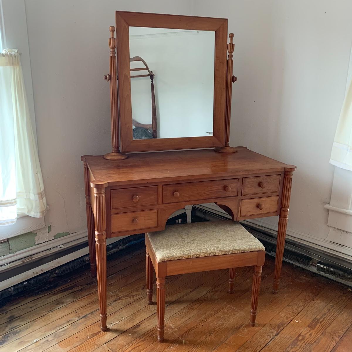 This lot includes a wooden dressing table with an attached mirror and a matching upholstered bench. The table has five dovetailed drawers and long carved legs. This detail matches the mirror base and the legs on the bench. The table measures 45” x 24.5” x 32.5”. The mirror measures 27” x 31”. Including the mirror, the whole unit is 65” tall. The mirror has cardboard backing. There are some marks on the surface of the table and a bit of mildew in the drawers. The bench measures 22.5” x 14.5” x 19.5”. Local pickup only. Please note that the winning bidder will need to move the items in this lot from the second floor of the house.