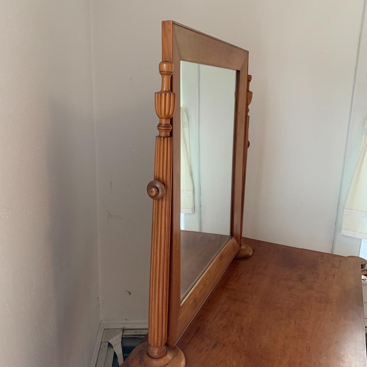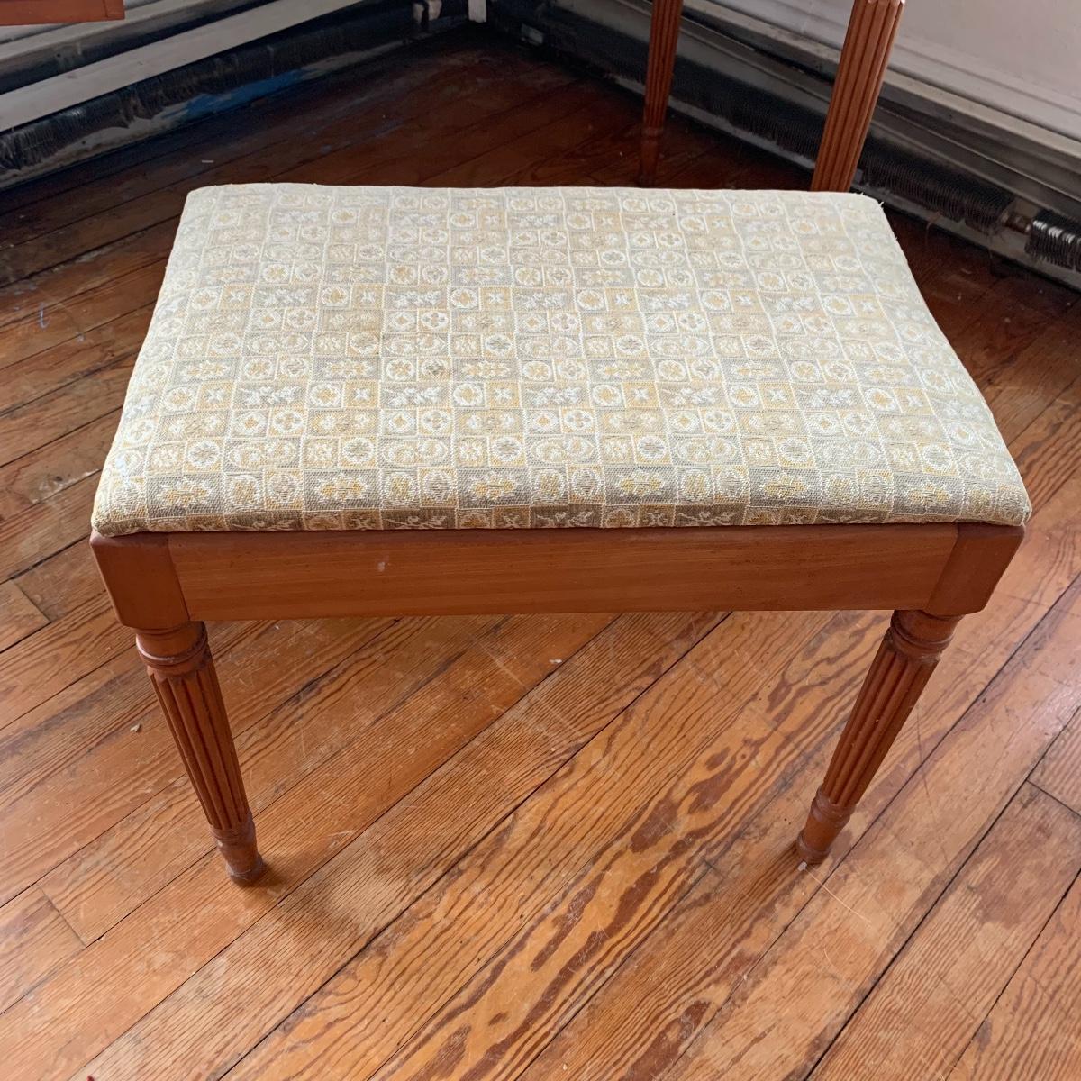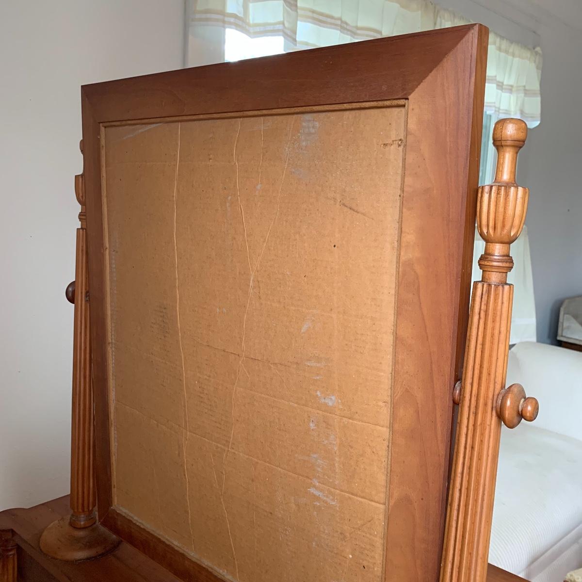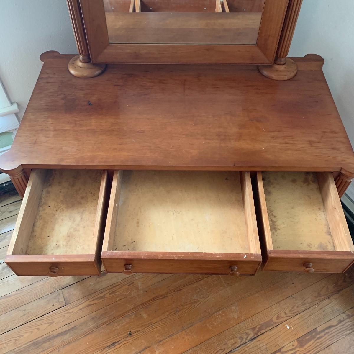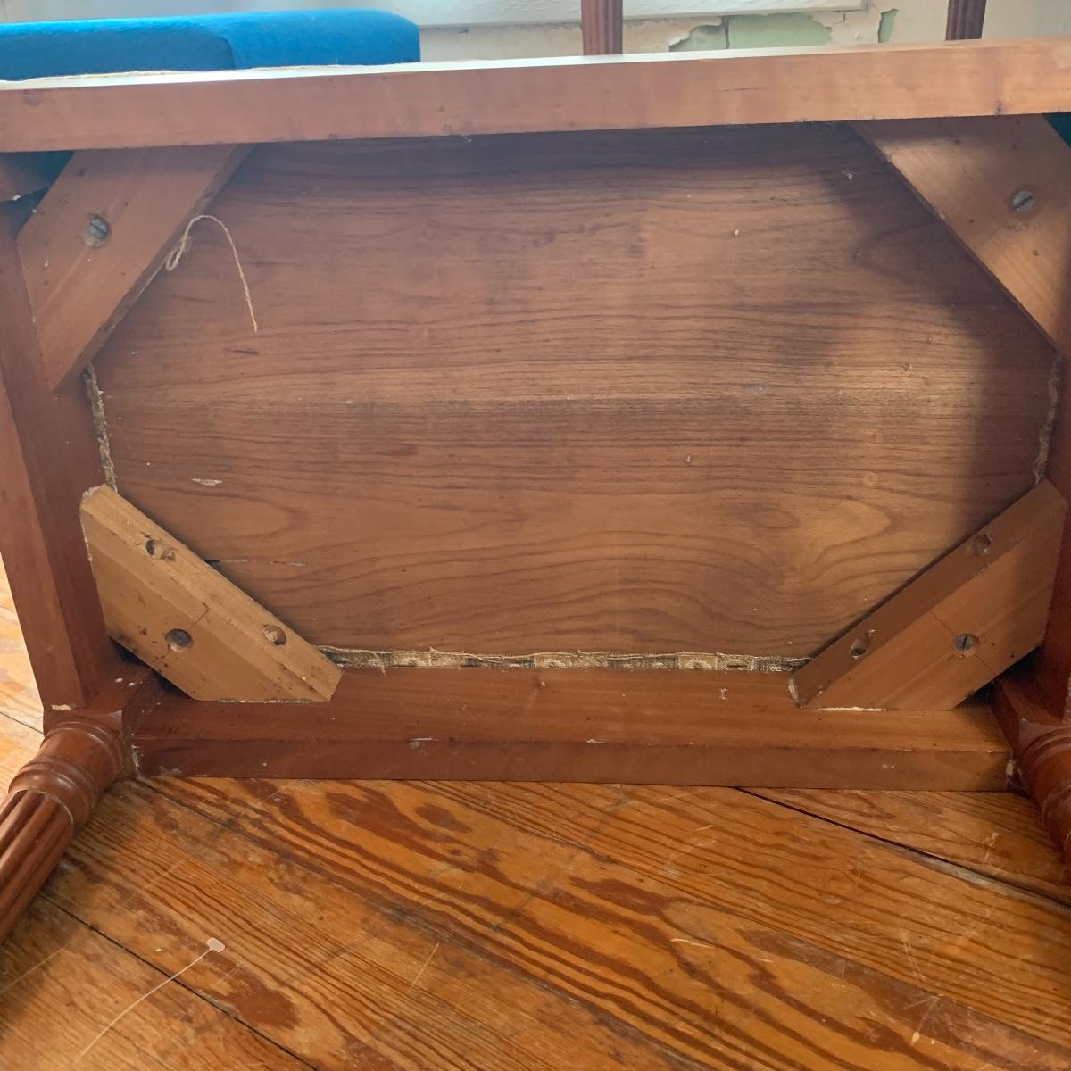 This lot includes a wooden dressing table with an attached mirror and a matching upholstered bench. The table has five dovetailed drawers and long carved legs. This detail matches the mirror base and the legs on the bench. The table measures 45” x 24.5” x 32.5”. The mirror measures 27” x 31”. Including the mirror, the whole unit is 65” tall. The mirror has cardboard backing. There are some marks on the surface of the table and a bit of mildew in the drawers. The bench measures 22.5” x 14.5” x 19.5”. Local pickup only. Please note that the winning bidder will need to move the items in this lot from the second floor of the house.