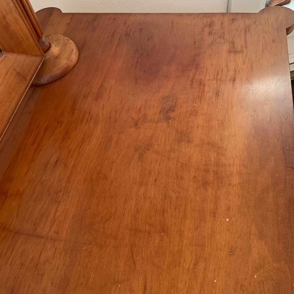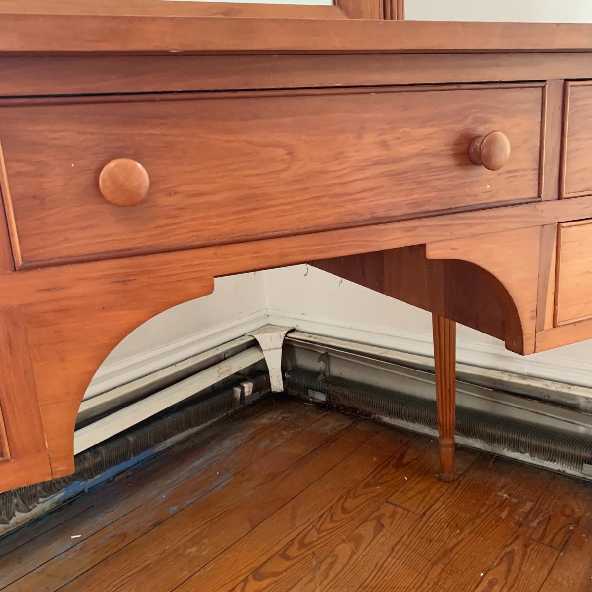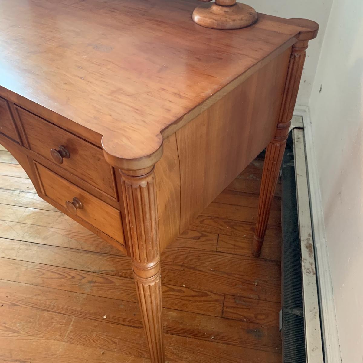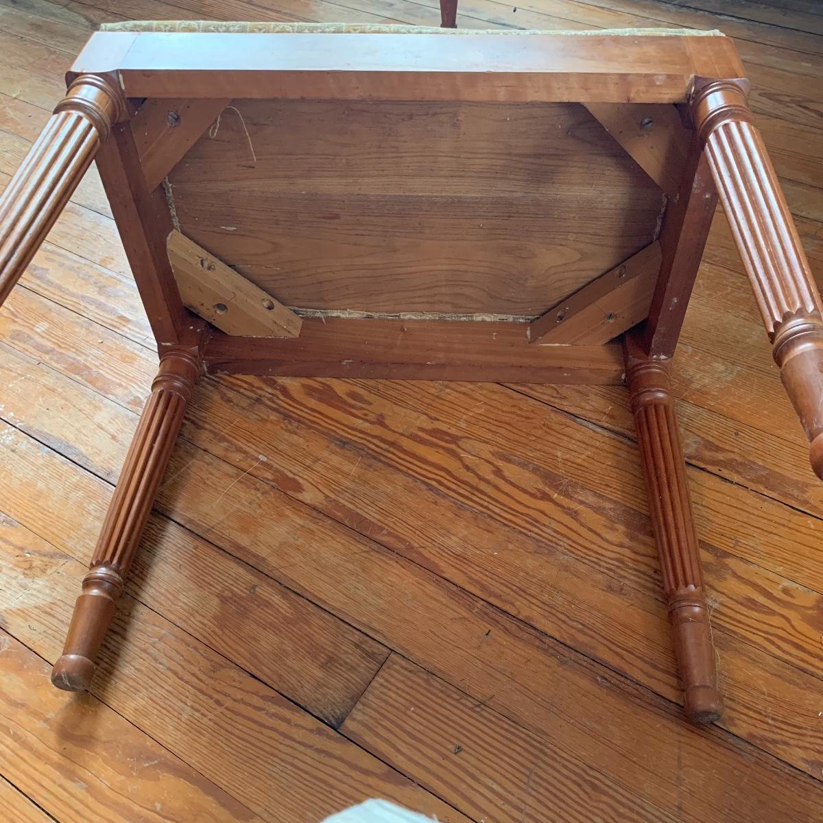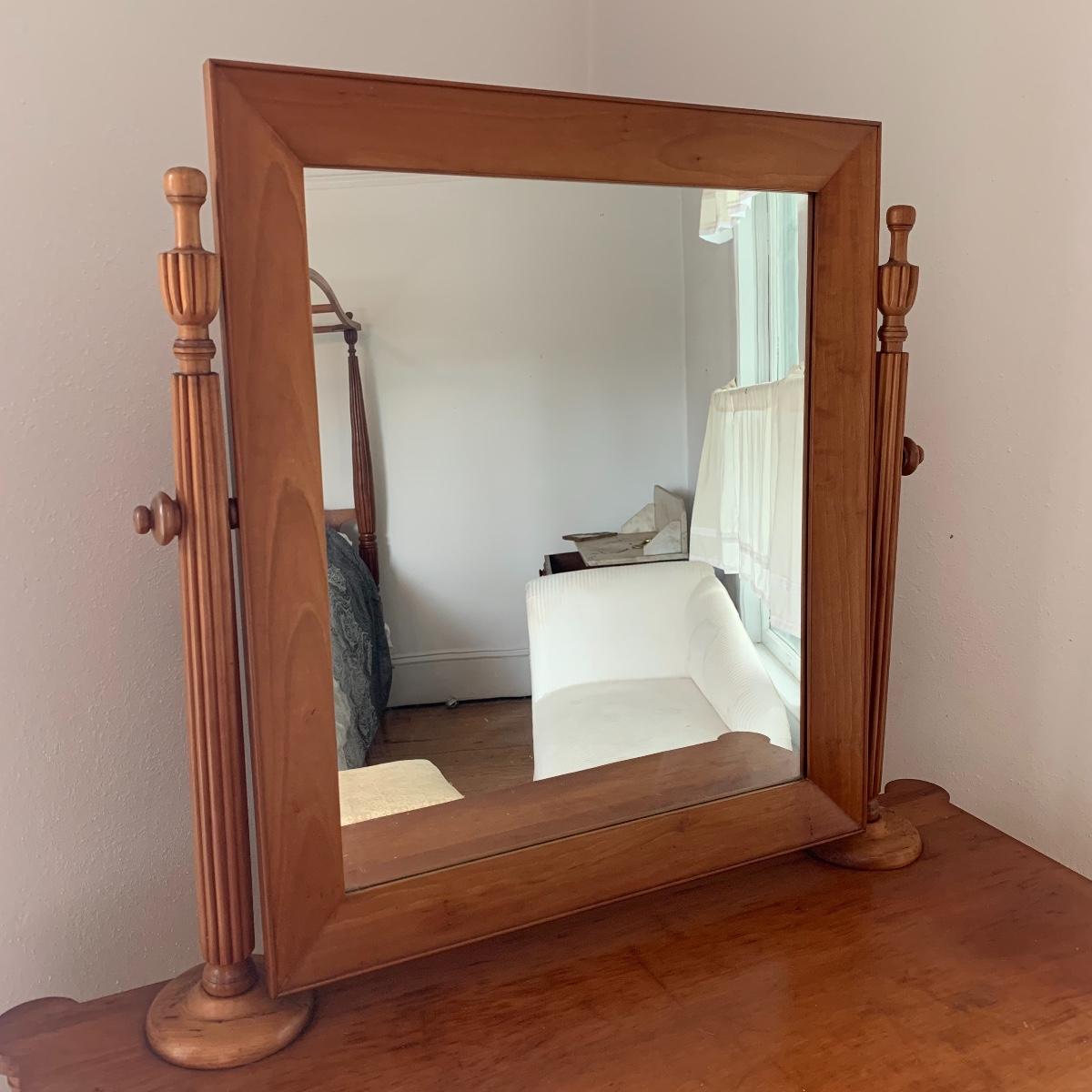 This lot includes a wooden dressing table with an attached mirror and a matching upholstered bench. The table has five dovetailed drawers and long carved legs. This detail matches the mirror base and the legs on the bench. The table measures 45” x 24.5” x 32.5”. The mirror measures 27” x 31”. Including the mirror, the whole unit is 65” tall. The mirror has cardboard backing. There are some marks on the surface of the table and a bit of mildew in the drawers. The bench measures 22.5” x 14.5” x 19.5”. Local pickup only. Please note that the winning bidder will need to move the items in this lot from the second floor of the house.