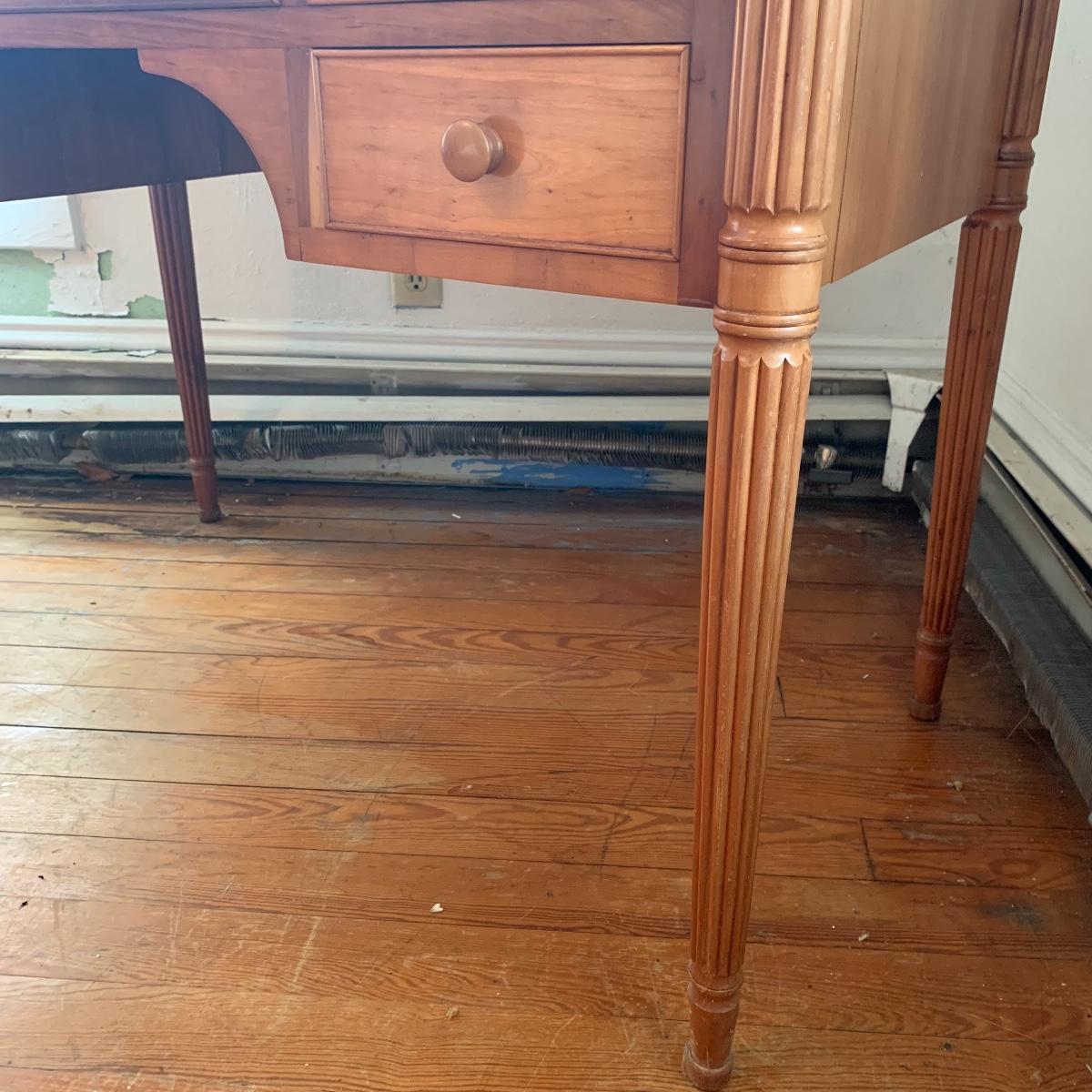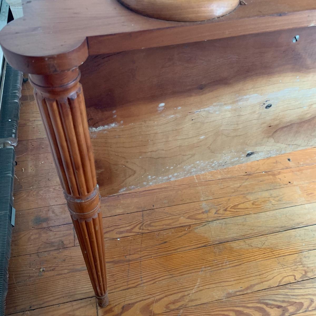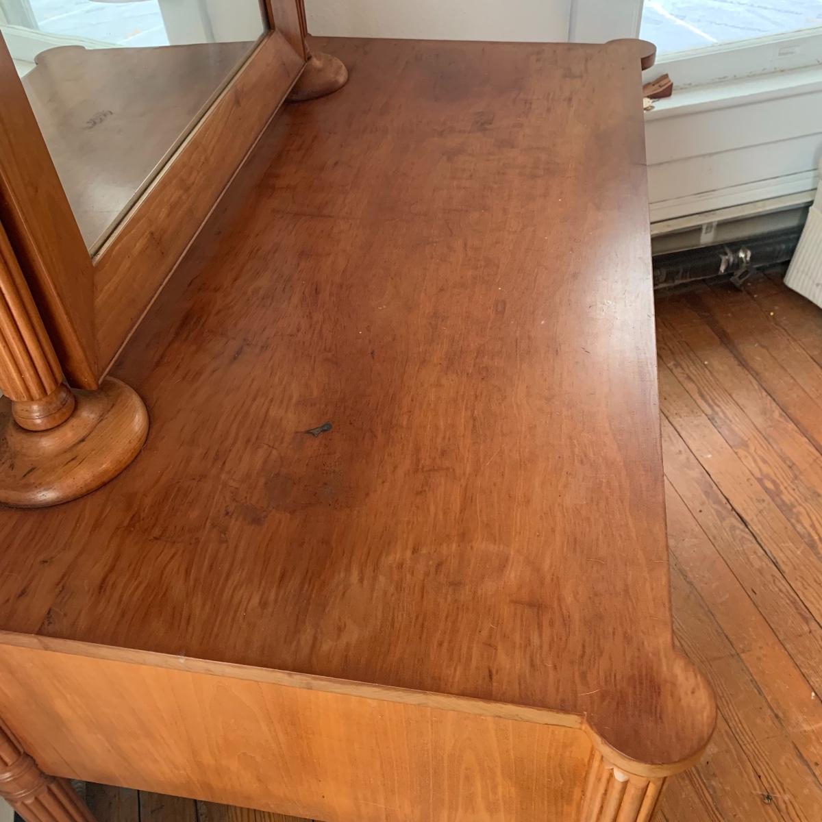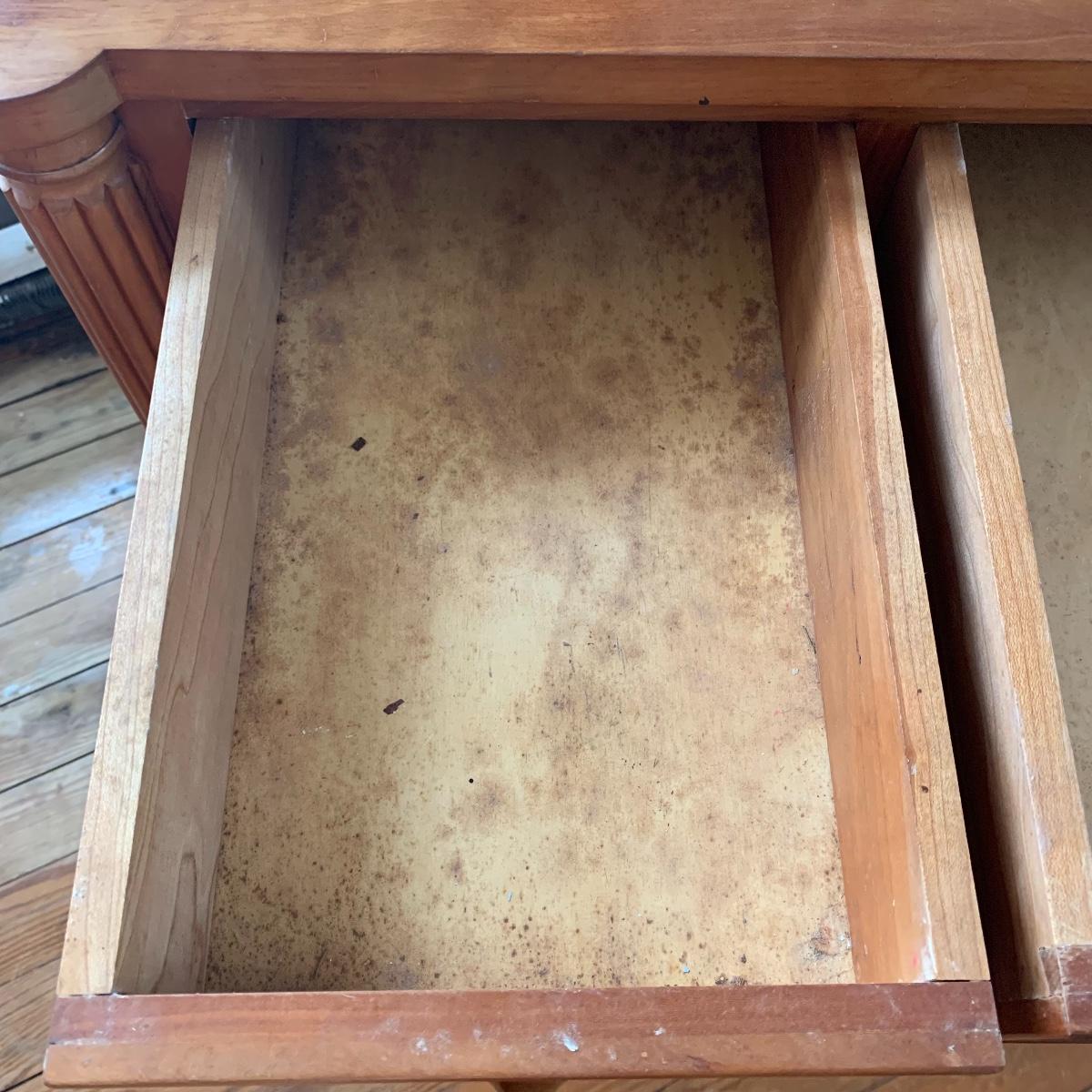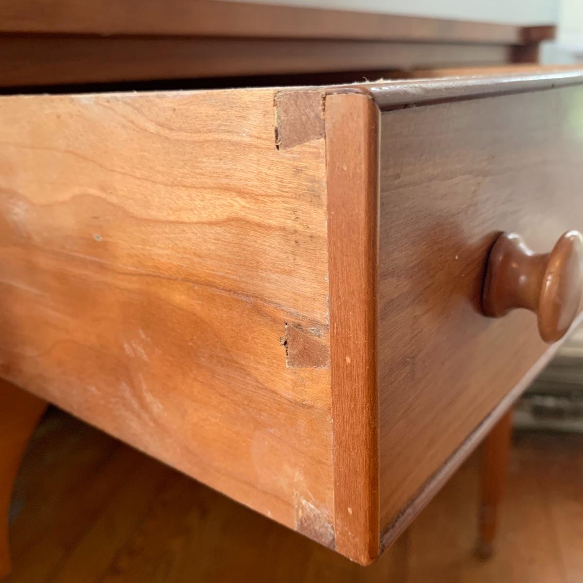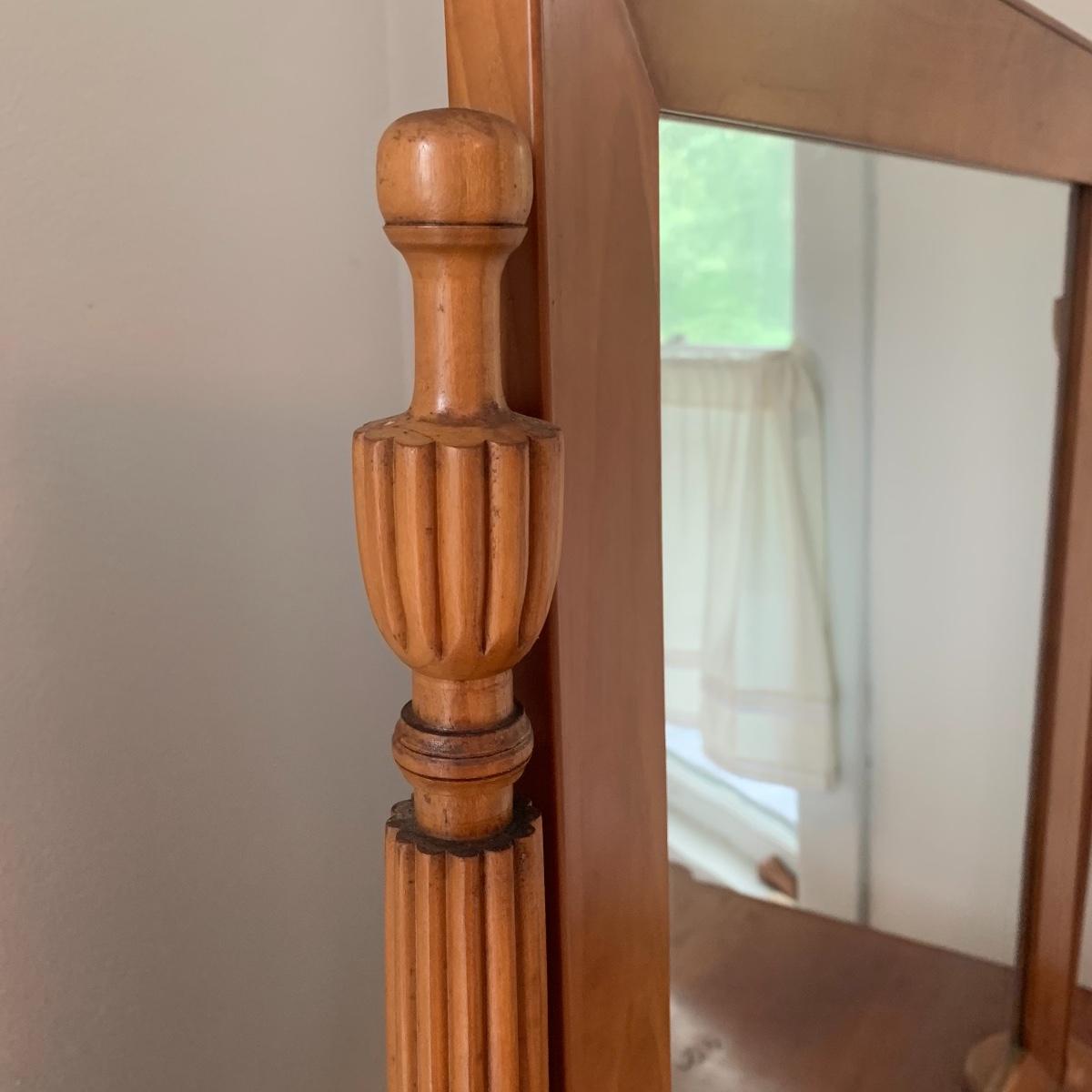 This lot includes a wooden dressing table with an attached mirror and a matching upholstered bench. The table has five dovetailed drawers and long carved legs. This detail matches the mirror base and the legs on the bench. The table measures 45” x 24.5” x 32.5”. The mirror measures 27” x 31”. Including the mirror, the whole unit is 65” tall. The mirror has cardboard backing. There are some marks on the surface of the table and a bit of mildew in the drawers. The bench measures 22.5” x 14.5” x 19.5”. Local pickup only. Please note that the winning bidder will need to move the items in this lot from the second floor of the house.