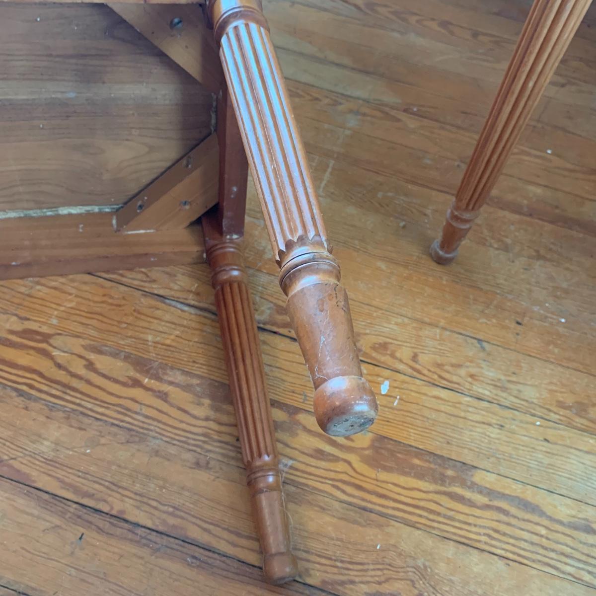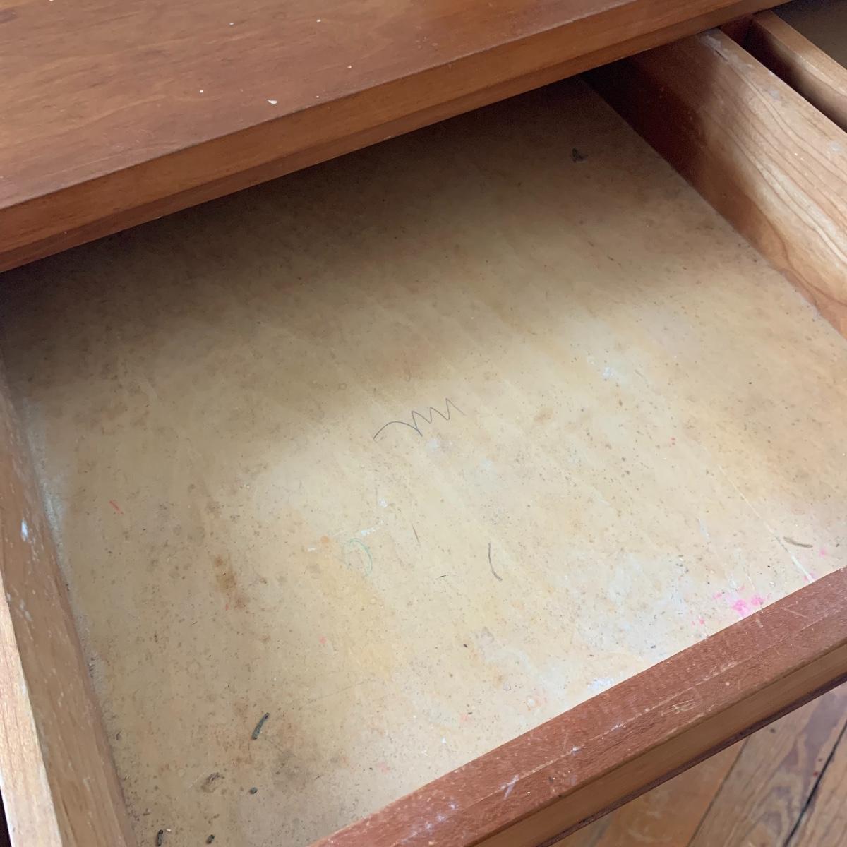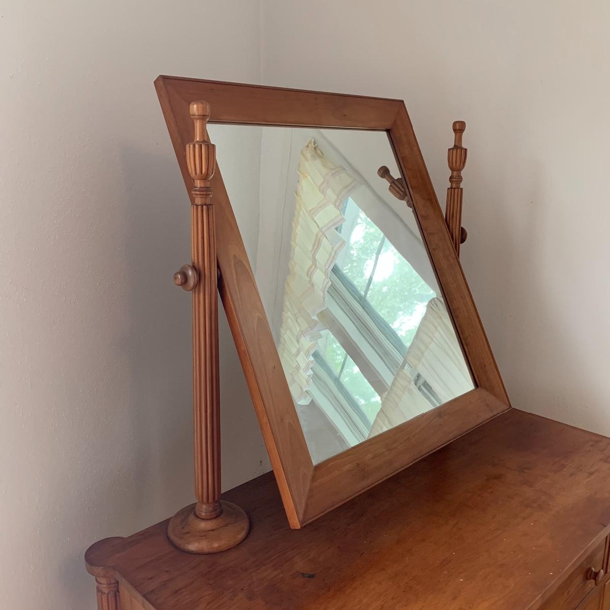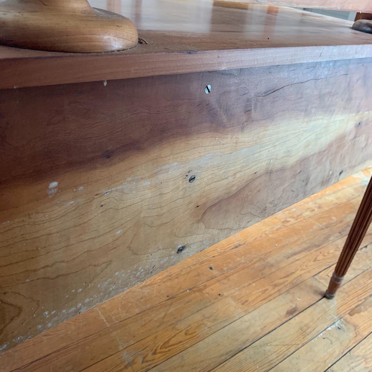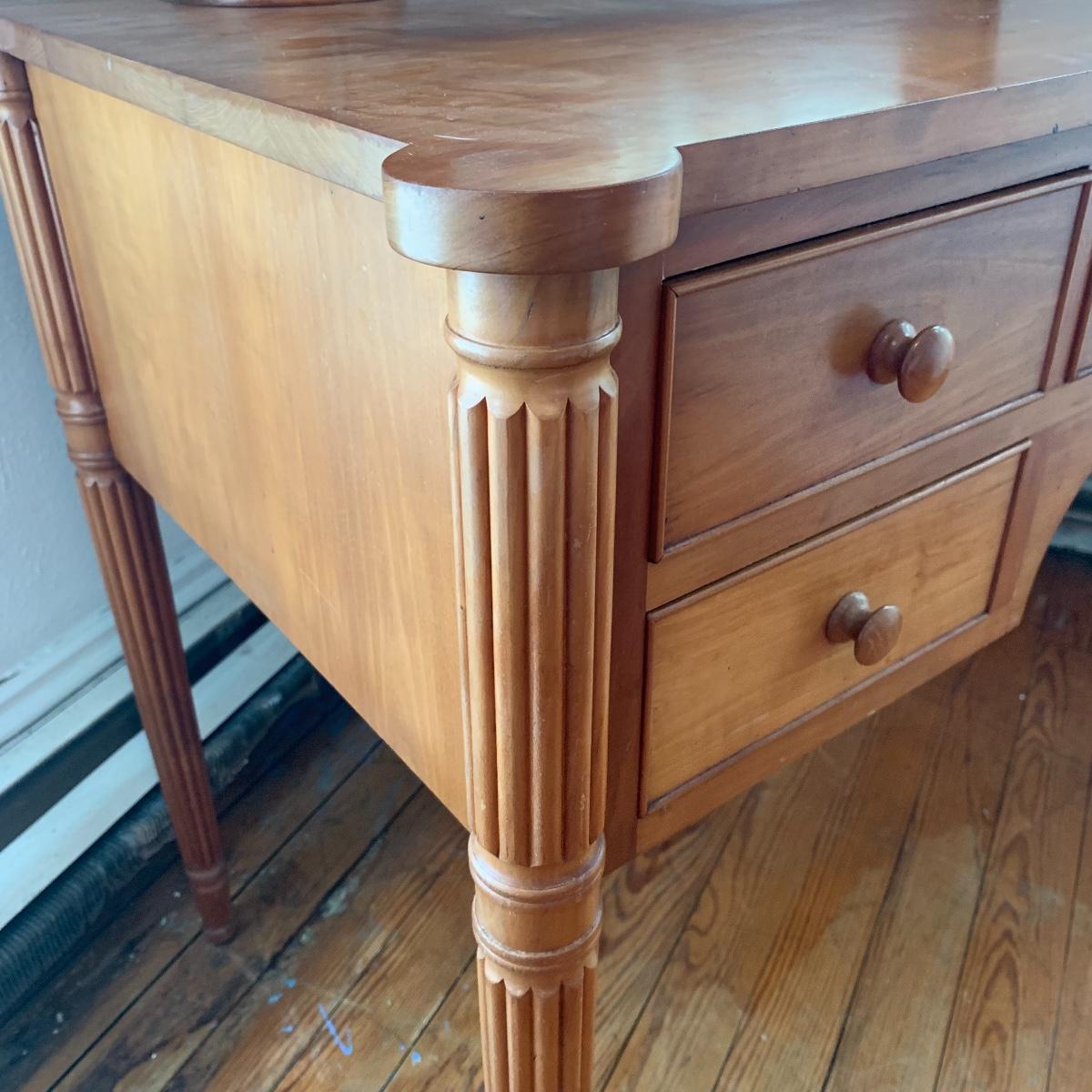 This lot includes a wooden dressing table with an attached mirror and a matching upholstered bench. The table has five dovetailed drawers and long carved legs. This detail matches the mirror base and the legs on the bench. The table measures 45” x 24.5” x 32.5”. The mirror measures 27” x 31”. Including the mirror, the whole unit is 65” tall. The mirror has cardboard backing. There are some marks on the surface of the table and a bit of mildew in the drawers. The bench measures 22.5” x 14.5” x 19.5”. Local pickup only. Please note that the winning bidder will need to move the items in this lot from the second floor of the house.