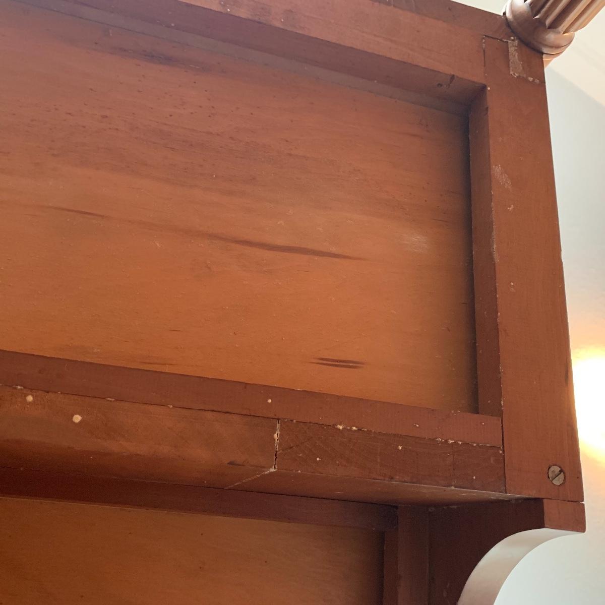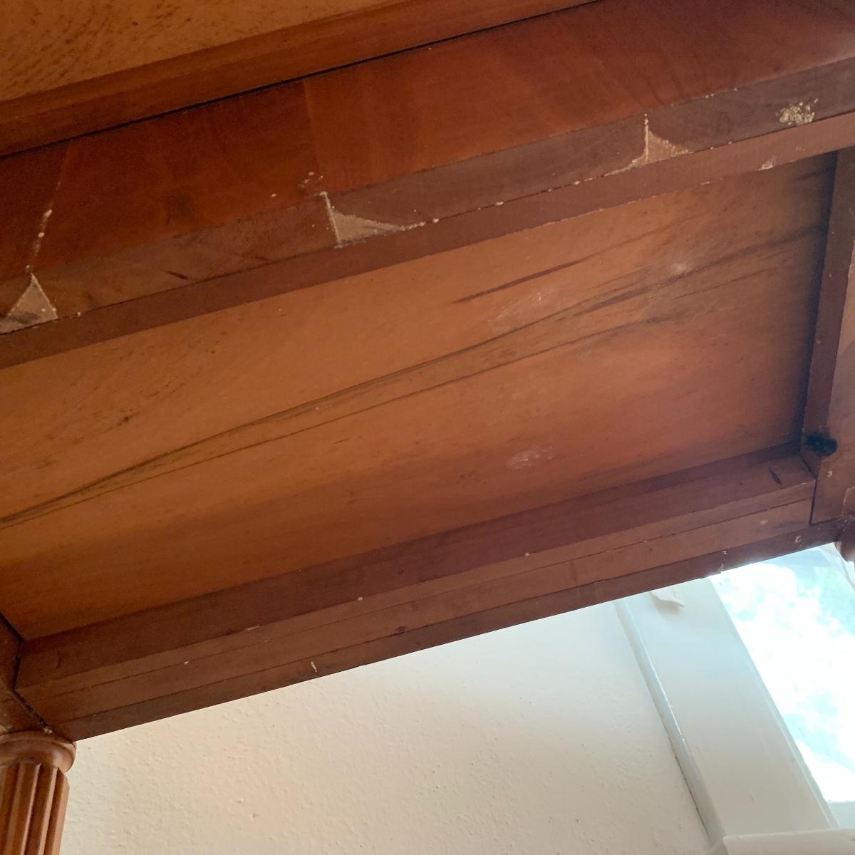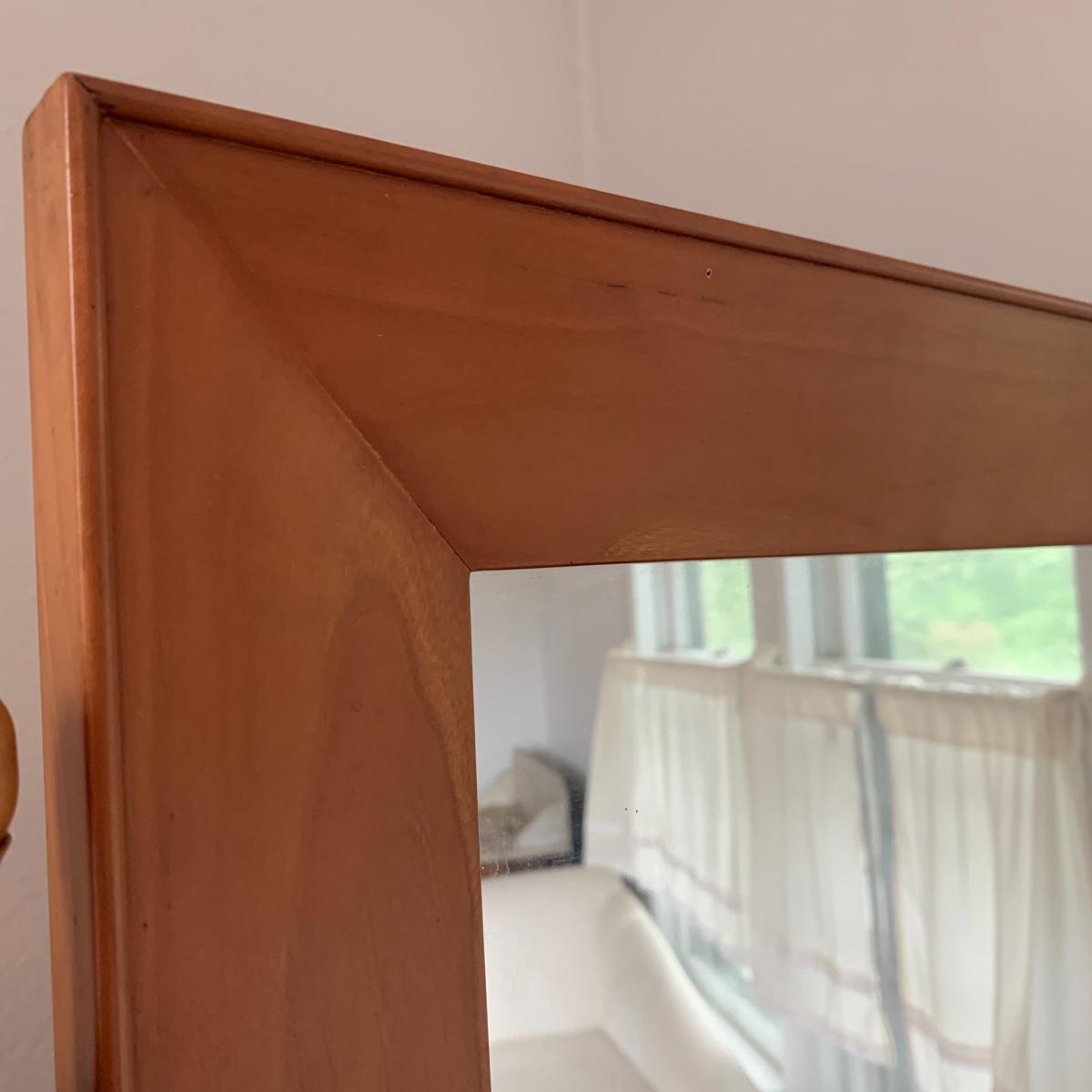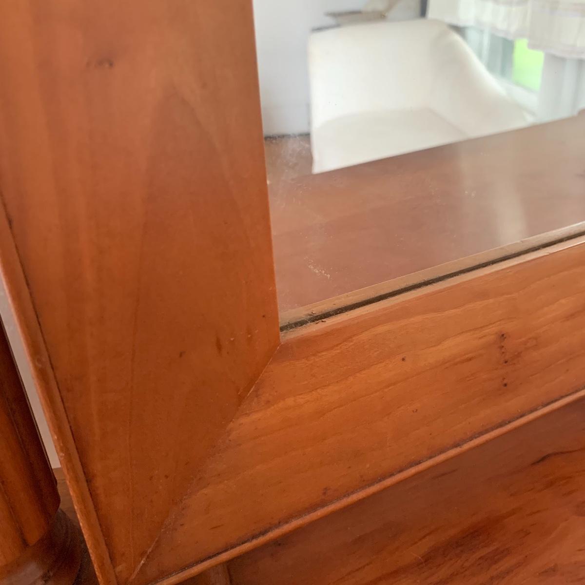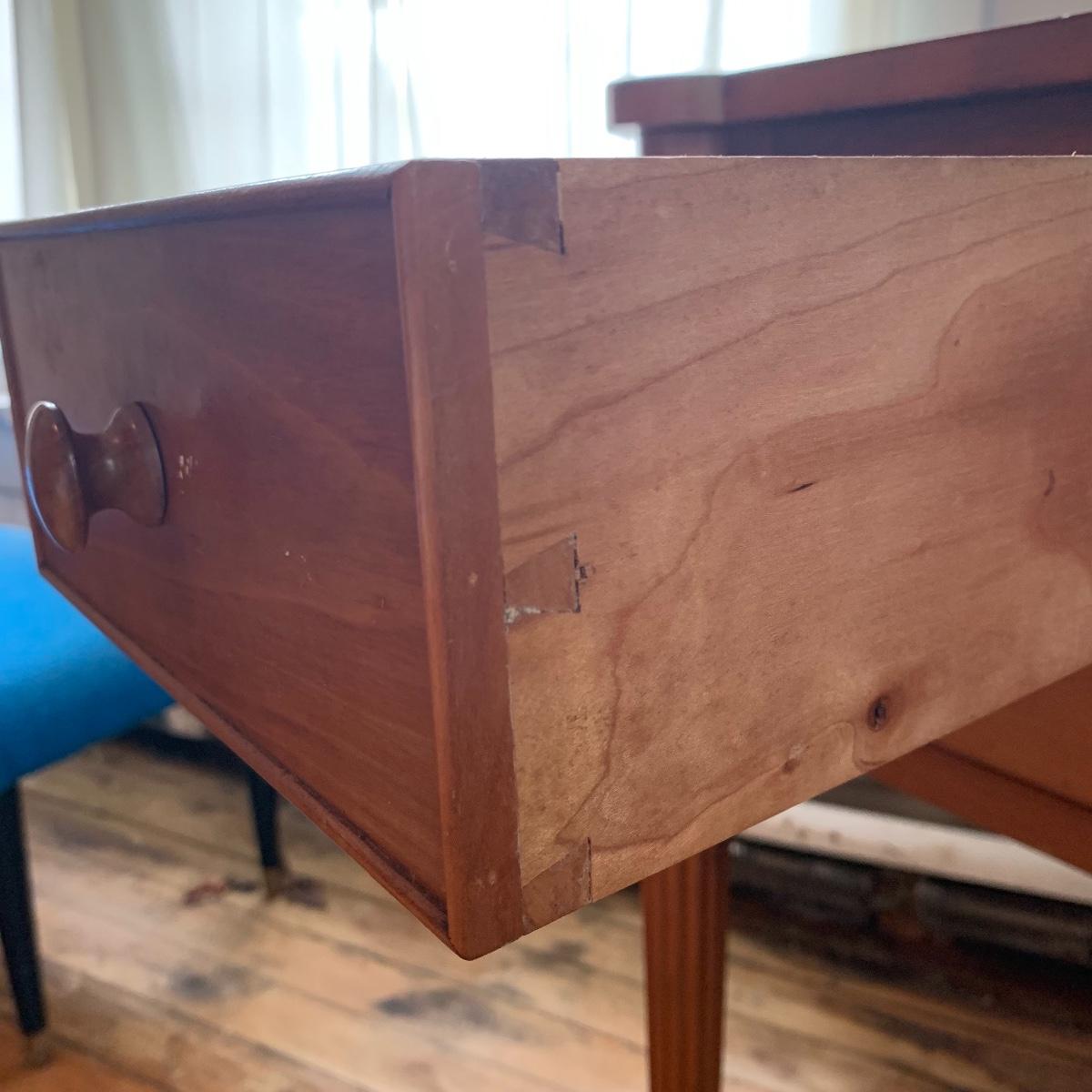This lot includes a wooden dressing table with an attached mirror and a matching upholstered bench. The table has five dovetailed drawers and long carved legs. This detail matches the mirror base and the legs on the bench. The table measures 45” x 24.5” x 32.5”. The mirror measures 27” x 31”. Including the mirror, the whole unit is 65” tall. The mirror has cardboard backing. There are some marks on the surface of the table and a bit of mildew in the drawers. The bench measures 22.5” x 14.5” x 19.5”. Local pickup only. Please note that the winning bidder will need to move the items in this lot from the second floor of the house.